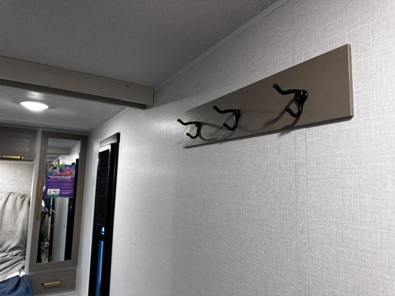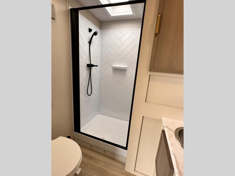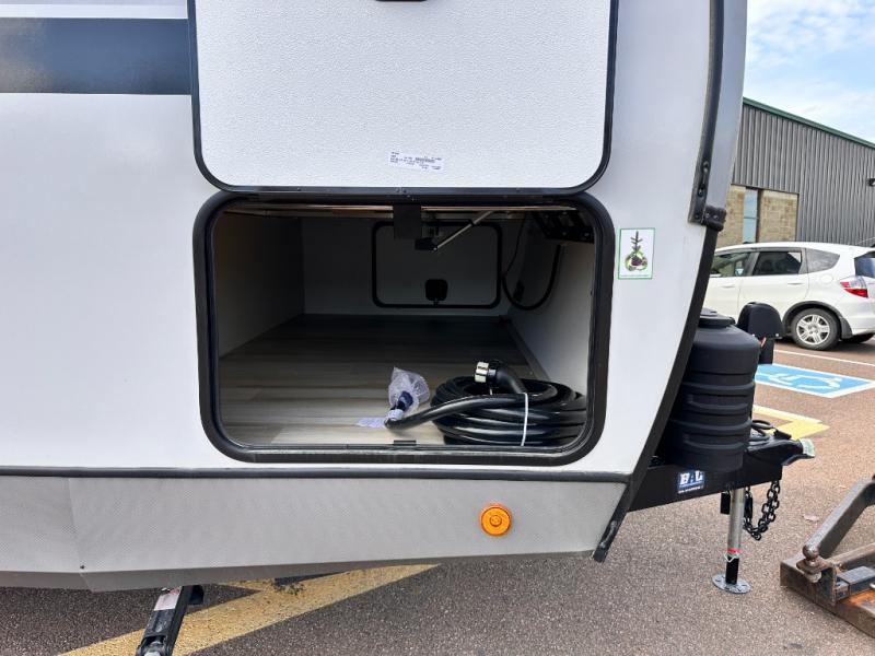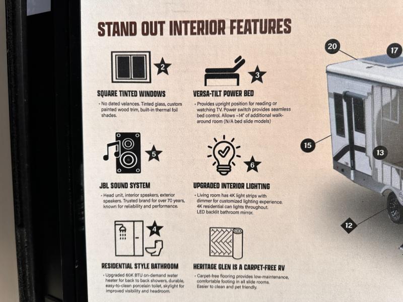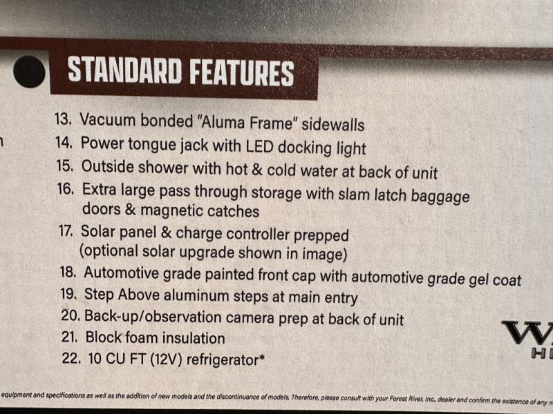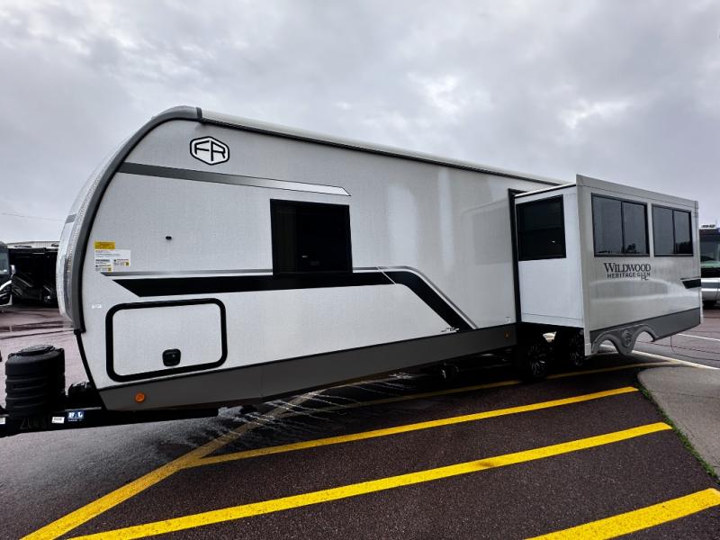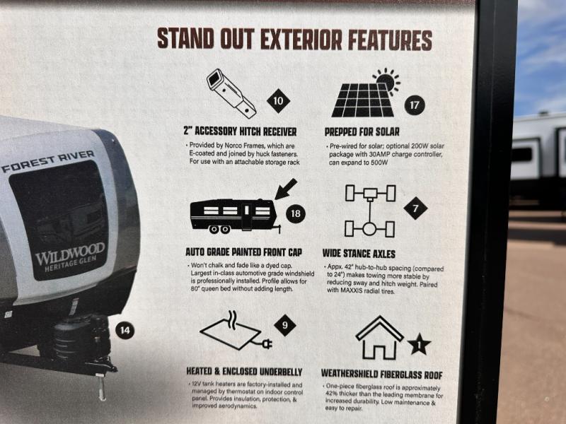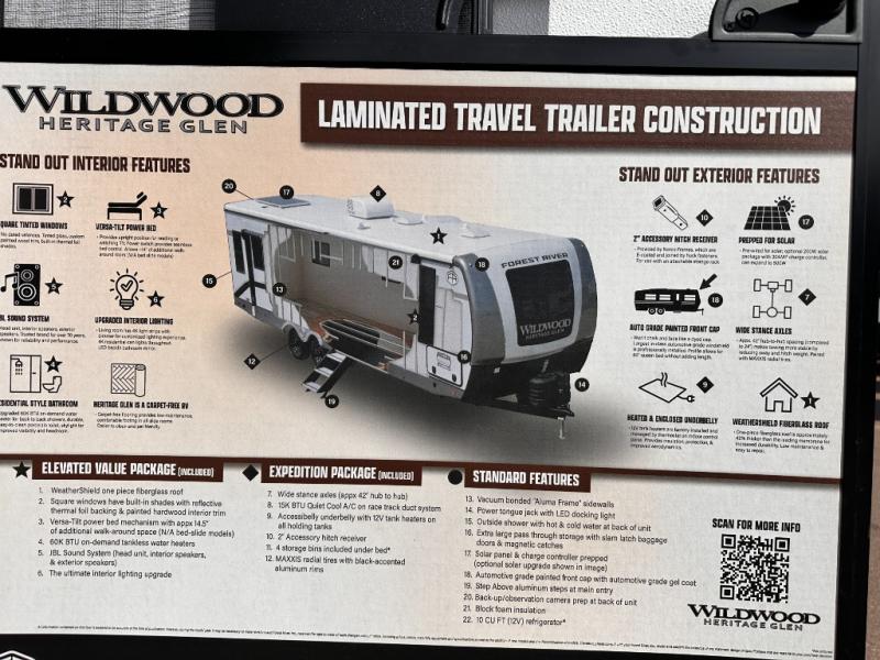 The Wildwood Heritage Glen Hyper-Lyte travel trailer by Forest River offers stability with a wide stance axle system, easy setup with a power tongue jack with an LED docking light, and safe entry with the Step Above aluminum entry steps. The interior includes Temple Cherry cabinetry with matte gold hardware, hidden hinges on the cabinet doors, and a residential single bowl undermount sink. You will also find a back-up camera prep and solar prep, an outdoor shower, Maxxis radial tires, and many more exterior conveniences.