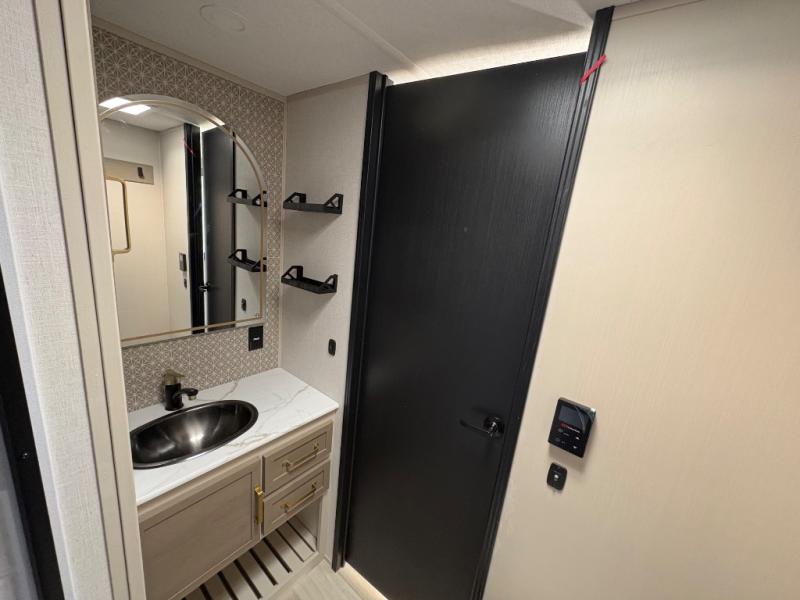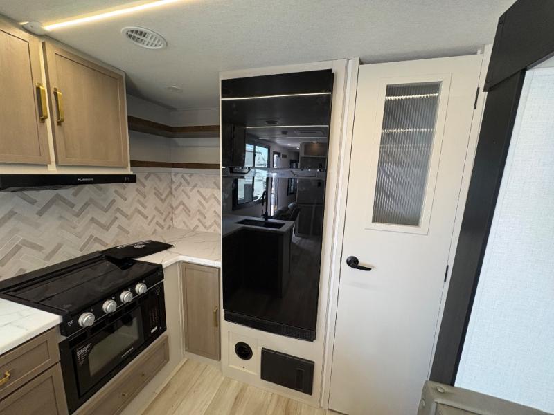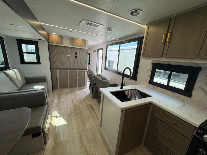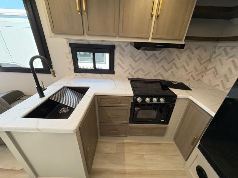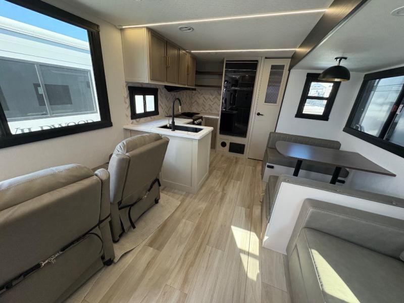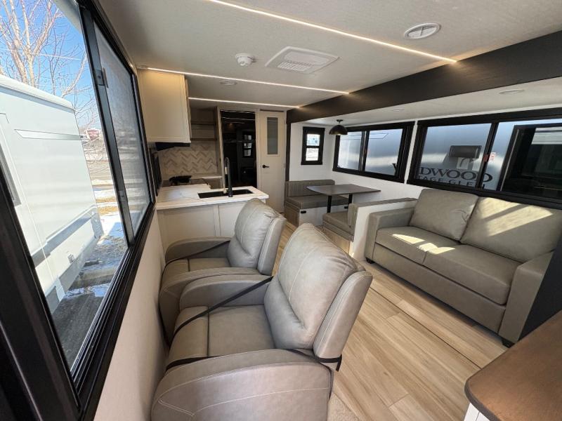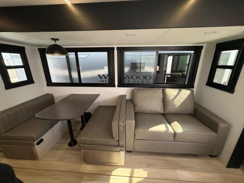 With any Wildwood Heritage Glen fifth wheel by Forest River, the quality construction, attention to detail and design along with a bright and welcoming interior allows you to relax in comfort. You'll love the high-end solid surface countertops included in the Elevated Value Package, along with a JBL sound system, full-length barreled ceilings, and an ultimate interior lighting upgrade. The included Expedition Package features an Accesibelly underbelly panel with 12V tank heaters, nitrogen-filled tires with aluminum rims, and a spacious 30" wide main entry door with a window. The Lippert On-The-Go ladder prep and back-up camera prep let you customize your fifth wheel even more, and the LED awning, front cap, marker and taillights will make it easier than ever to set up camp!