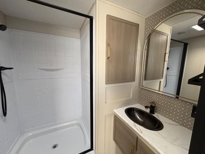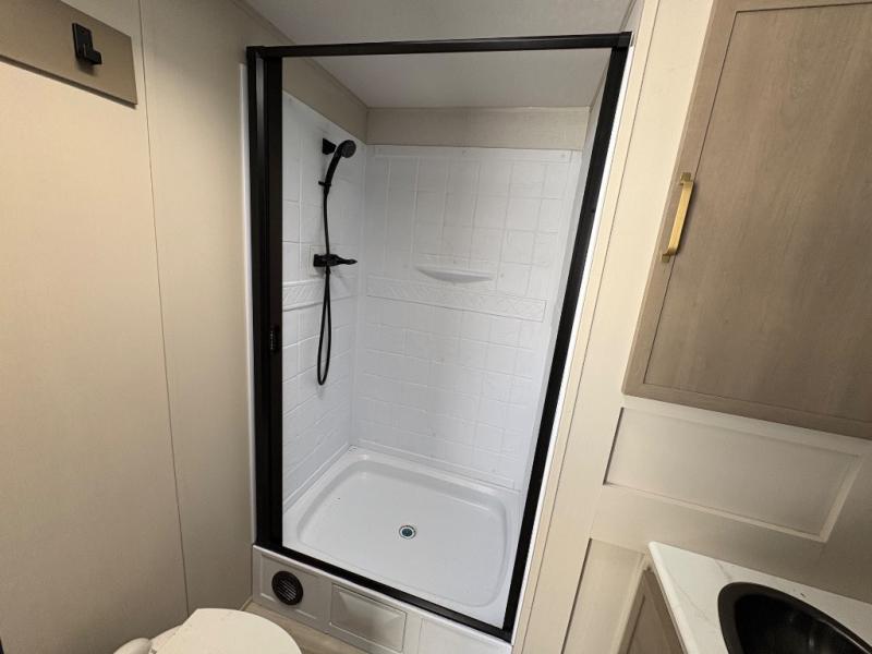 Whether you enjoy being outside or inside, this Wildwood Heritage Glen fifth wheel gives you the best of both! Imagine relaxing in a chair or on the tri-fold sofa and being able to look out panoramic windows at the scenery. Or, you might like to watch a show on the 50" LED TV with a fireplace below, and you can dine at the table and chairs that allows you to move the chairs if needed. The 16-cubic foot 12V refrigerator next to the pantry will allow you to stock up on ingredients and cold beverages for a long trip, and you will appreciate the custom king bed slide and the residential walk-in shower after being outside all day, even if just under the 13' awning. There is plenty of storage in the master bedroom and throughout, plus the XL Texas size pass-through compartment will surely come in handy for your charcoal, outdoor games, and such.