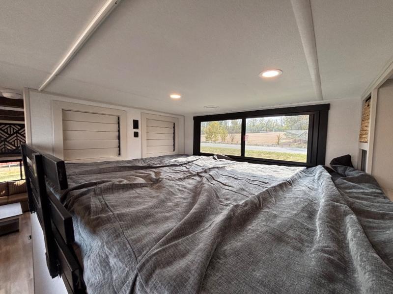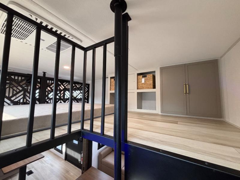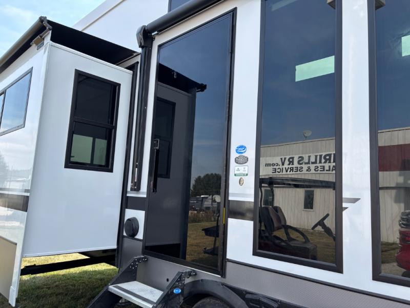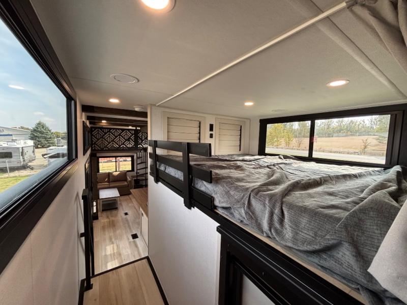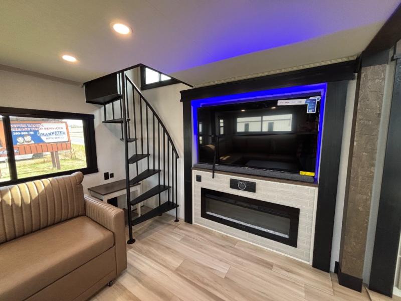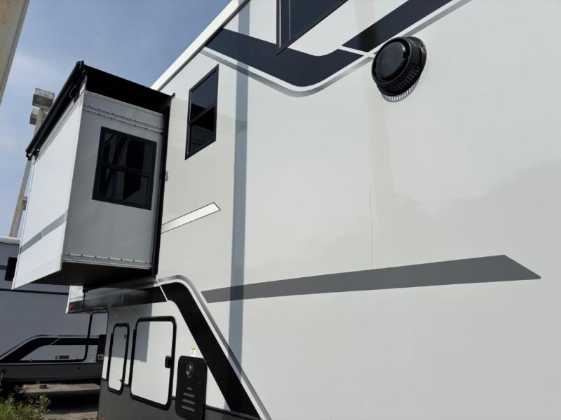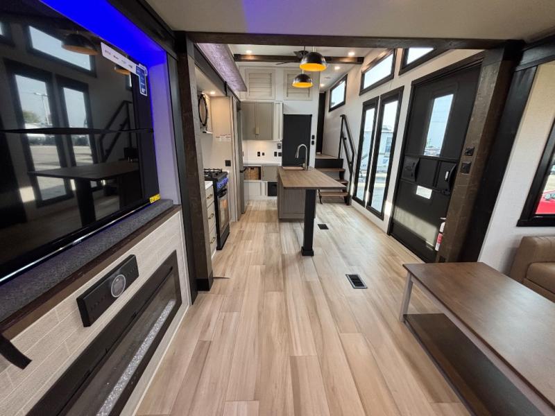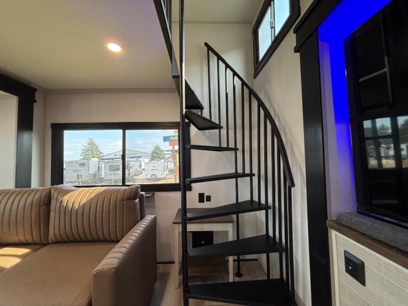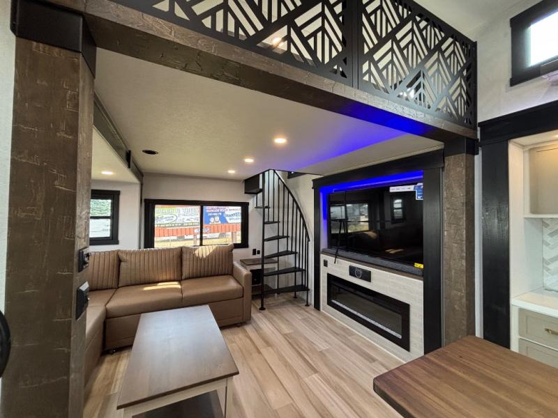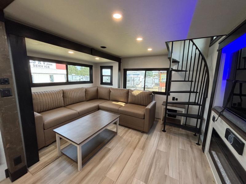 Introducing a new RV of its kind, the ROOST43 is a destination-style fifth wheel you are sure to love! There are two levels, making it feel more like home, and you can sleep six to eight each night. The master bedroom includes a custom king bed slide out, a 32" TV and fireplace, a desk/vanity, plus a half bath for convenience. A custom king-size bed is also found in the front loft, and there are storage cubbies plus a coax/110V outlet here to plug in chargers or a laptop. The second loft in the back includes spiral stairs, two bunk mats, a wardrobe, and cubby cubes here also for your guests' things. Some of the stand-out features you'll find on the first level are the sectional sofa with a coffee table, an entertainment center with a 65" TV, a kitchen island with five chairs, and a fully-equipped kitchen. The 20 cu. ft. 12V refrigerator and pull-out pantry will let you stock up on food, and the kitchen hutch will be perfect for nice dishes. The full bath on this model is one to remember; there is a one-piece fiberglass shower with a teak seat, a flip-up shelf and a washer/dryer, a backlit mirror, and more. And we haven't even touched on the exterior features, such as the pull-out tray, outdoor refrigerators, 20' awning, and more!