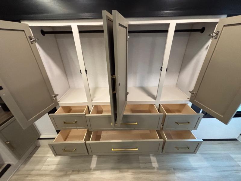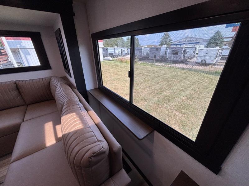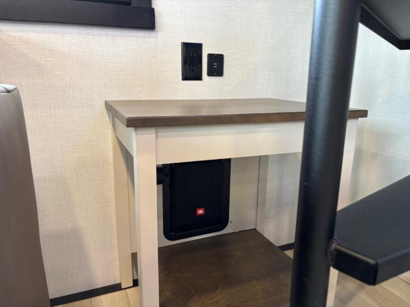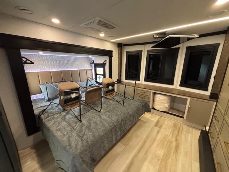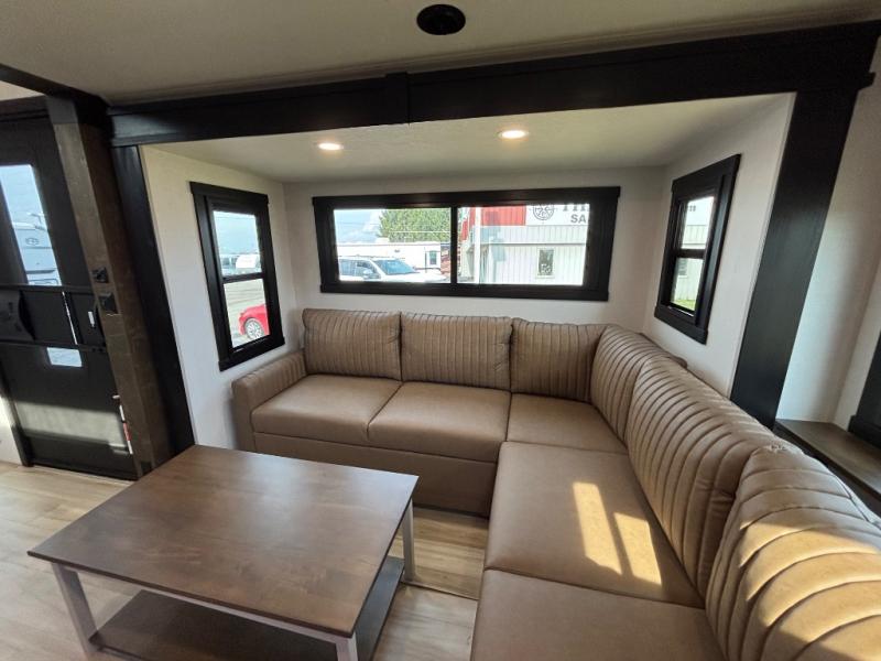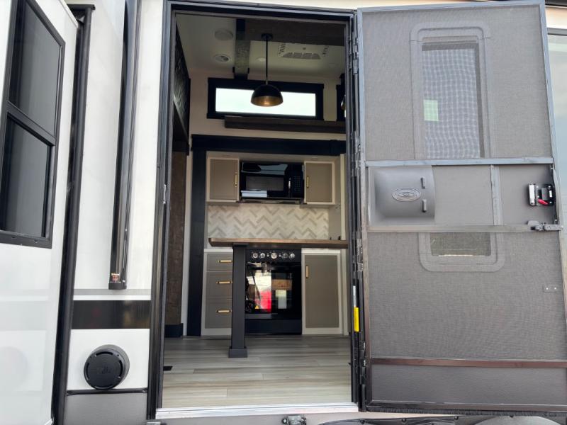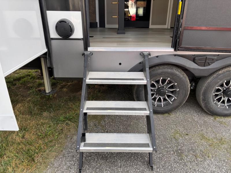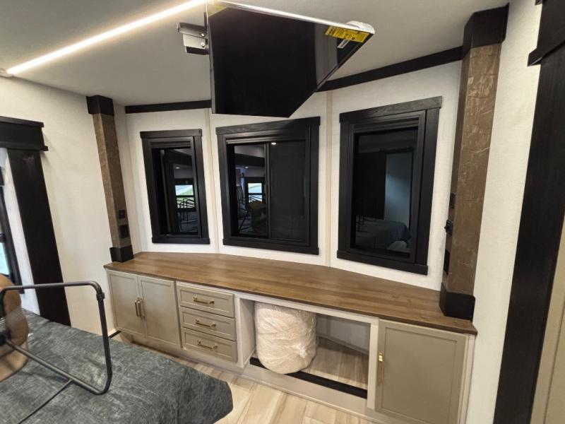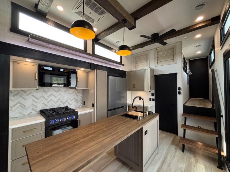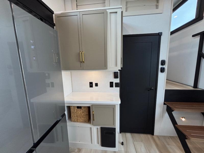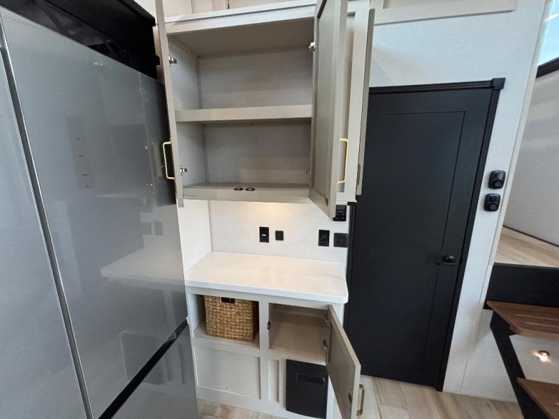 Introducing a new RV of its kind, the ROOST43 is a destination-style fifth wheel you are sure to love! There are two levels, making it feel more like home, and you can sleep six to eight each night. The master bedroom includes a custom king bed slide out, a 32" TV and fireplace, a desk/vanity, plus a half bath for convenience. A custom king-size bed is also found in the front loft, and there are storage cubbies plus a coax/110V outlet here to plug in chargers or a laptop. The second loft in the back includes spiral stairs, two bunk mats, a wardrobe, and cubby cubes here also for your guests' things. Some of the stand-out features you'll find on the first level are the sectional sofa with a coffee table, an entertainment center with a 65" TV, a kitchen island with five chairs, and a fully-equipped kitchen. The 20 cu. ft. 12V refrigerator and pull-out pantry will let you stock up on food, and the kitchen hutch will be perfect for nice dishes. The full bath on this model is one to remember; there is a one-piece fiberglass shower with a teak seat, a flip-up shelf and a washer/dryer, a backlit mirror, and more. And we haven't even touched on the exterior features, such as the pull-out tray, outdoor refrigerators, 20' awning, and more!