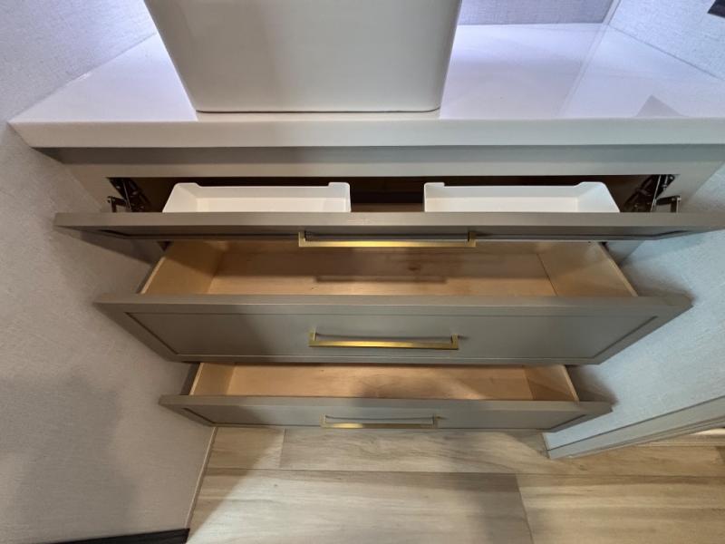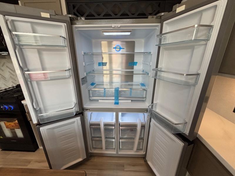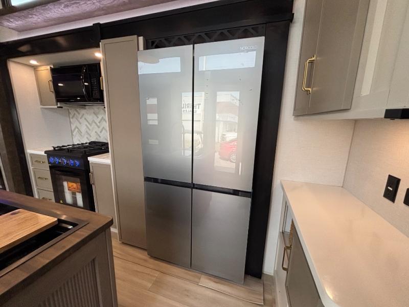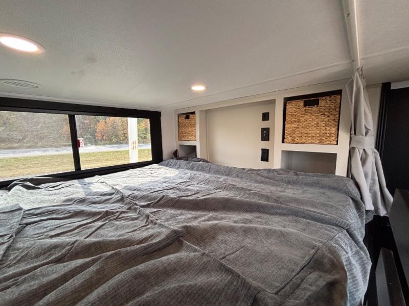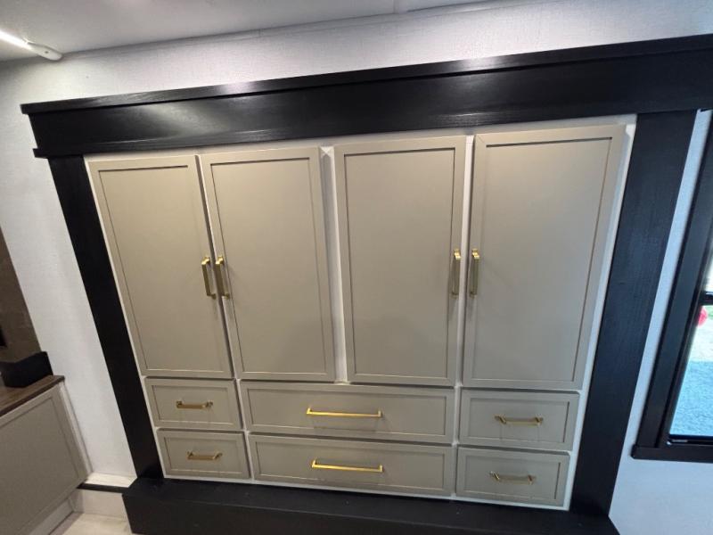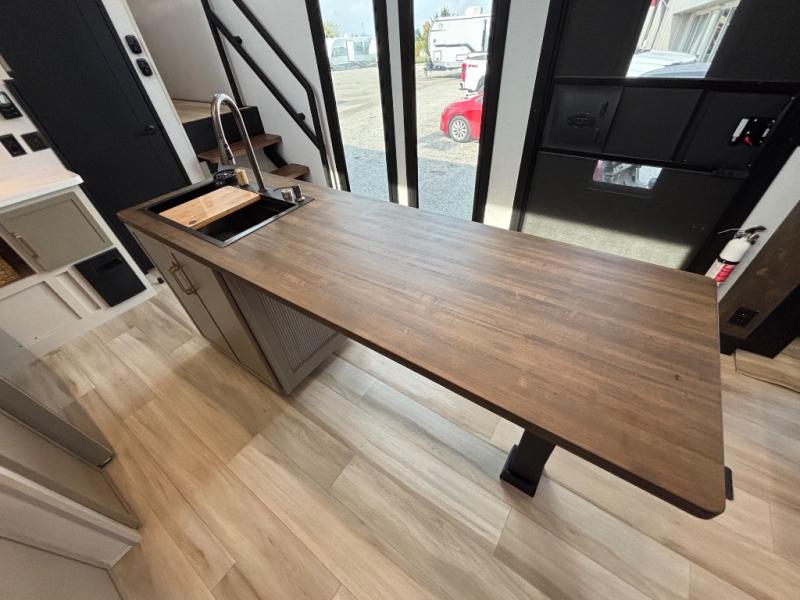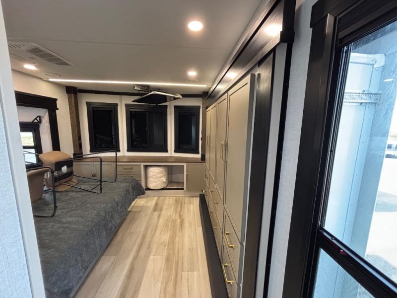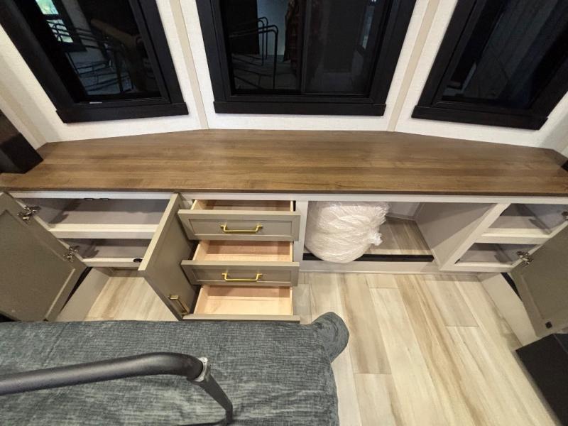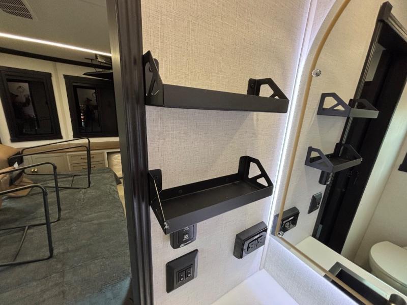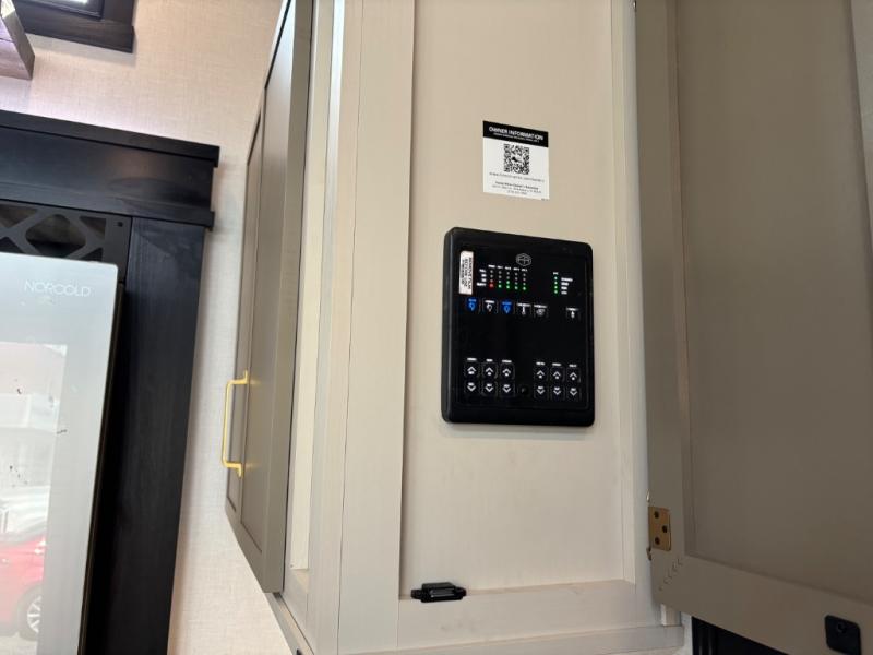 Introducing a new RV of its kind, the ROOST43 is a destination-style fifth wheel you are sure to love! There are two levels, making it feel more like home, and you can sleep six to eight each night. The master bedroom includes a custom king bed slide out, a 32" TV and fireplace, a desk/vanity, plus a half bath for convenience. A custom king-size bed is also found in the front loft, and there are storage cubbies plus a coax/110V outlet here to plug in chargers or a laptop. The second loft in the back includes spiral stairs, two bunk mats, a wardrobe, and cubby cubes here also for your guests' things. Some of the stand-out features you'll find on the first level are the sectional sofa with a coffee table, an entertainment center with a 65" TV, a kitchen island with five chairs, and a fully-equipped kitchen. The 20 cu. ft. 12V refrigerator and pull-out pantry will let you stock up on food, and the kitchen hutch will be perfect for nice dishes. The full bath on this model is one to remember; there is a one-piece fiberglass shower with a teak seat, a flip-up shelf and a washer/dryer, a backlit mirror, and more. And we haven't even touched on the exterior features, such as the pull-out tray, outdoor refrigerators, 20' awning, and more!