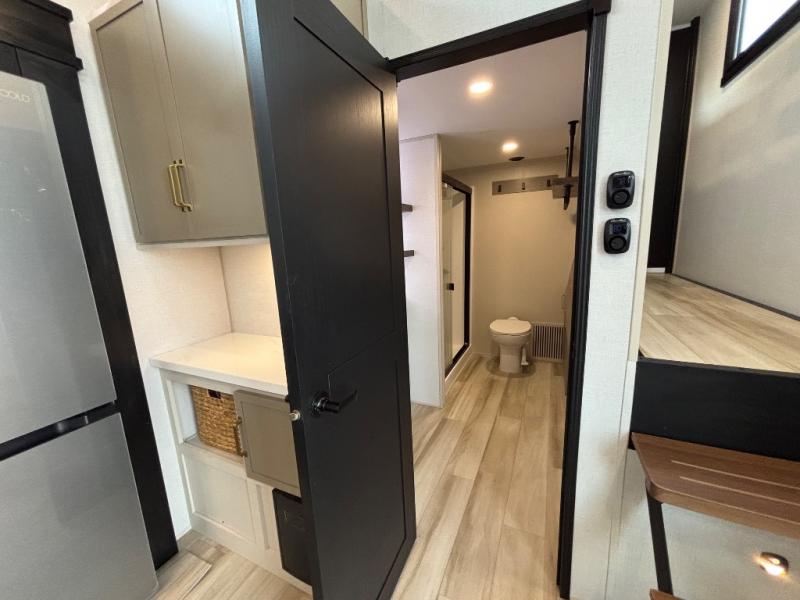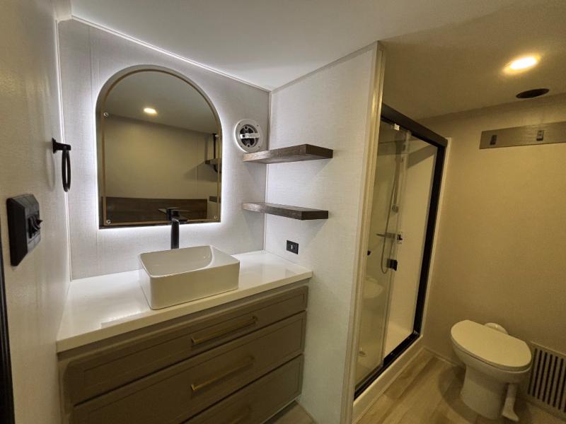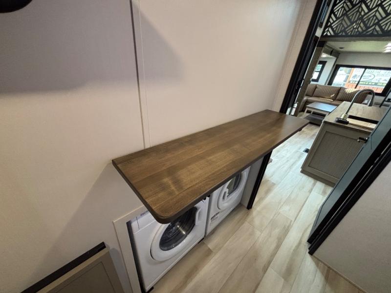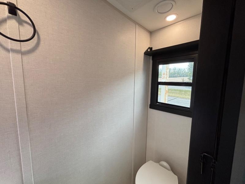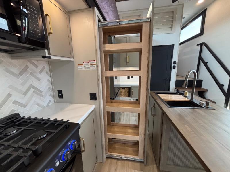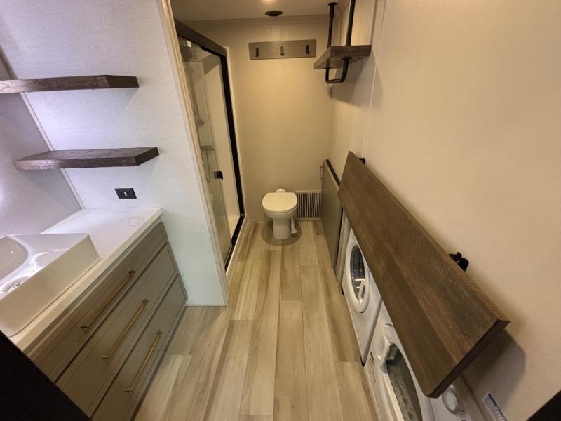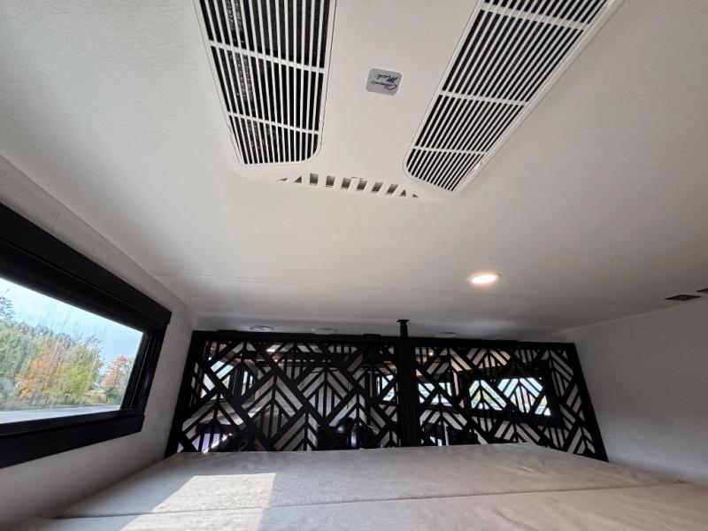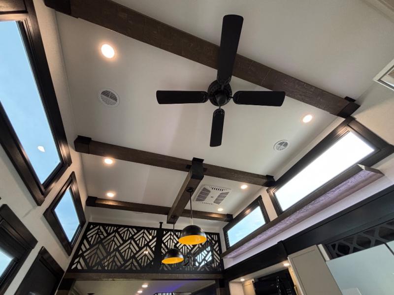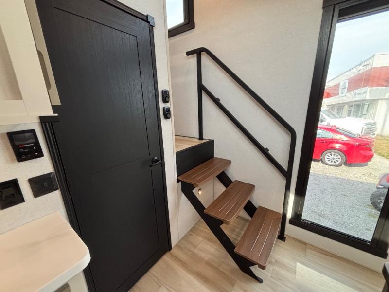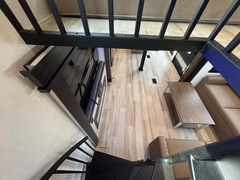 The Wildwood Heritage Glen ROOST fifth wheels resemble a destination trailer that will be giving you residential vibes! The premium Alley Grey high-gloss gel coat fiberglass sidewalls are ultra sleek, and the flat pitched roof sheds water to the off-door side for added comfort. A Race Track A/C duct system provides maximum cooling, and the AccessiBelly underbelly with 12V tank heaters on all holding tanks will help extend your camping season. There are high-end solid surface and maple-stained wood countertops inside, along with residential-inspired wood door casings, and 6' 8" clearance in all rooms, excluding lofts. Additional features include a Gun Metal grey kitchen sink, backlit mirrors in the bathrooms, motion sensor lights by the spiral stair cases, and back up camera prep if you want the option to make parking easier than ever.