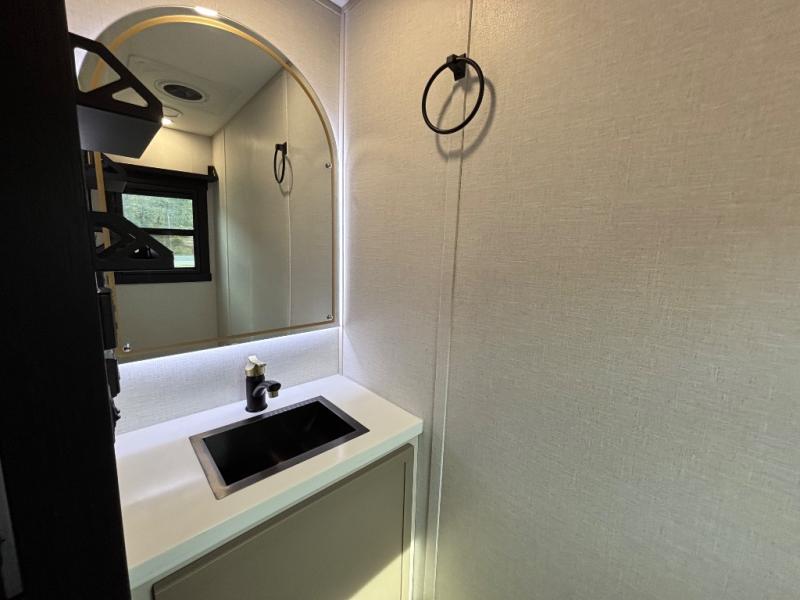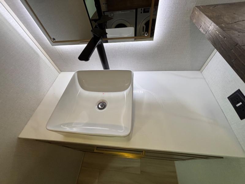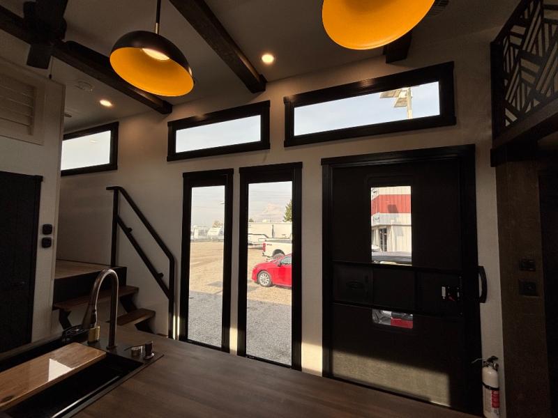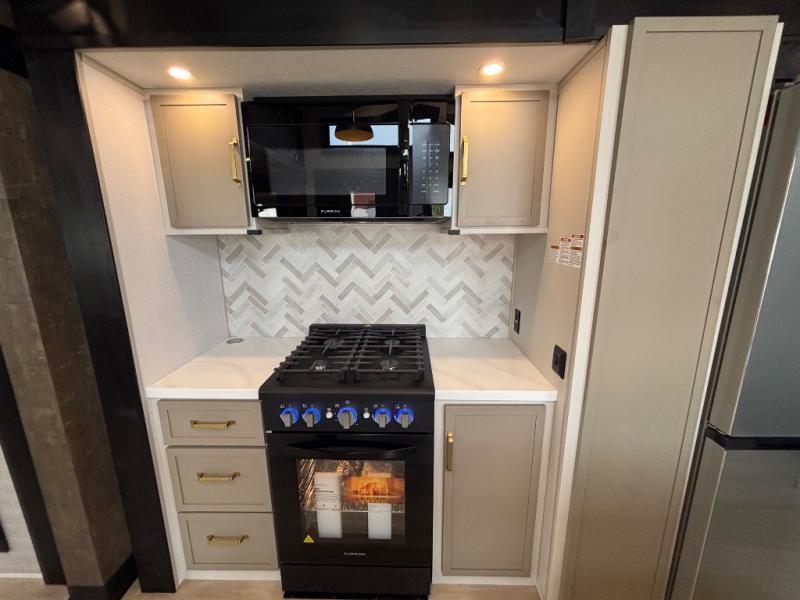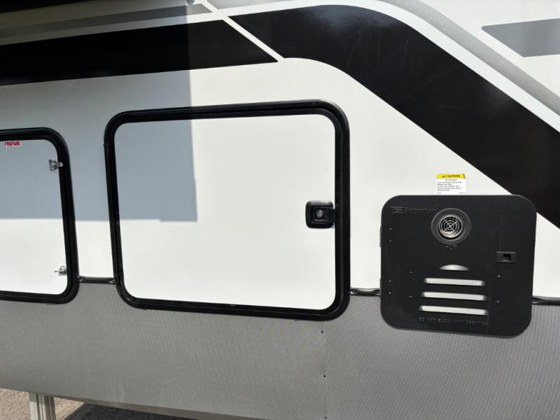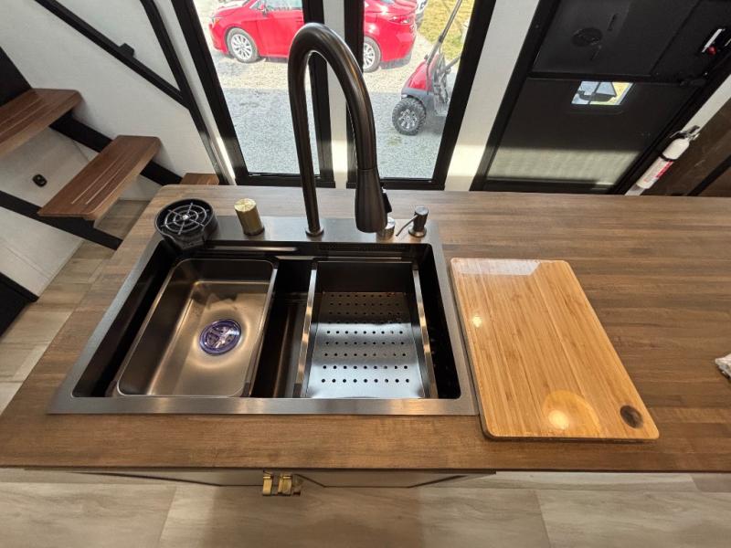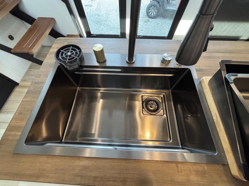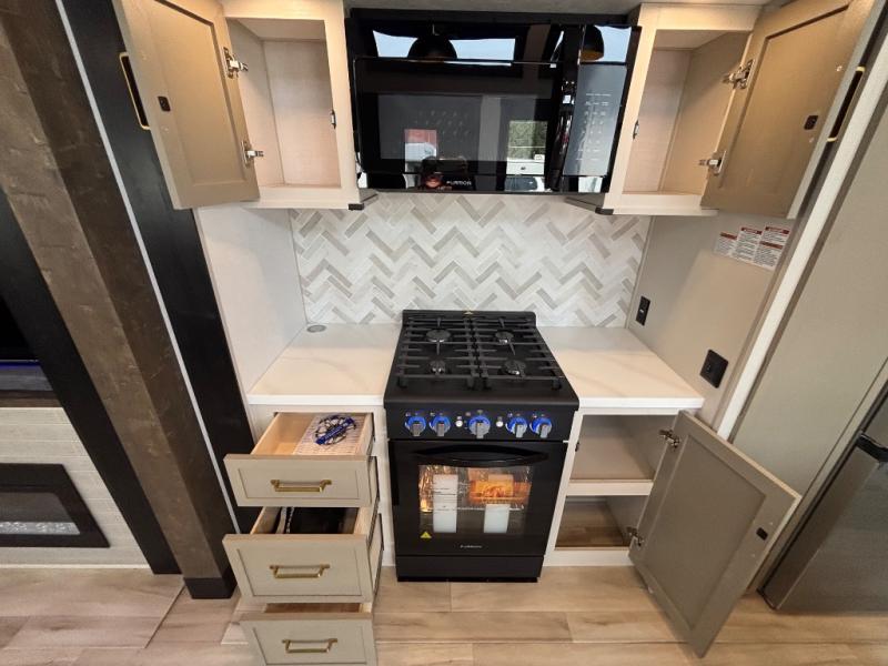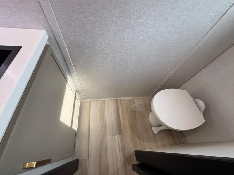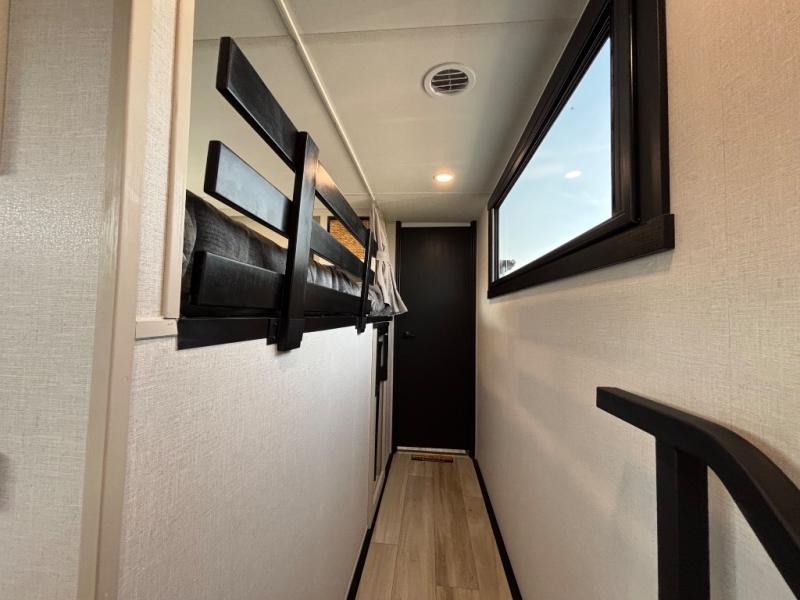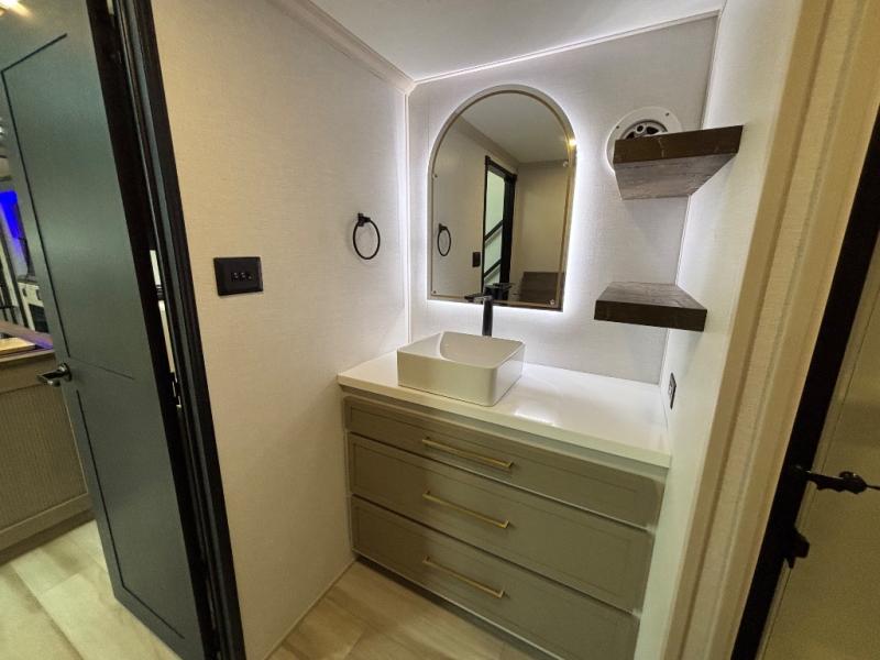 The Wildwood Heritage Glen ROOST fifth wheels resemble a destination trailer that will be giving you residential vibes! The premium Alley Grey high-gloss gel coat fiberglass sidewalls are ultra sleek, and the flat pitched roof sheds water to the off-door side for added comfort. A Race Track A/C duct system provides maximum cooling, and the AccessiBelly underbelly with 12V tank heaters on all holding tanks will help extend your camping season. There are high-end solid surface and maple-stained wood countertops inside, along with residential-inspired wood door casings, and 6' 8" clearance in all rooms, excluding lofts. Additional features include a Gun Metal grey kitchen sink, backlit mirrors in the bathrooms, motion sensor lights by the spiral stair cases, and back up camera prep if you want the option to make parking easier than ever.