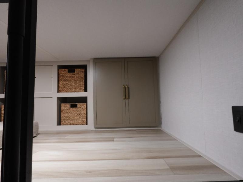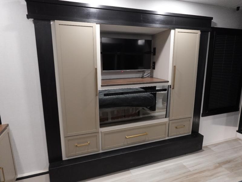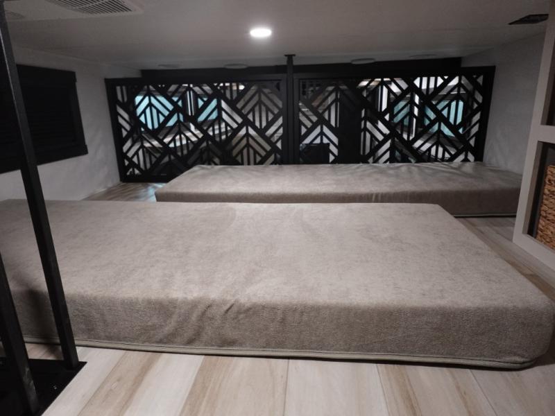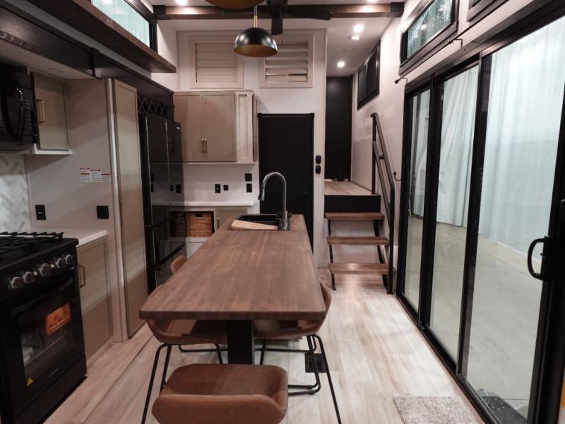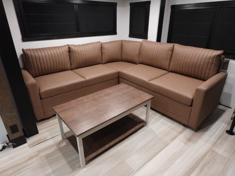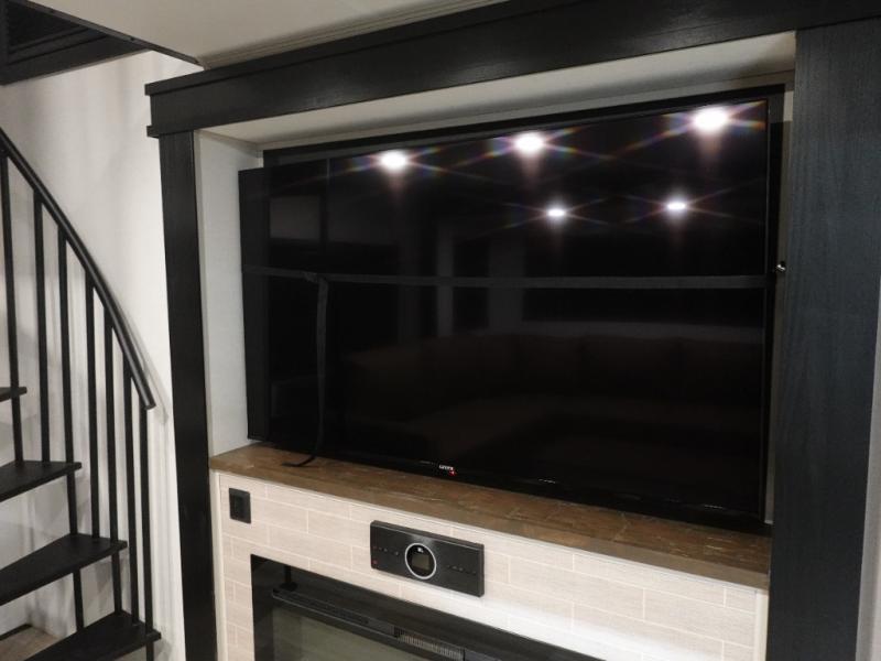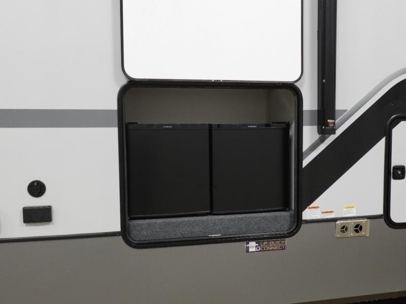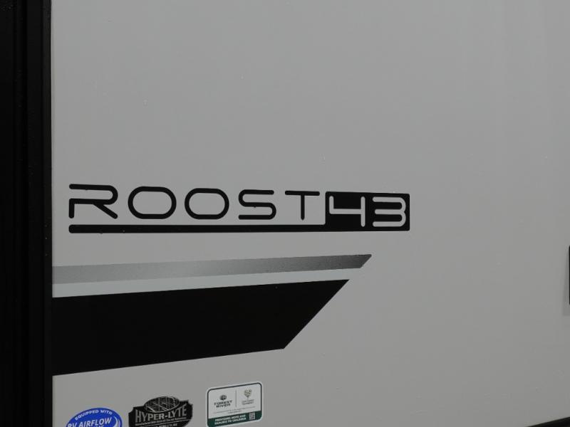 Introducing a new RV of its kind, the ROOST43 is a destination-style fifth wheel you are sure to love! There are two levels, making it feel more like home, and you can sleep six to eight each night. The master bedroom includes a custom king bed slide out, a 32" TV and fireplace, a desk/vanity, plus a half bath for convenience. A custom king-size bed is also found in the front loft, and there are storage cubbies plus a coax/110V outlet here to plug in chargers or a laptop. The second loft in the back includes spiral stairs, two bunk mats, a wardrobe, and cubby cubes here also for your guests' things. Some of the stand-out features you'll find on the first level are the sectional sofa with a coffee table, an entertainment center with a 65" TV, a kitchen island with five chairs, and a fully-equipped kitchen. The 20 cu. ft. 12V refrigerator and pull-out pantry will let you stock up on food, and the kitchen hutch will be perfect for nice dishes. The full bath on this model is one to remember; there is a one-piece fiberglass shower with a teak seat, a flip-up shelf and a washer/dryer, a backlit mirror, and more. And we haven't even touched on the exterior features, such as the pull-out tray, outdoor refrigerators, 20' awning, and more!