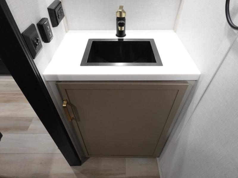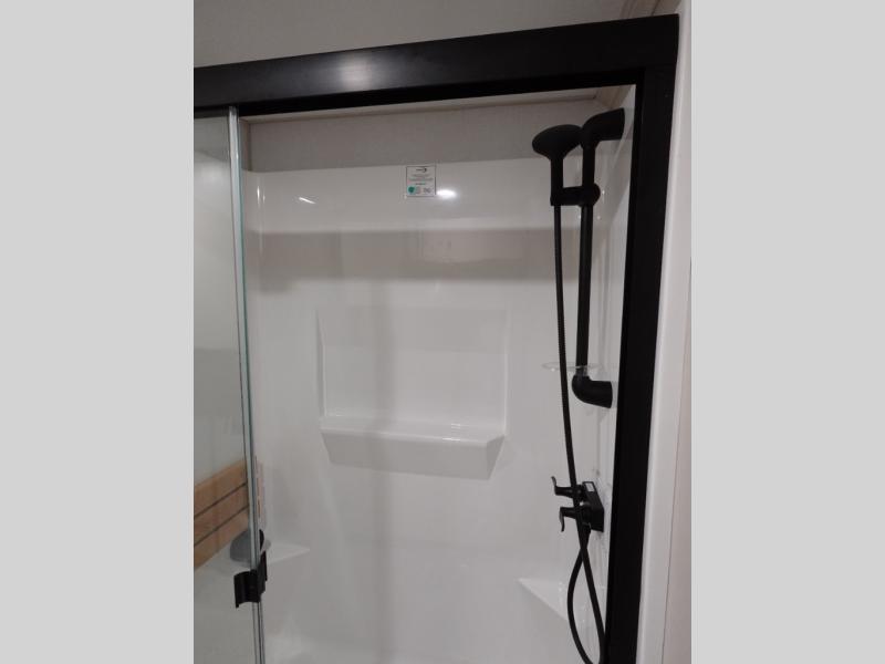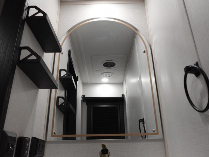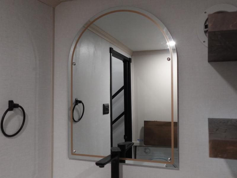The Wildwood Heritage Glen ROOST fifth wheels resemble a destination trailer that will be giving you residential vibes! The premium Alley Grey high-gloss gel coat fiberglass sidewalls are ultra sleek, and the flat pitched roof sheds water to the off-door side for added comfort. A Race Track A/C duct system provides maximum cooling, and the AccessiBelly underbelly with 12V tank heaters on all holding tanks will help extend your camping season. There are high-end solid surface and maple-stained wood countertops inside, along with residential-inspired wood door casings, and 6' 8" clearance in all rooms, excluding lofts. Additional features include a Gun Metal grey kitchen sink, backlit mirrors in the bathrooms, motion sensor lights by the spiral stair cases, and back up camera prep if you want the option to make parking easier than ever.