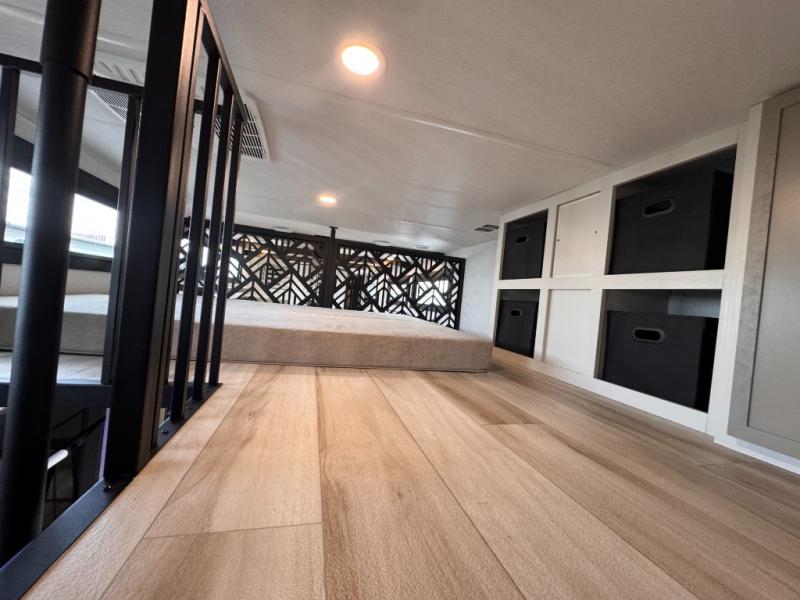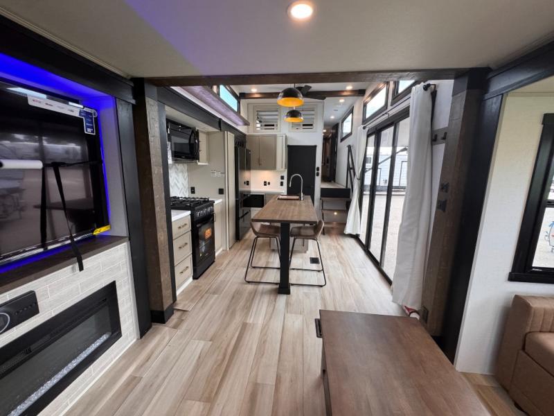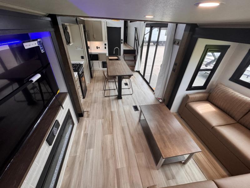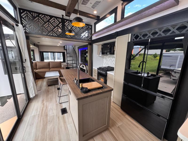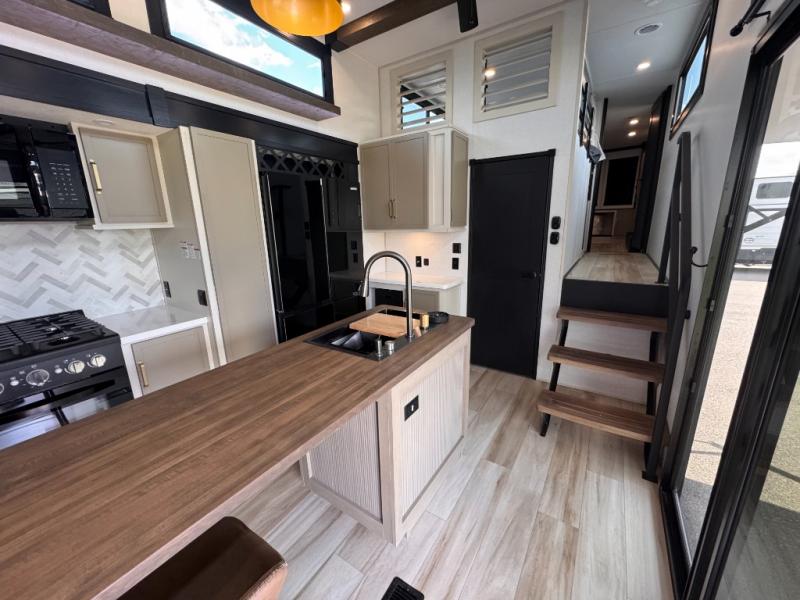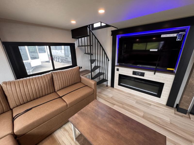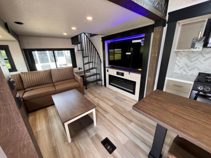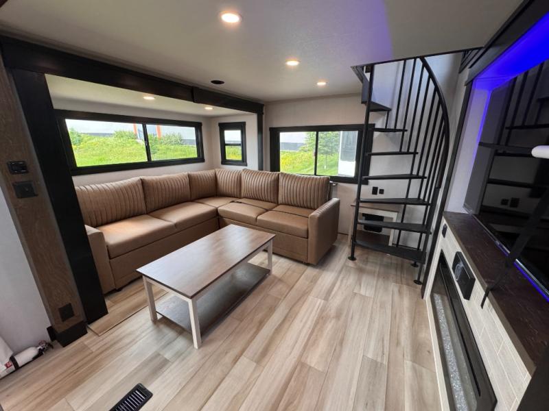 Introducing a new RV of its kind, the ROOST43 is a destination-style fifth wheel you are sure to love! There are two levels, making it feel more like home, and you can sleep six to eight each night. The master bedroom includes a custom king bed slide out, a 32" TV and fireplace, a desk/vanity, plus a half bath for convenience. A custom king-size bed is also found in the front loft, and there are storage cubbies plus a coax/110V outlet here to plug in chargers or a laptop. The second loft in the back includes spiral stairs, two bunk mats, a wardrobe, and cubby cubes here also for your guests' things. Some of the stand-out features you'll find on the first level are the sectional sofa with a coffee table, an entertainment center with a 65" TV, a kitchen island with five chairs, and a fully-equipped kitchen. The 20 cu. ft. 12V refrigerator and pull-out pantry will let you stock up on food, and the kitchen hutch will be perfect for nice dishes. The full bath on this model is one to remember; there is a one-piece fiberglass shower with a teak seat, a flip-up shelf and a washer/dryer, a backlit mirror, and more. And we haven't even touched on the exterior features, such as the pull-out tray, outdoor refrigerators, 20' awning, and more!