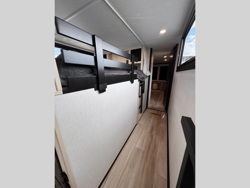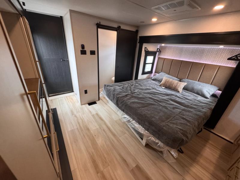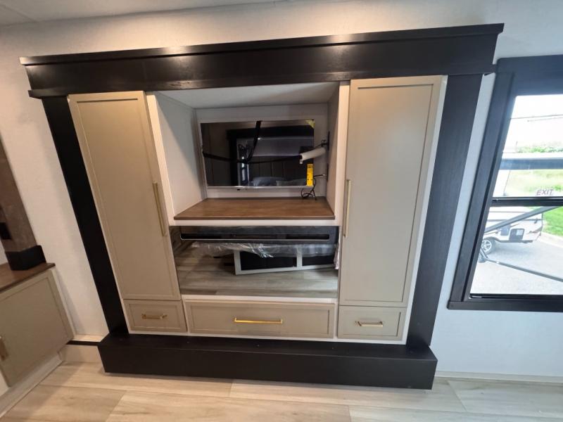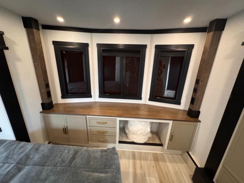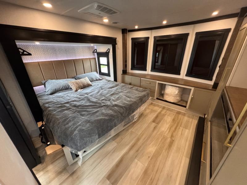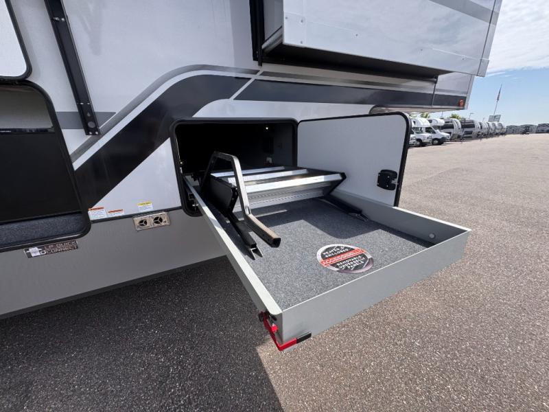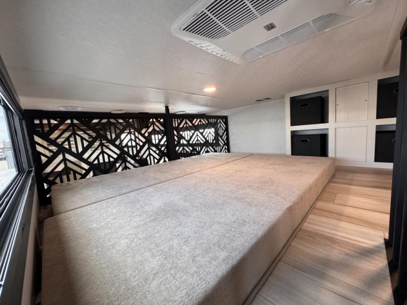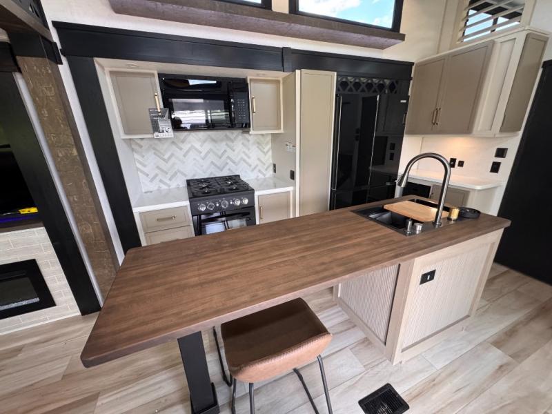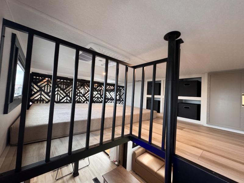 Introducing a new RV of its kind, the ROOST43 is a destination-style fifth wheel you are sure to love! There are two levels, making it feel more like home, and you can sleep six to eight each night. The master bedroom includes a custom king bed slide out, a 32" TV and fireplace, a desk/vanity, plus a half bath for convenience. A custom king-size bed is also found in the front loft, and there are storage cubbies plus a coax/110V outlet here to plug in chargers or a laptop. The second loft in the back includes spiral stairs, two bunk mats, a wardrobe, and cubby cubes here also for your guests' things. Some of the stand-out features you'll find on the first level are the sectional sofa with a coffee table, an entertainment center with a 65" TV, a kitchen island with five chairs, and a fully-equipped kitchen. The 20 cu. ft. 12V refrigerator and pull-out pantry will let you stock up on food, and the kitchen hutch will be perfect for nice dishes. The full bath on this model is one to remember; there is a one-piece fiberglass shower with a teak seat, a flip-up shelf and a washer/dryer, a backlit mirror, and more. And we haven't even touched on the exterior features, such as the pull-out tray, outdoor refrigerators, 20' awning, and more!