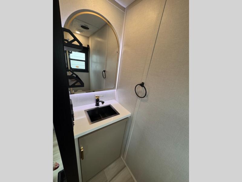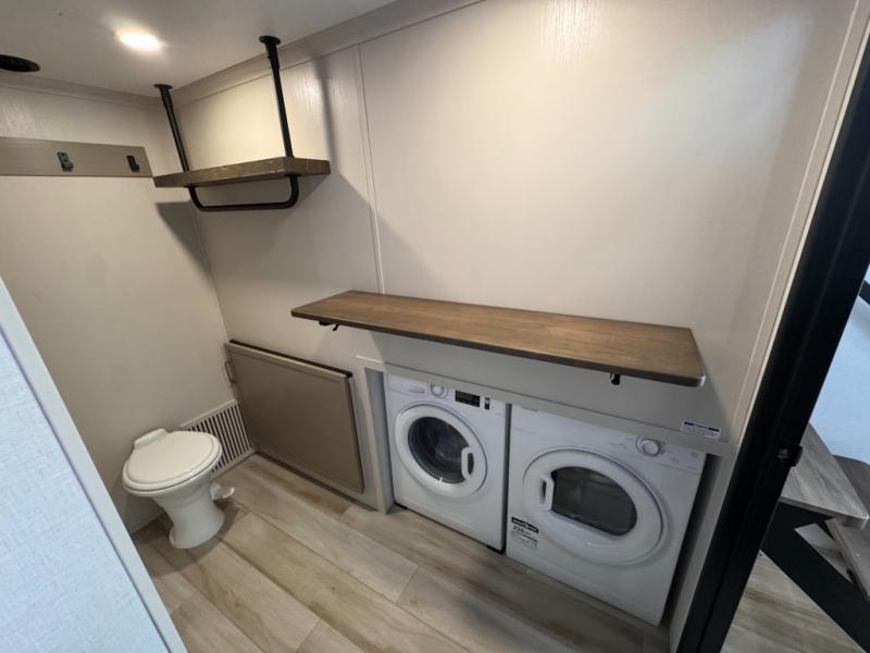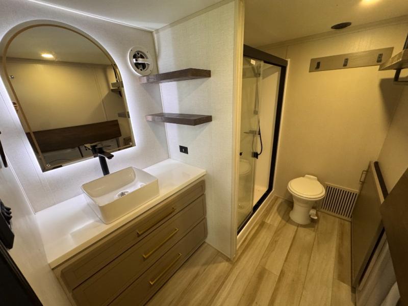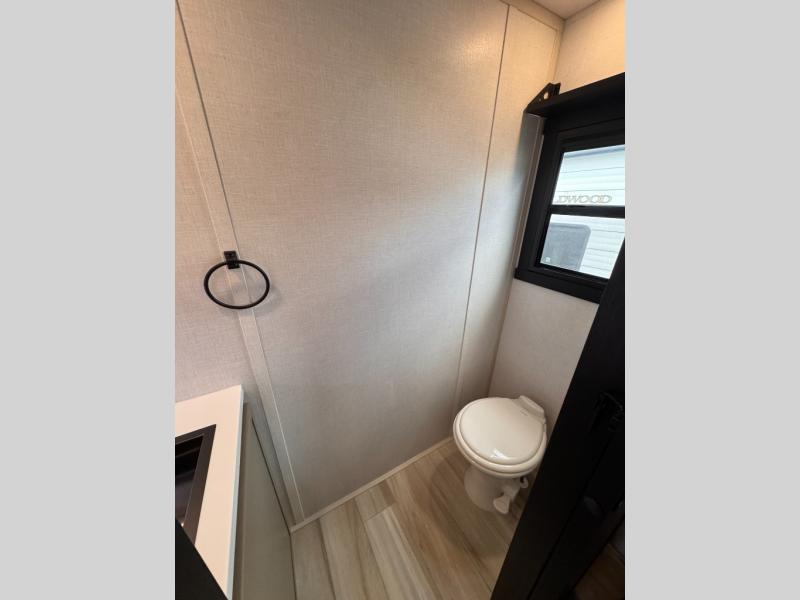 The Wildwood Heritage Glen ROOST fifth wheels resemble a destination trailer that will be giving you residential vibes! The premium Alley Grey high-gloss gel coat fiberglass sidewalls are ultra sleek, and the flat pitched roof sheds water to the off-door side for added comfort. A Race Track A/C duct system provides maximum cooling, and the AccessiBelly underbelly with 12V tank heaters on all holding tanks will help extend your camping season. There are high-end solid surface and maple-stained wood countertops inside, along with residential-inspired wood door casings, and 6' 8" clearance in all rooms, excluding lofts. Additional features include a Gun Metal grey kitchen sink, backlit mirrors in the bathrooms, motion sensor lights by the spiral stair cases, and back up camera prep if you want the option to make parking easier than ever.