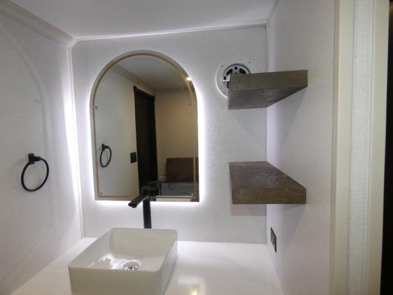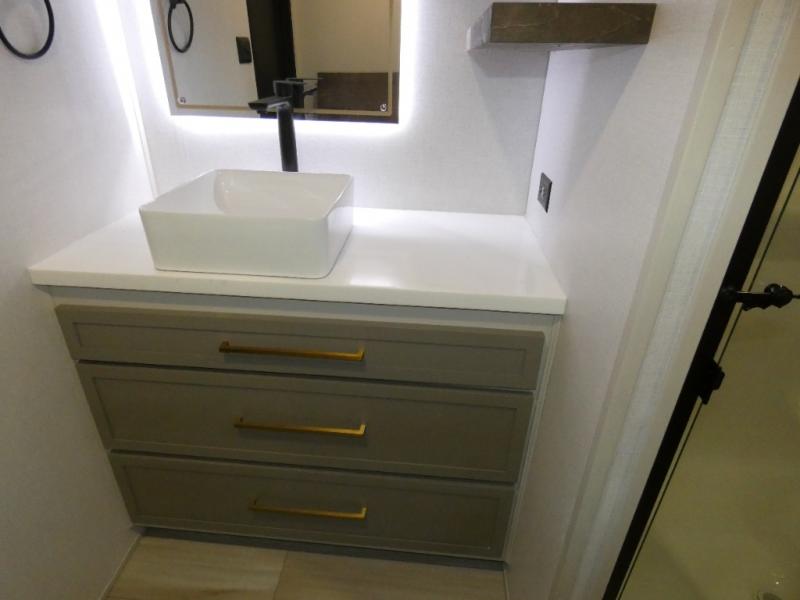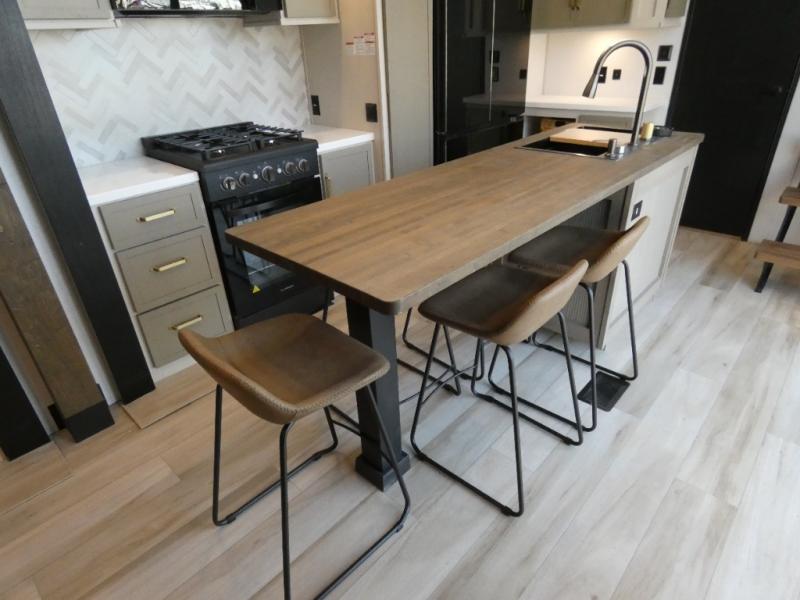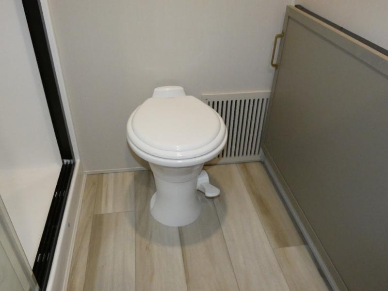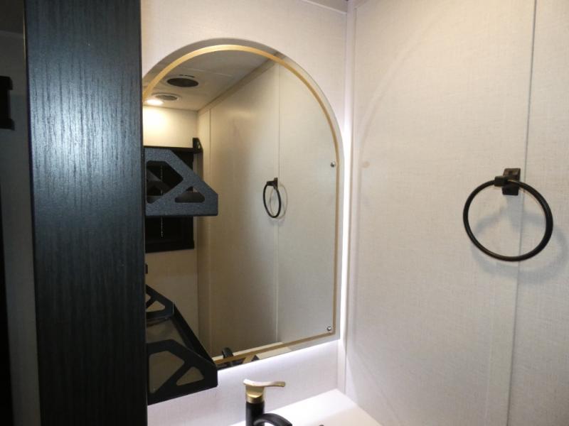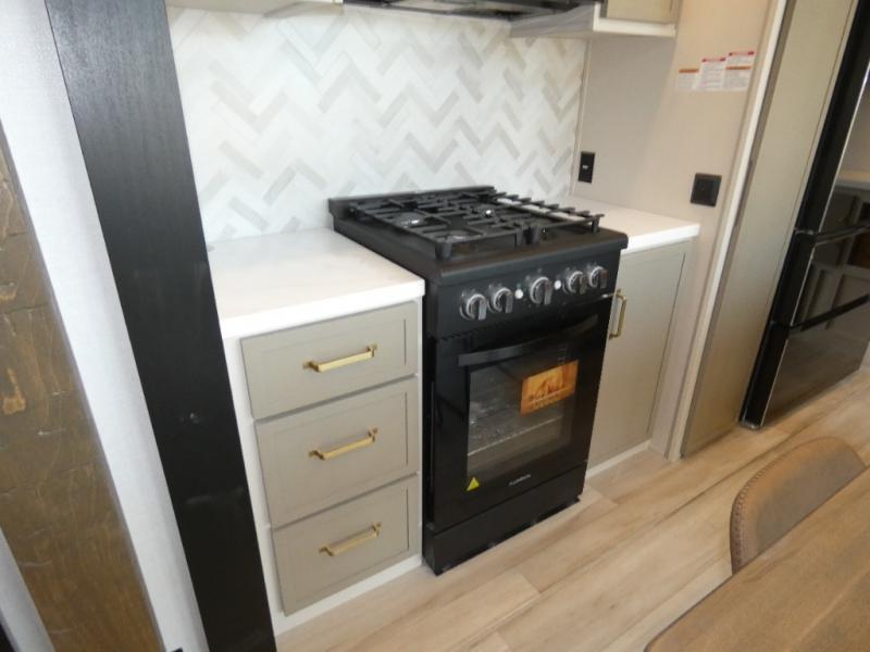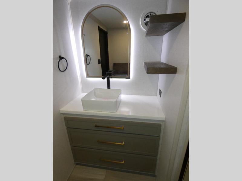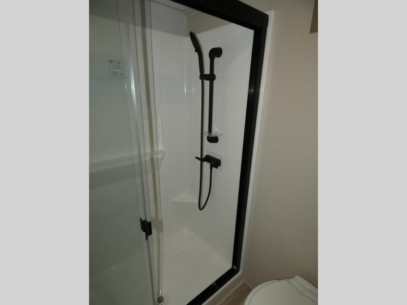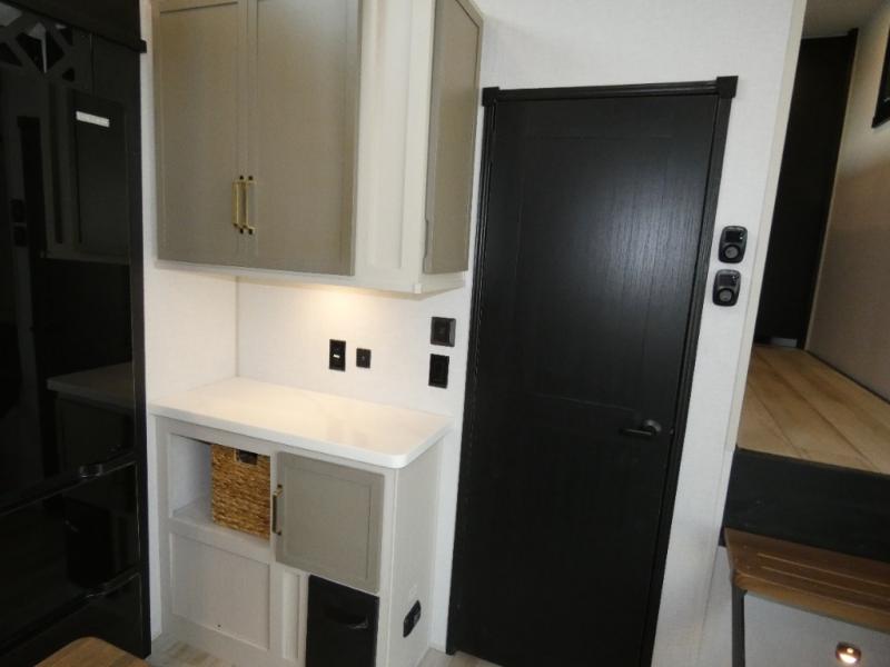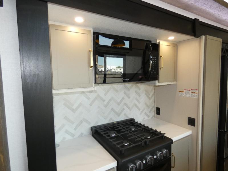 The Wildwood Heritage Glen ROOST fifth wheels resemble a destination trailer that will be giving you residential vibes! The premium Alley Grey high-gloss gel coat fiberglass sidewalls are ultra sleek, and the flat pitched roof sheds water to the off-door side for added comfort. A Race Track A/C duct system provides maximum cooling, and the AccessiBelly underbelly with 12V tank heaters on all holding tanks will help extend your camping season. There are high-end solid surface and maple-stained wood countertops inside, along with residential-inspired wood door casings, and 6' 8" clearance in all rooms, excluding lofts. Additional features include a Gun Metal grey kitchen sink, backlit mirrors in the bathrooms, motion sensor lights by the spiral stair cases, and back up camera prep if you want the option to make parking easier than ever.