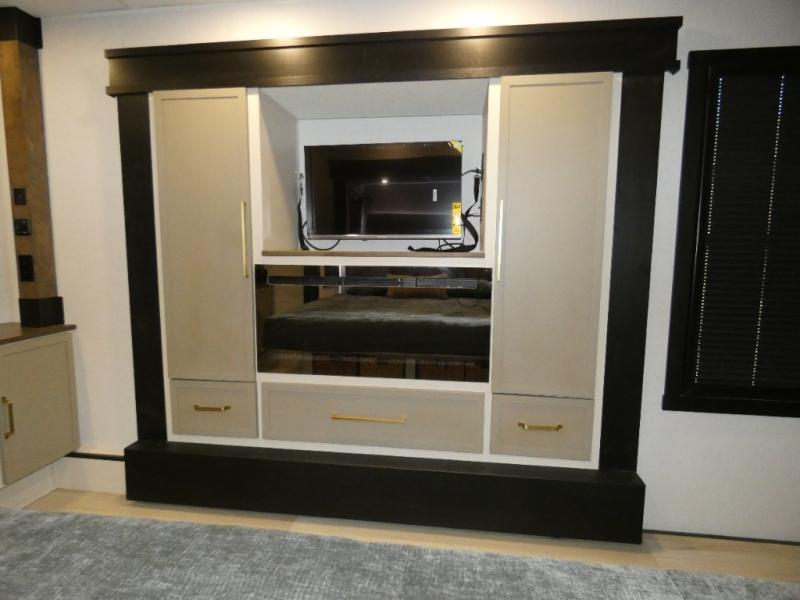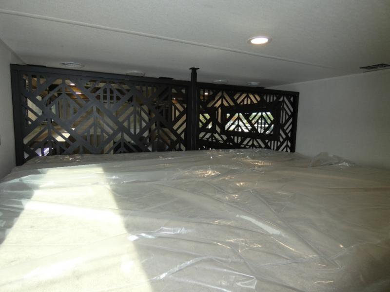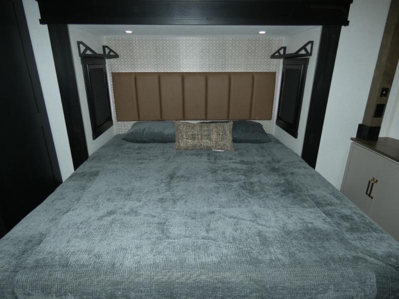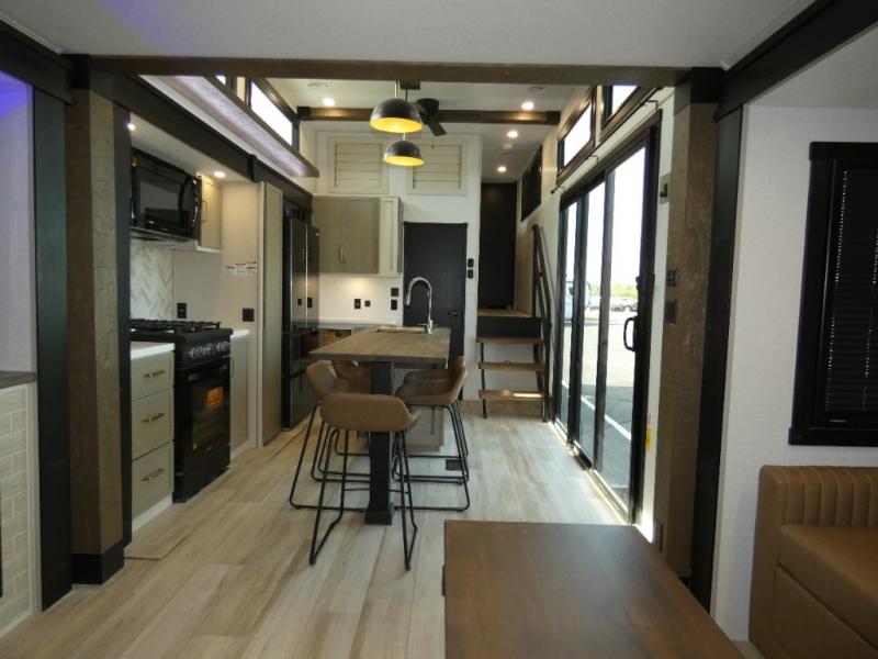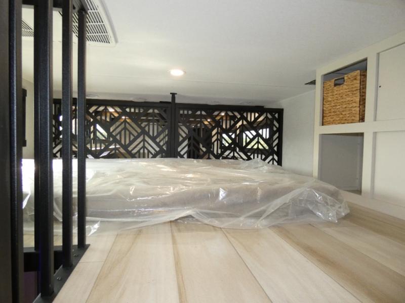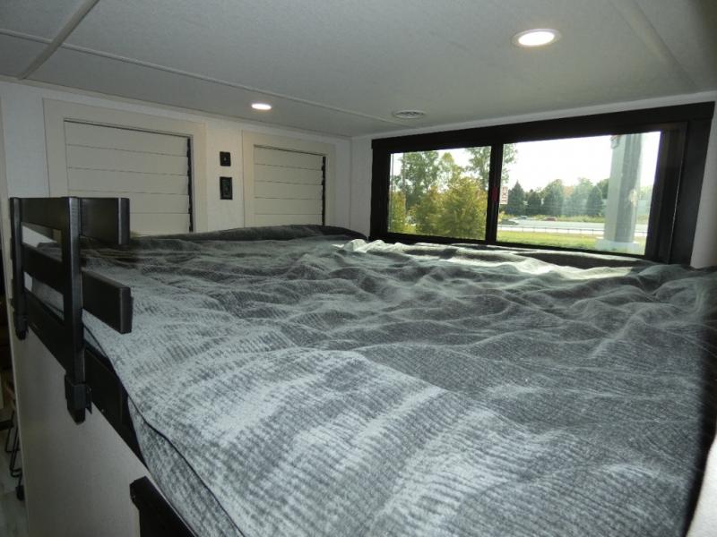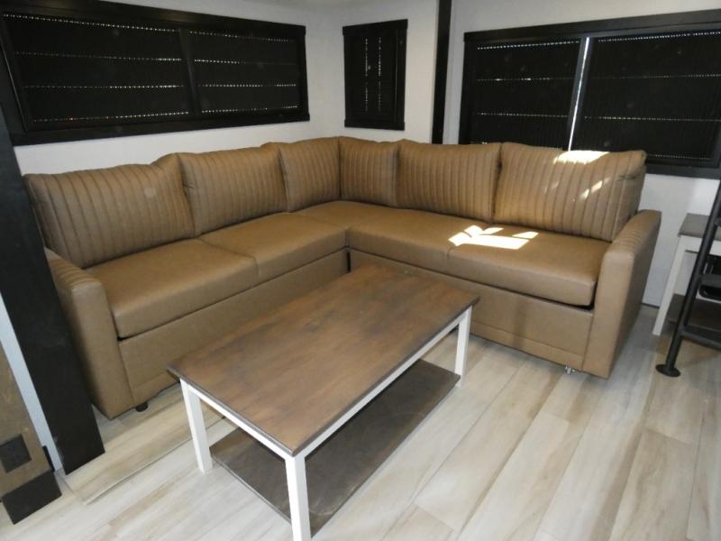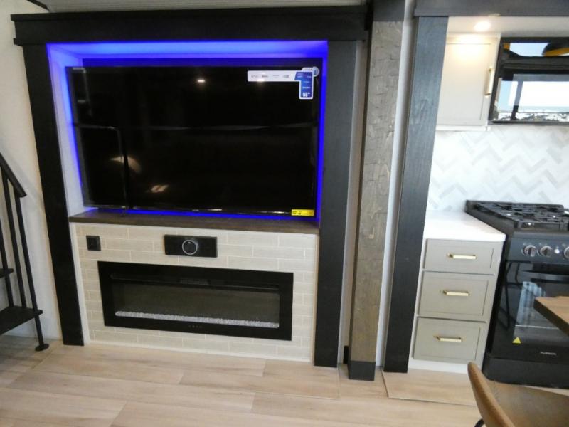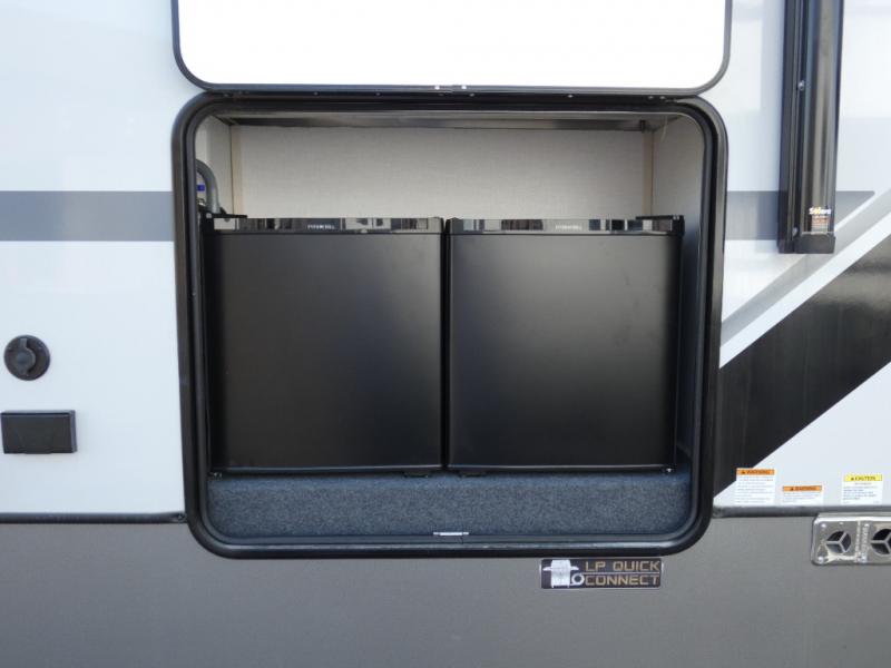 Introducing a new RV of its kind, the ROOST43 is a destination-style fifth wheel you are sure to love! There are two levels, making it feel more like home, and you can sleep six to eight each night. The master bedroom includes a custom king bed slide out, a 32" TV and fireplace, a desk/vanity, plus a half bath for convenience. A custom king-size bed is also found in the front loft, and there are storage cubbies plus a coax/110V outlet here to plug in chargers or a laptop. The second loft in the back includes spiral stairs, two bunk mats, a wardrobe, and cubby cubes here also for your guests' things. Some of the stand-out features you'll find on the first level are the sectional sofa with a coffee table, an entertainment center with a 65" TV, a kitchen island with five chairs, and a fully-equipped kitchen. The 20 cu. ft. 12V refrigerator and pull-out pantry will let you stock up on food, and the kitchen hutch will be perfect for nice dishes. The full bath on this model is one to remember; there is a one-piece fiberglass shower with a teak seat, a flip-up shelf and a washer/dryer, a backlit mirror, and more. And we haven't even touched on the exterior features, such as the pull-out tray, outdoor refrigerators, 20' awning, and more!