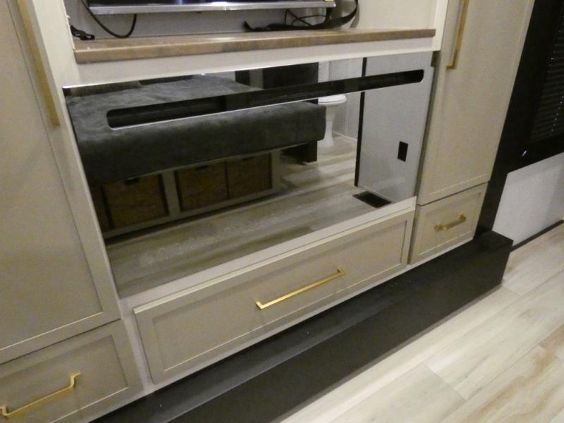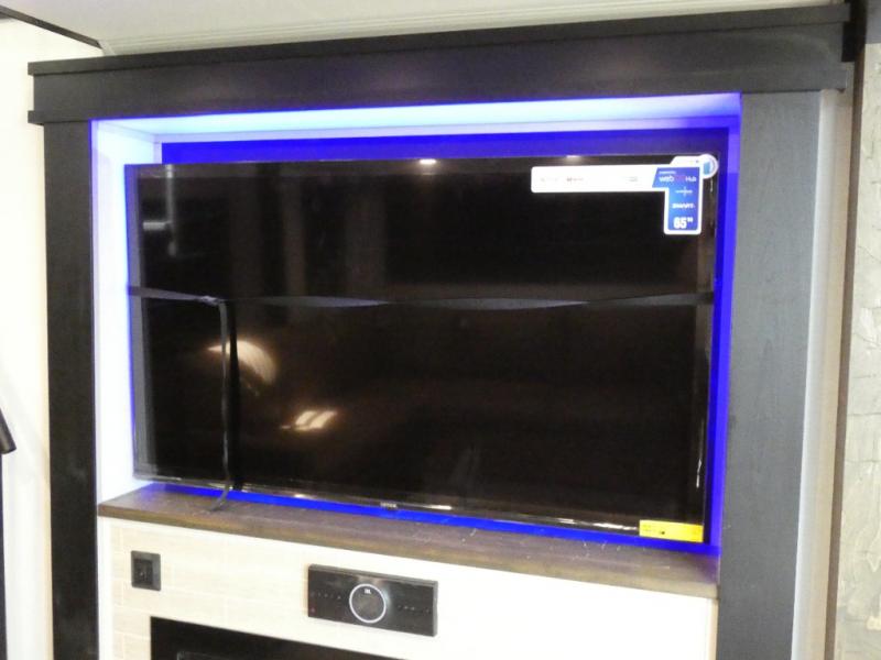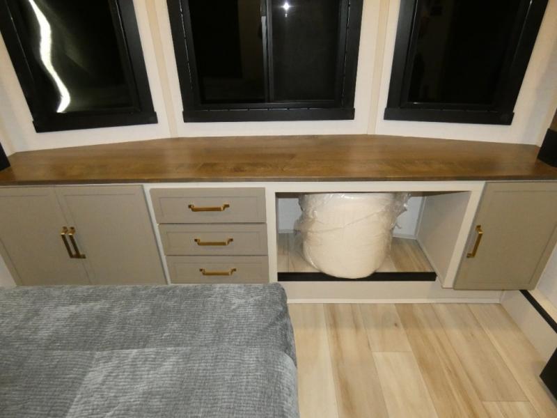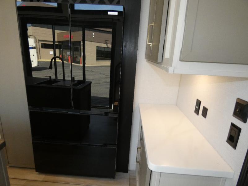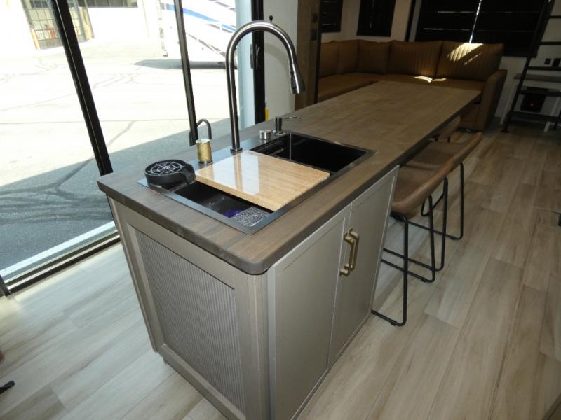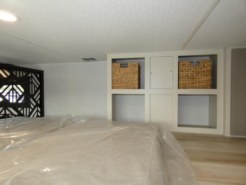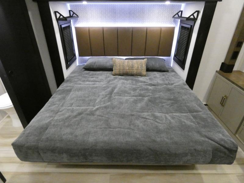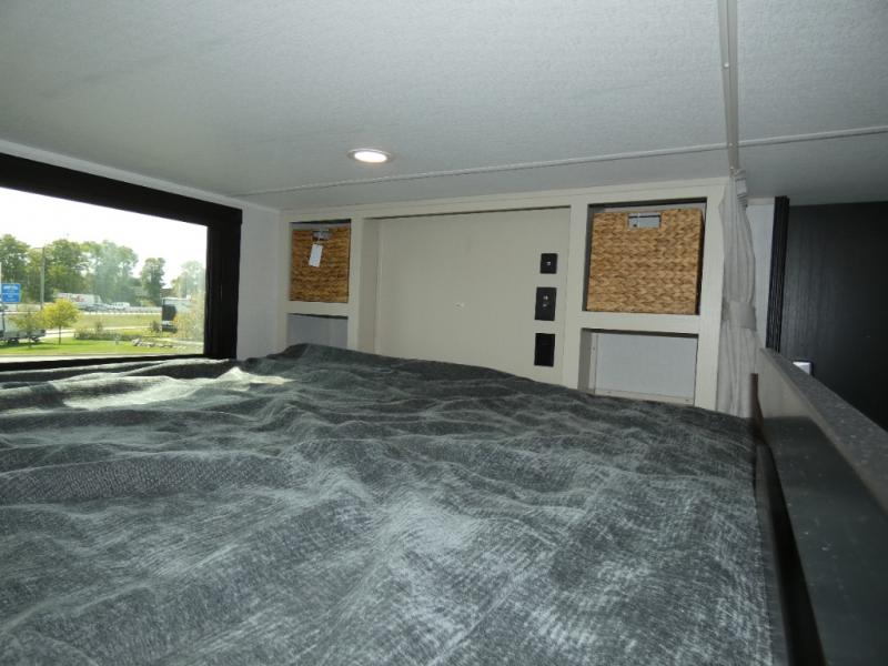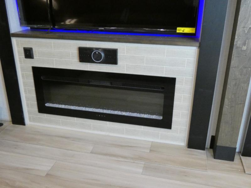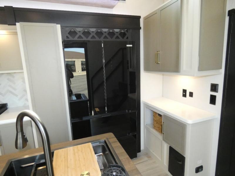 Introducing a new RV of its kind, the ROOST43 is a destination-style fifth wheel you are sure to love! There are two levels, making it feel more like home, and you can sleep six to eight each night. The master bedroom includes a custom king bed slide out, a 32" TV and fireplace, a desk/vanity, plus a half bath for convenience. A custom king-size bed is also found in the front loft, and there are storage cubbies plus a coax/110V outlet here to plug in chargers or a laptop. The second loft in the back includes spiral stairs, two bunk mats, a wardrobe, and cubby cubes here also for your guests' things. Some of the stand-out features you'll find on the first level are the sectional sofa with a coffee table, an entertainment center with a 65" TV, a kitchen island with five chairs, and a fully-equipped kitchen. The 20 cu. ft. 12V refrigerator and pull-out pantry will let you stock up on food, and the kitchen hutch will be perfect for nice dishes. The full bath on this model is one to remember; there is a one-piece fiberglass shower with a teak seat, a flip-up shelf and a washer/dryer, a backlit mirror, and more. And we haven't even touched on the exterior features, such as the pull-out tray, outdoor refrigerators, 20' awning, and more!