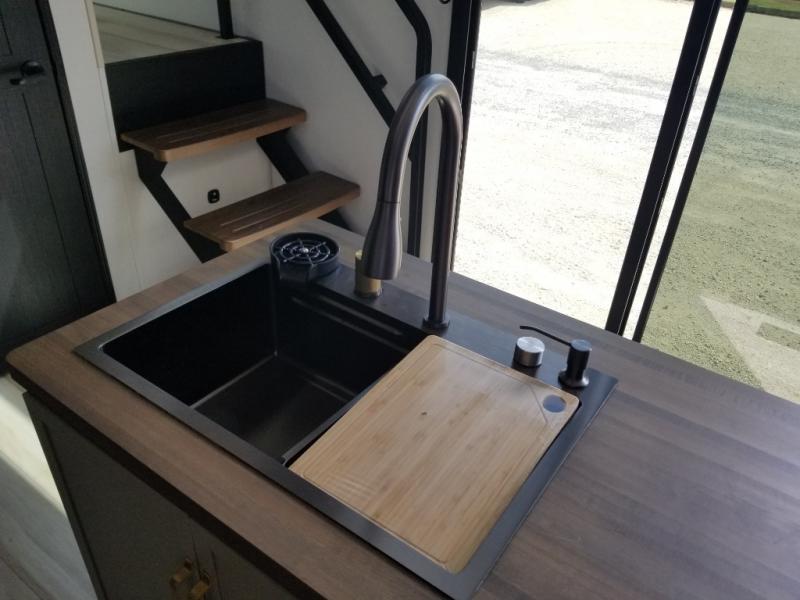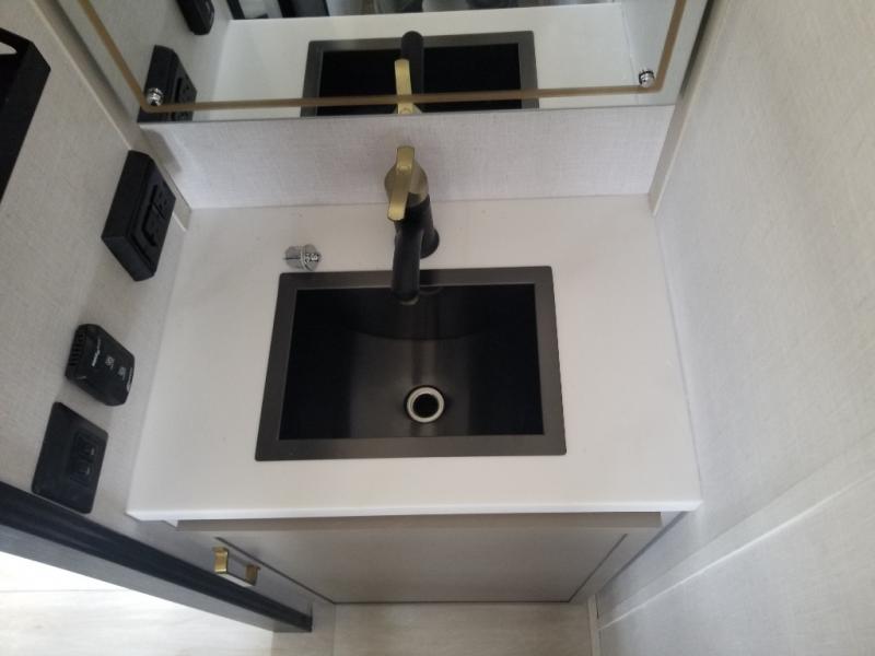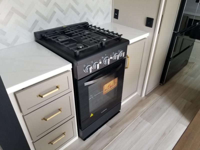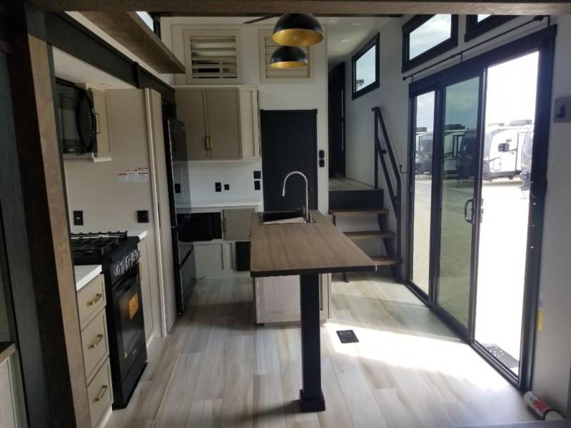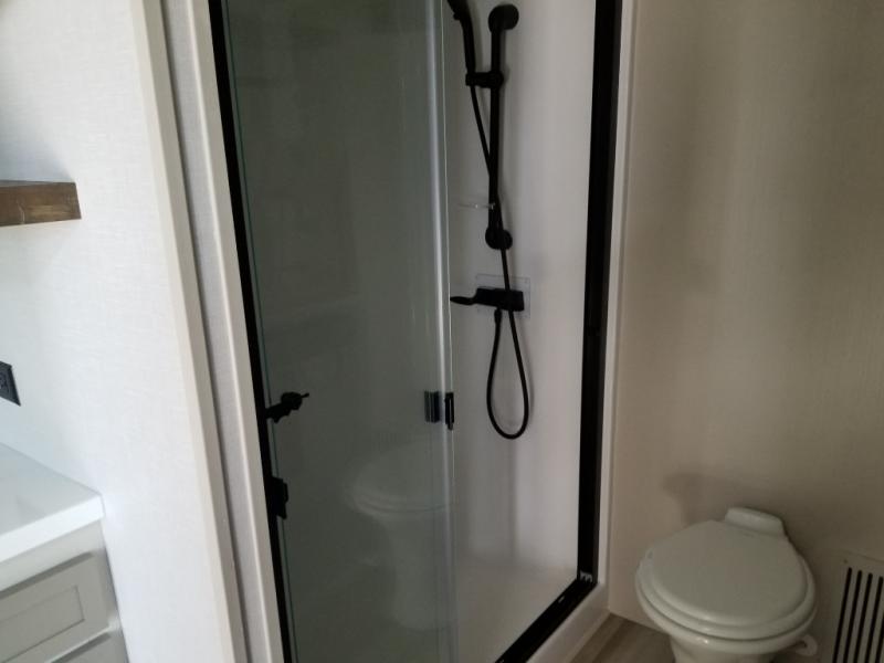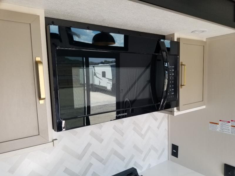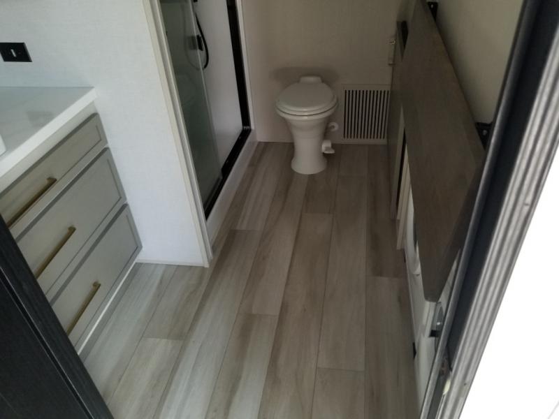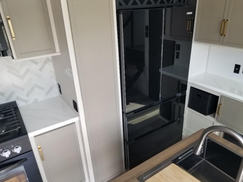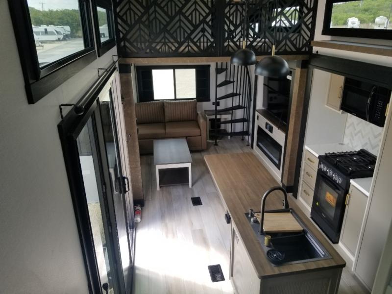 The Wildwood Heritage Glen ROOST fifth wheels resemble a destination trailer that will be giving you residential vibes! The premium Alley Grey high-gloss gel coat fiberglass sidewalls are ultra sleek, and the flat pitched roof sheds water to the off-door side for added comfort. A Race Track A/C duct system provides maximum cooling, and the AccessiBelly underbelly with 12V tank heaters on all holding tanks will help extend your camping season. There are high-end solid surface and maple-stained wood countertops inside, along with residential-inspired wood door casings, and 6' 8" clearance in all rooms, excluding lofts. Additional features include a Gun Metal grey kitchen sink, backlit mirrors in the bathrooms, motion sensor lights by the spiral stair cases, and back up camera prep if you want the option to make parking easier than ever.