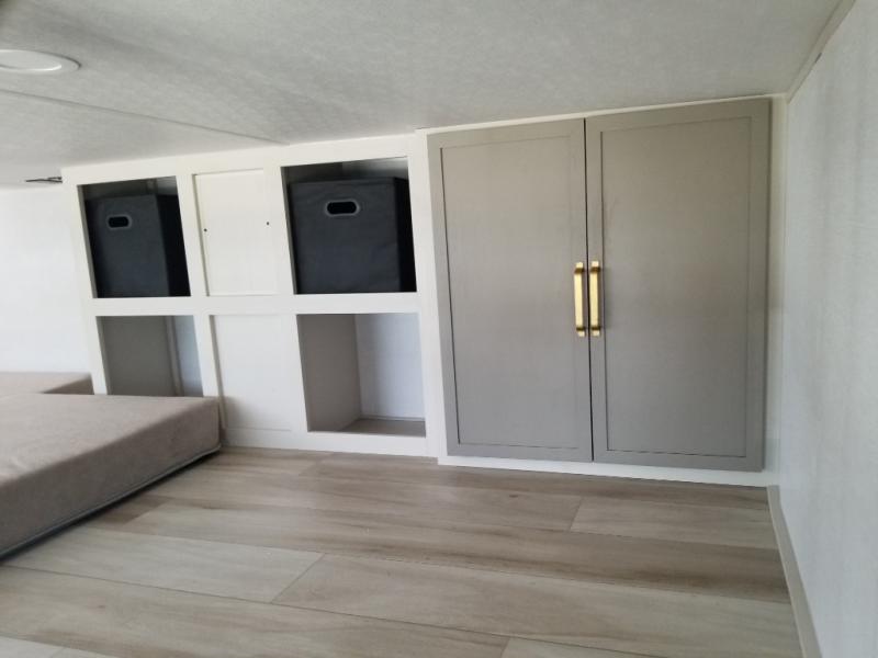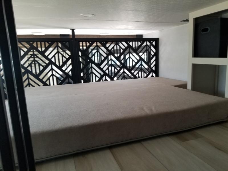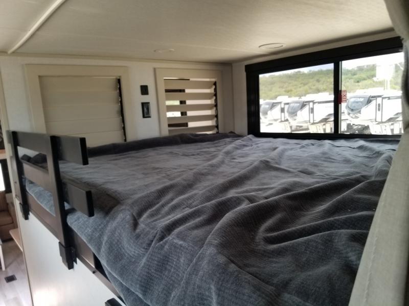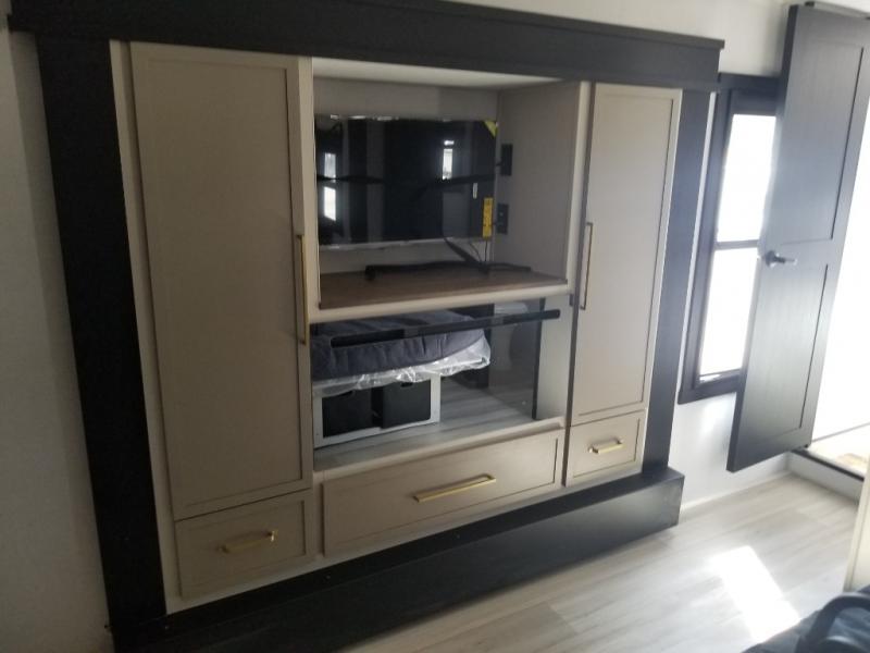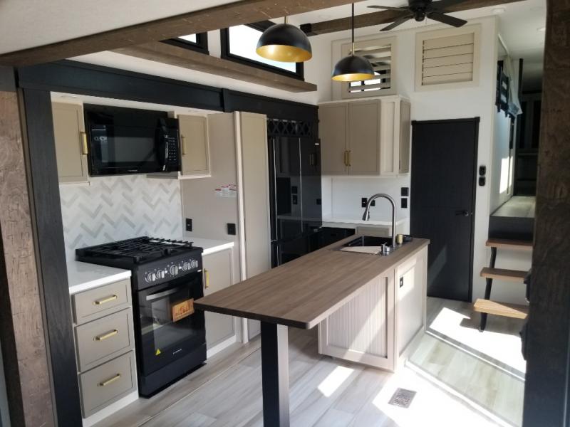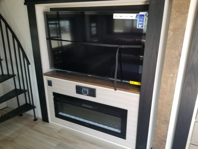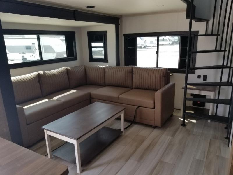 Introducing a new RV of its kind, the ROOST43 is a destination-style fifth wheel you are sure to love! There are two levels, making it feel more like home, and you can sleep six to eight each night. The master bedroom includes a custom king bed slide out, a 32" TV and fireplace, a desk/vanity, plus a half bath for convenience. A custom king-size bed is also found in the front loft, and there are storage cubbies plus a coax/110V outlet here to plug in chargers or a laptop. The second loft in the back includes spiral stairs, two bunk mats, a wardrobe, and cubby cubes here also for your guests' things. Some of the stand-out features you'll find on the first level are the sectional sofa with a coffee table, an entertainment center with a 65" TV, a kitchen island with five chairs, and a fully-equipped kitchen. The 20 cu. ft. 12V refrigerator and pull-out pantry will let you stock up on food, and the kitchen hutch will be perfect for nice dishes. The full bath on this model is one to remember; there is a one-piece fiberglass shower with a teak seat, a flip-up shelf and a washer/dryer, a backlit mirror, and more. And we haven't even touched on the exterior features, such as the pull-out tray, outdoor refrigerators, 20' awning, and more!