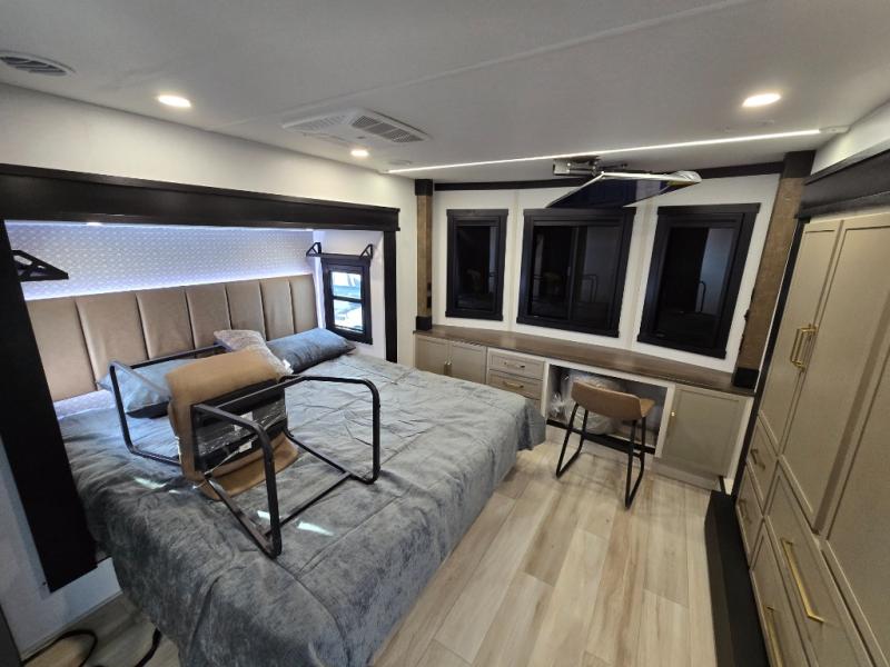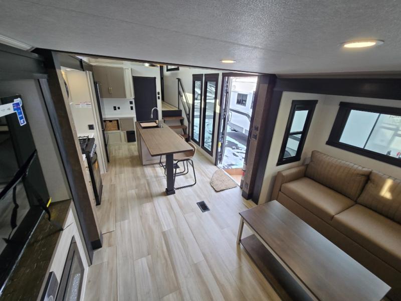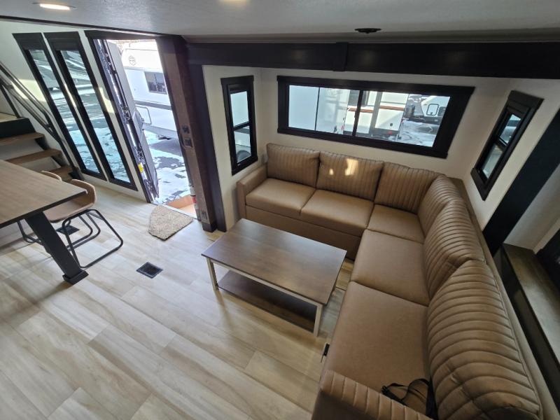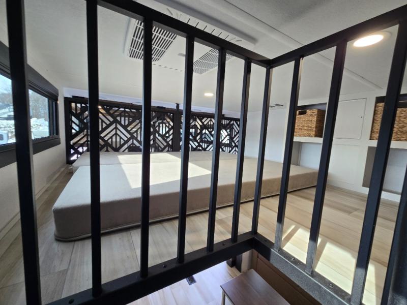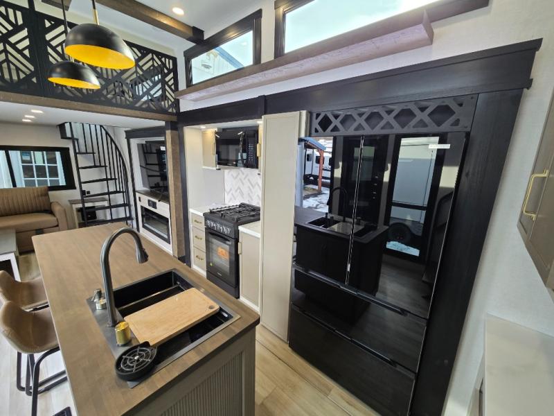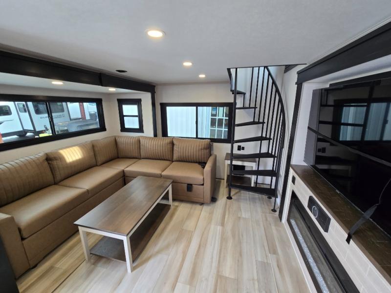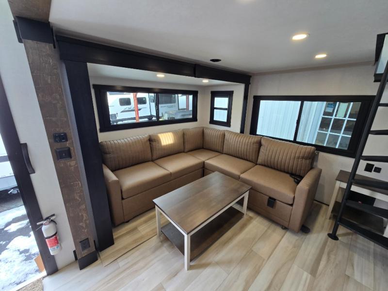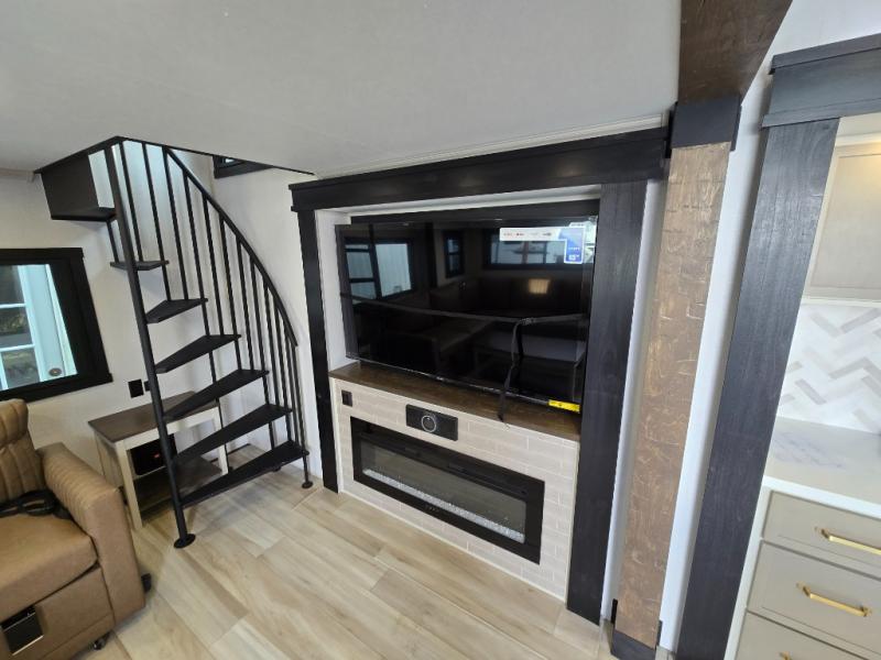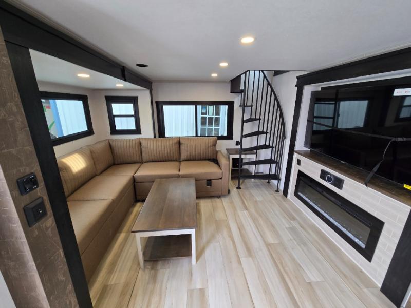 Introducing a new RV of its kind, the ROOST43 is a destination-style fifth wheel you are sure to love! There are two levels, making it feel more like home, and you can sleep six to eight each night. The master bedroom includes a custom king bed slide out, a 32" TV and fireplace, a desk/vanity, plus a half bath for convenience. A custom king-size bed is also found in the front loft, and there are storage cubbies plus a coax/110V outlet here to plug in chargers or a laptop. The second loft in the back includes spiral stairs, two bunk mats, a wardrobe, and cubby cubes here also for your guests' things. Some of the stand-out features you'll find on the first level are the sectional sofa with a coffee table, an entertainment center with a 65" TV, a kitchen island with five chairs, and a fully-equipped kitchen. The 20 cu. ft. 12V refrigerator and pull-out pantry will let you stock up on food, and the kitchen hutch will be perfect for nice dishes. The full bath on this model is one to remember; there is a one-piece fiberglass shower with a teak seat, a flip-up shelf and a washer/dryer, a backlit mirror, and more. And we haven't even touched on the exterior features, such as the pull-out tray, outdoor refrigerators, 20' awning, and more!