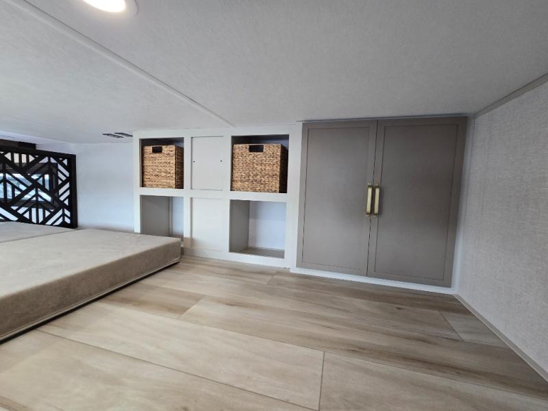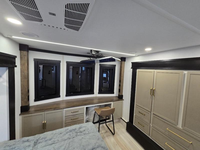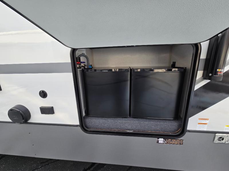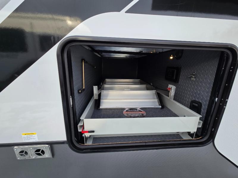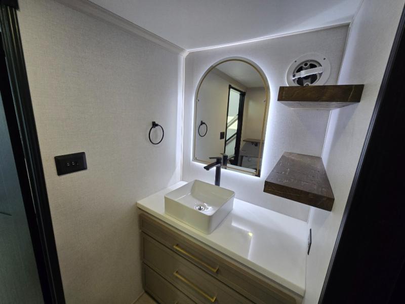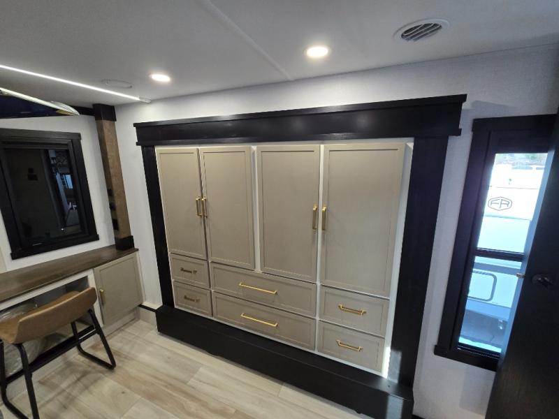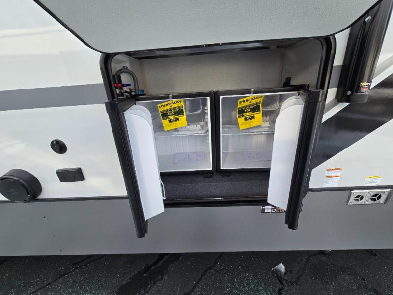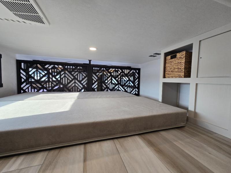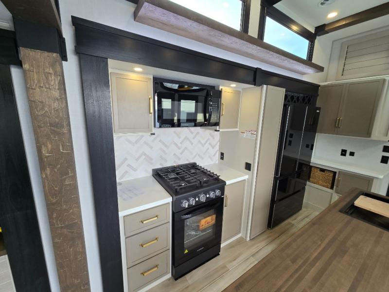 Introducing a new RV of its kind, the ROOST43 is a destination-style fifth wheel you are sure to love! There are two levels, making it feel more like home, and you can sleep six to eight each night. The master bedroom includes a custom king bed slide out, a 32" TV and fireplace, a desk/vanity, plus a half bath for convenience. A custom king-size bed is also found in the front loft, and there are storage cubbies plus a coax/110V outlet here to plug in chargers or a laptop. The second loft in the back includes spiral stairs, two bunk mats, a wardrobe, and cubby cubes here also for your guests' things. Some of the stand-out features you'll find on the first level are the sectional sofa with a coffee table, an entertainment center with a 65" TV, a kitchen island with five chairs, and a fully-equipped kitchen. The 20 cu. ft. 12V refrigerator and pull-out pantry will let you stock up on food, and the kitchen hutch will be perfect for nice dishes. The full bath on this model is one to remember; there is a one-piece fiberglass shower with a teak seat, a flip-up shelf and a washer/dryer, a backlit mirror, and more. And we haven't even touched on the exterior features, such as the pull-out tray, outdoor refrigerators, 20' awning, and more!