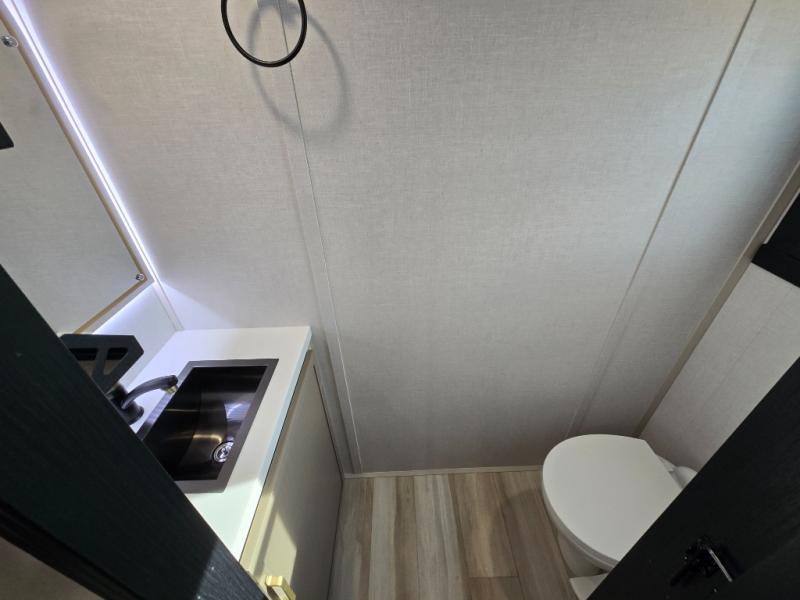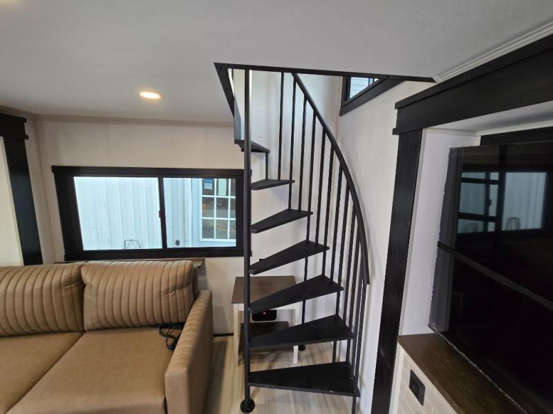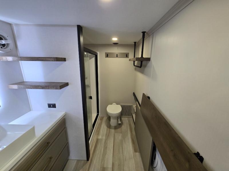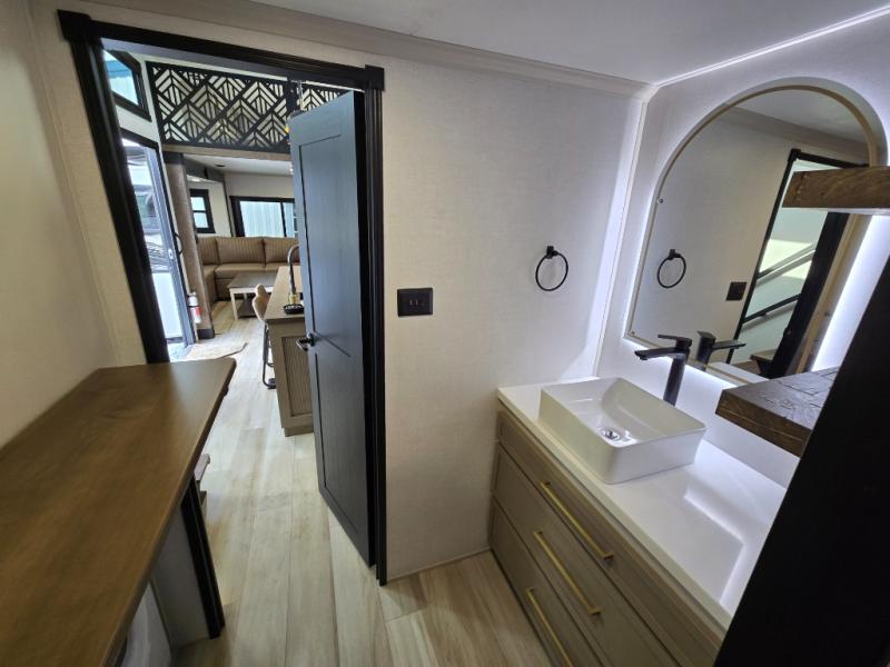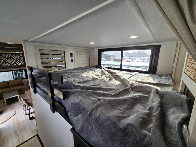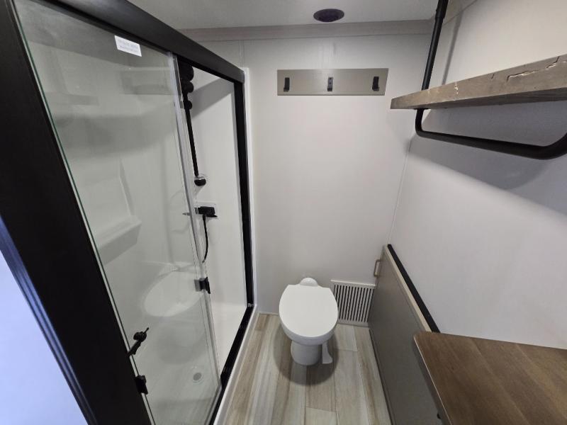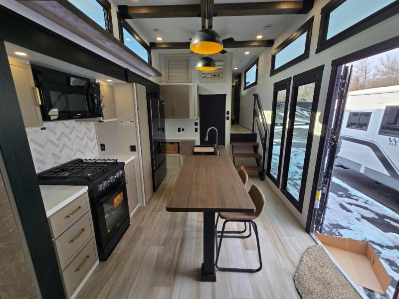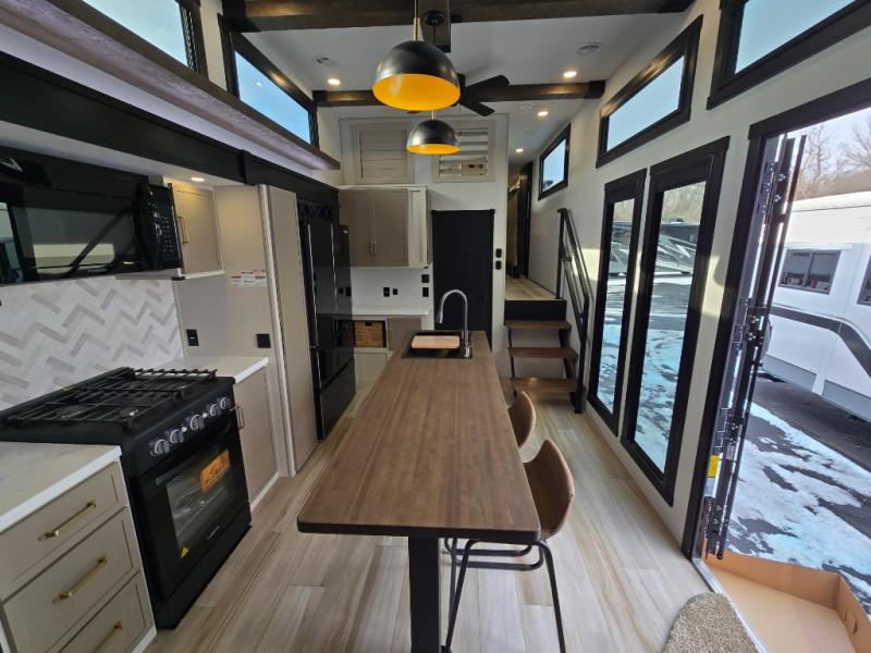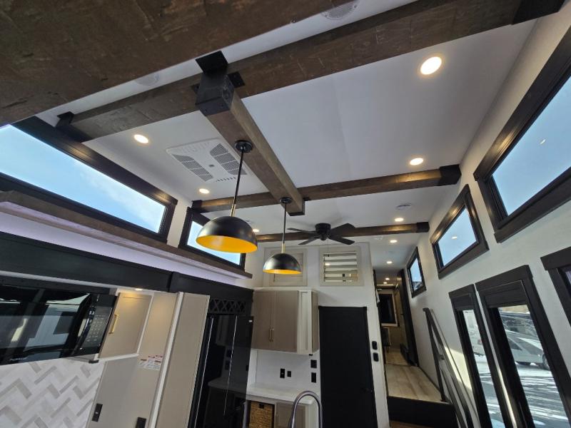 The Wildwood Heritage Glen ROOST fifth wheels resemble a destination trailer that will be giving you residential vibes! The premium Alley Grey high-gloss gel coat fiberglass sidewalls are ultra sleek, and the flat pitched roof sheds water to the off-door side for added comfort. A Race Track A/C duct system provides maximum cooling, and the AccessiBelly underbelly with 12V tank heaters on all holding tanks will help extend your camping season. There are high-end solid surface and maple-stained wood countertops inside, along with residential-inspired wood door casings, and 6' 8" clearance in all rooms, excluding lofts. Additional features include a Gun Metal grey kitchen sink, backlit mirrors in the bathrooms, motion sensor lights by the spiral stair cases, and back up camera prep if you want the option to make parking easier than ever.