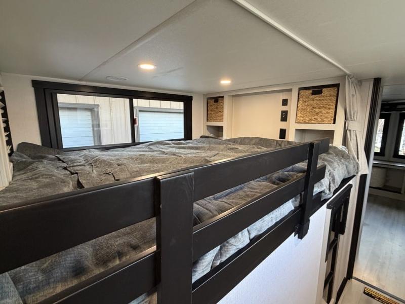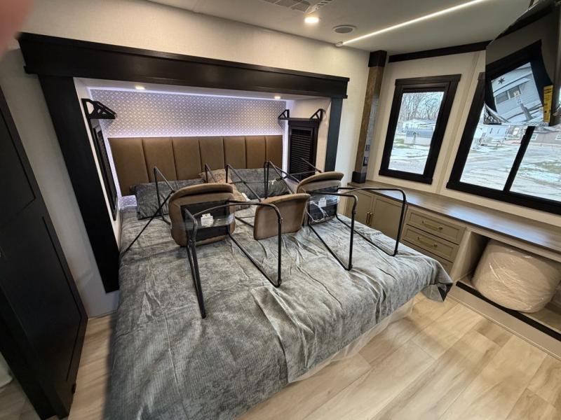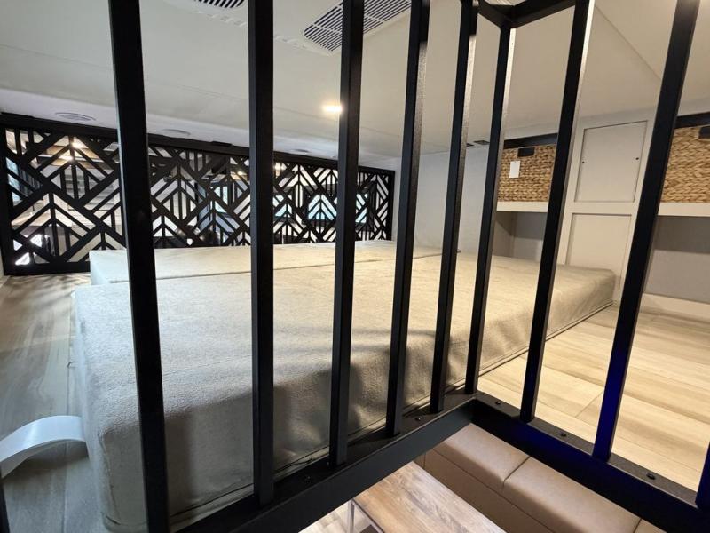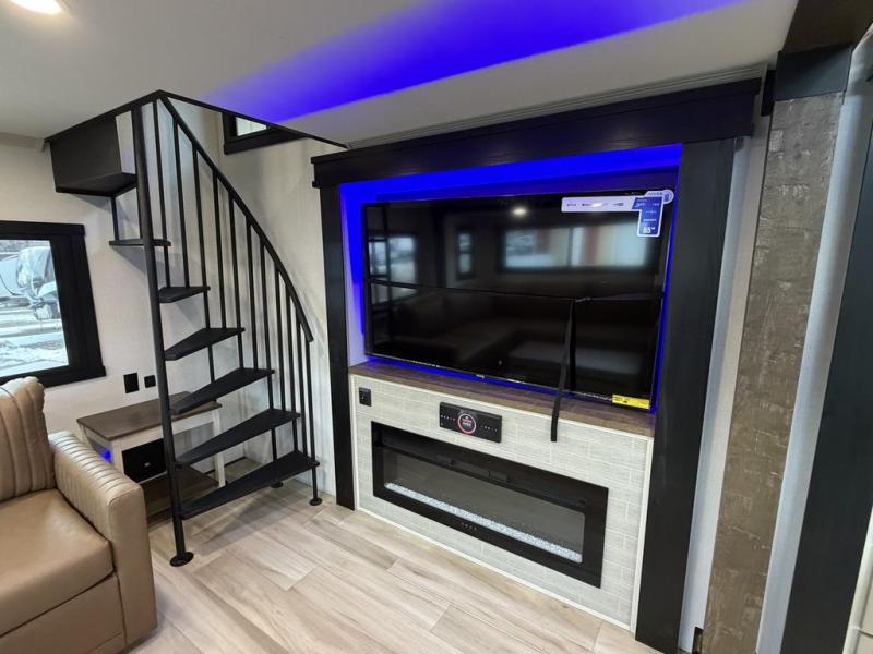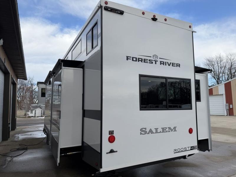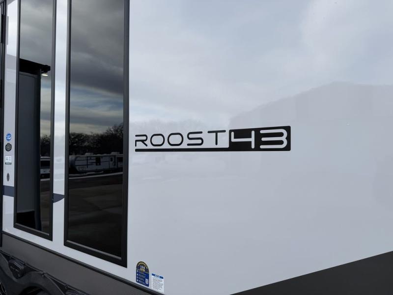 Introducing a new RV of its kind, the ROOST43 is a destination-style fifth wheel you are sure to love! There are two levels, making it feel more like home, and you can sleep six to eight each night. The master bedroom includes a custom king bed slide out, a 32" TV and fireplace, a desk/vanity, plus a half bath for convenience. A custom king-size bed is also found in the front loft, and there are storage cubbies plus a coax/110V outlet here to plug in chargers or a laptop. The second loft in the back includes spiral stairs, two bunk mats, a wardrobe, and cubby cubes here also for your guests' things. Some of the stand-out features you'll find on the first level are the sectional sofa with a coffee table, an entertainment center with a 65" TV, a kitchen island with five chairs, and a fully-equipped kitchen. The 20 cu. ft. 12V refrigerator and pull-out pantry will let you stock up on food, and the kitchen hutch will be perfect for nice dishes. The full bath on this model is one to remember; there is a one-piece fiberglass shower with a teak seat, a flip-up shelf and a washer/dryer, a backlit mirror, and more. And we haven't even touched on the exterior features, such as the pull-out tray, outdoor refrigerators, 20' awning, and more!