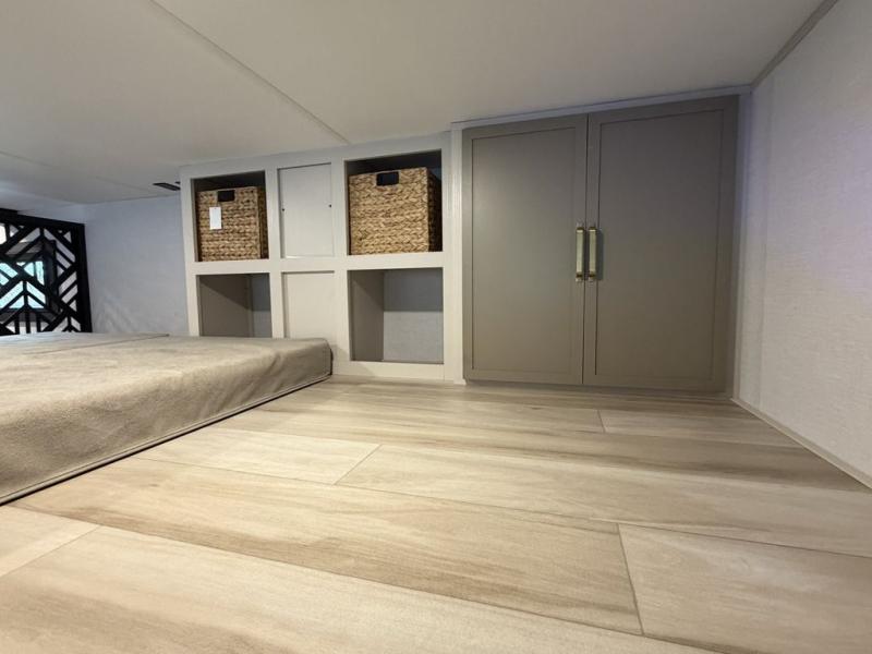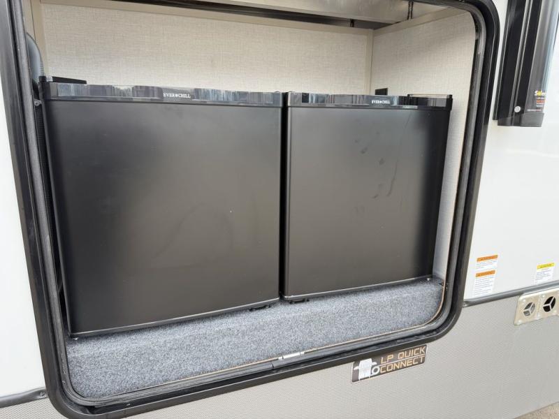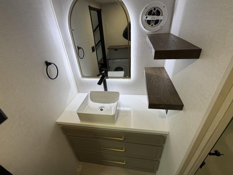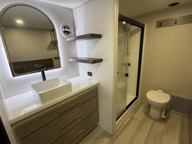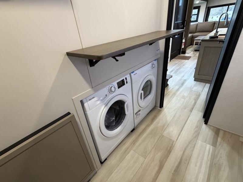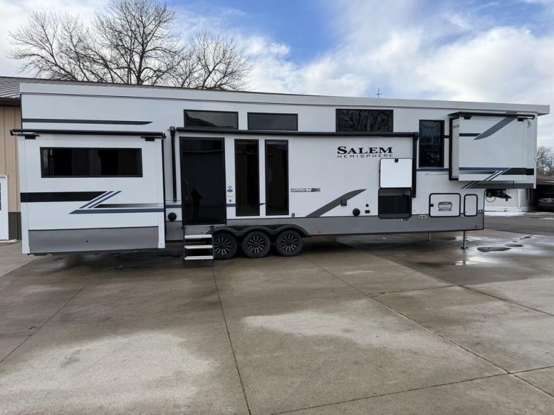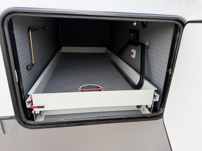 Introducing a new RV of its kind, the ROOST43 is a destination-style fifth wheel you are sure to love! There are two levels, making it feel more like home, and you can sleep six to eight each night. The master bedroom includes a custom king bed slide out, a 32" TV and fireplace, a desk/vanity, plus a half bath for convenience. A custom king-size bed is also found in the front loft, and there are storage cubbies plus a coax/110V outlet here to plug in chargers or a laptop. The second loft in the back includes spiral stairs, two bunk mats, a wardrobe, and cubby cubes here also for your guests' things. Some of the stand-out features you'll find on the first level are the sectional sofa with a coffee table, an entertainment center with a 65" TV, a kitchen island with five chairs, and a fully-equipped kitchen. The 20 cu. ft. 12V refrigerator and pull-out pantry will let you stock up on food, and the kitchen hutch will be perfect for nice dishes. The full bath on this model is one to remember; there is a one-piece fiberglass shower with a teak seat, a flip-up shelf and a washer/dryer, a backlit mirror, and more. And we haven't even touched on the exterior features, such as the pull-out tray, outdoor refrigerators, 20' awning, and more!