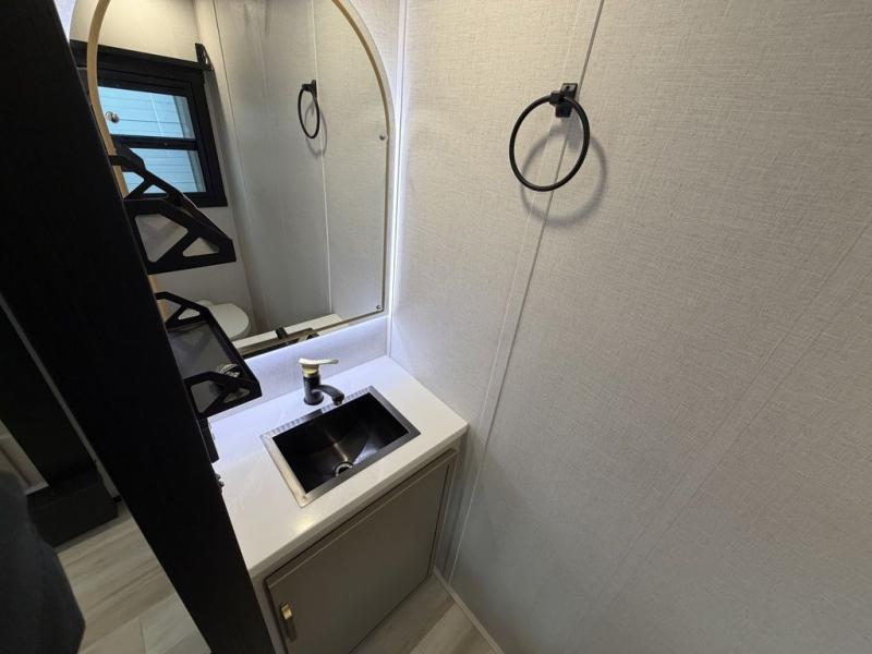 The Wildwood Heritage Glen ROOST fifth wheels resemble a destination trailer that will be giving you residential vibes! The premium Alley Grey high-gloss gel coat fiberglass sidewalls are ultra sleek, and the flat pitched roof sheds water to the off-door side for added comfort. A Race Track A/C duct system provides maximum cooling, and the AccessiBelly underbelly with 12V tank heaters on all holding tanks will help extend your camping season. There are high-end solid surface and maple-stained wood countertops inside, along with residential-inspired wood door casings, and 6' 8" clearance in all rooms, excluding lofts. Additional features include a Gun Metal grey kitchen sink, backlit mirrors in the bathrooms, motion sensor lights by the spiral stair cases, and back up camera prep if you want the option to make parking easier than ever.