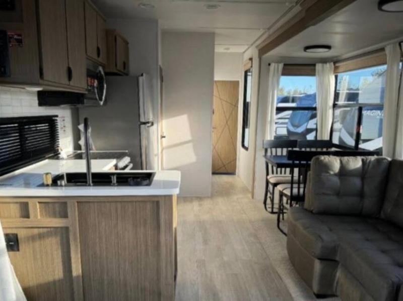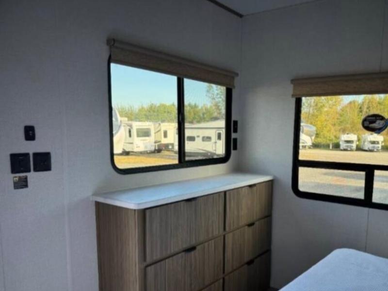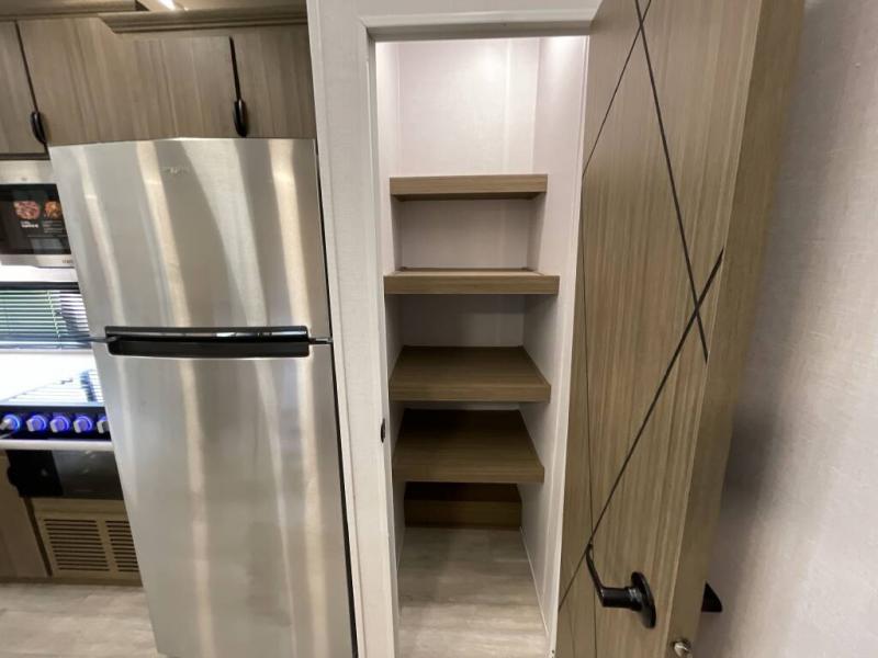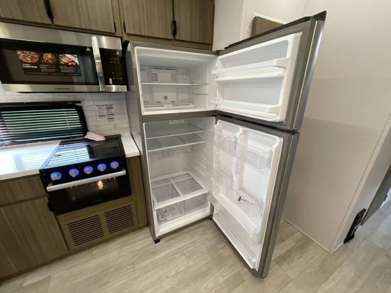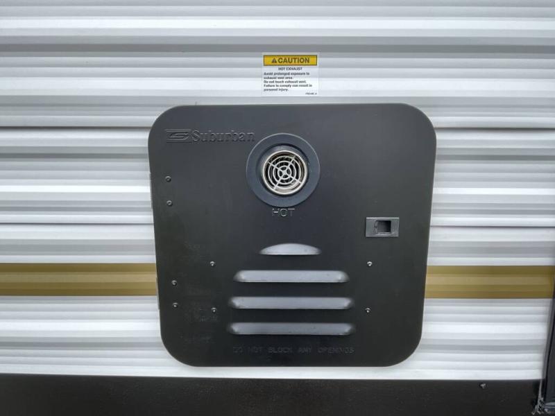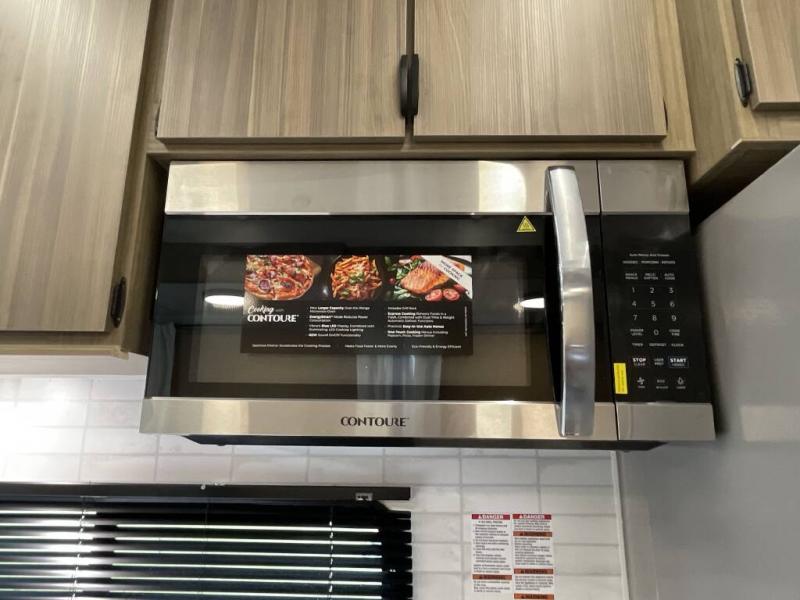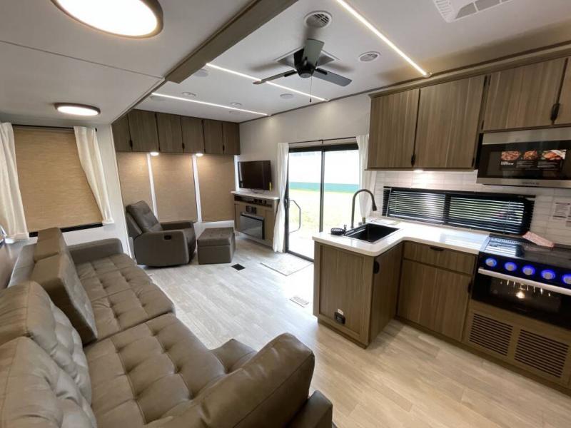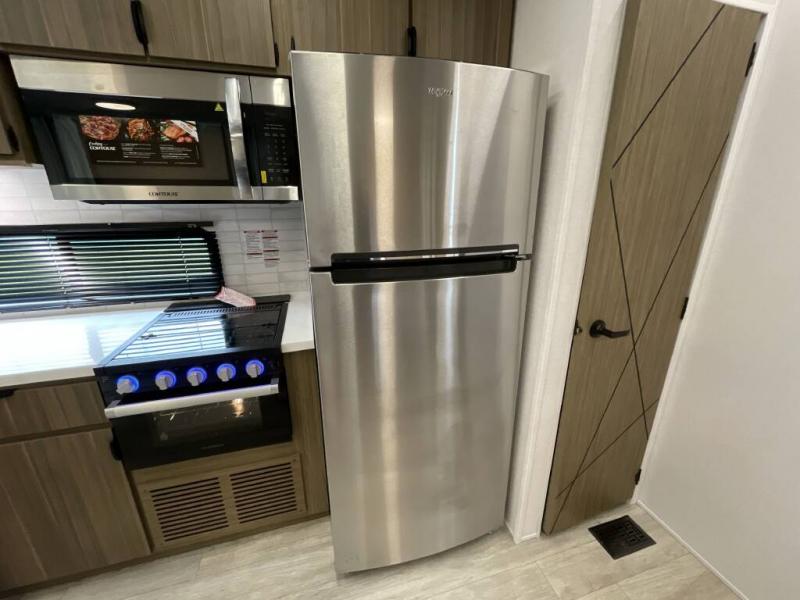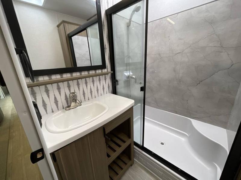 While you spend your afternoon relaxing on the L-shaped sofa or lounge chair in this Wildwood Lodge destination trailer, you can switch on the ceiling fan for an additional breeze. The free standing dinette is another great spot to sit down while you put together a puzzle or play a board game, and since the kitchen is also included in this space, you can work on dinner while still being a part of everyone else's activities. The bathroom is decked out with a walk-in shower and linen closet, and the private bedroom also has plenty of convenience with its king bed slide, closet with optional washer and dryer prep, and the second exterior entry door.