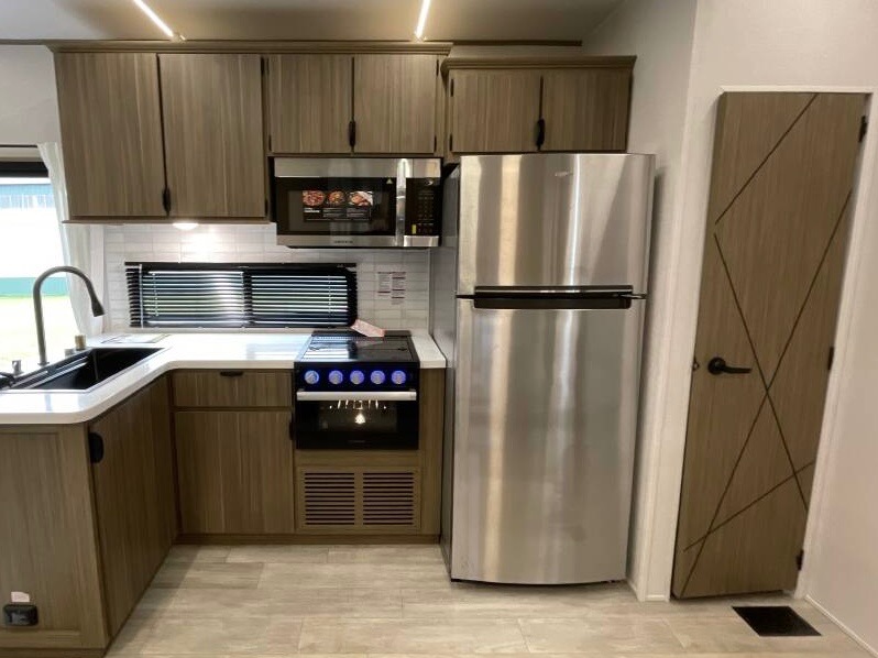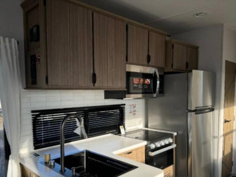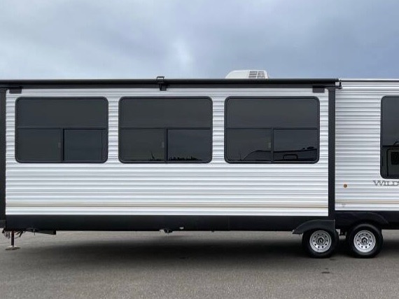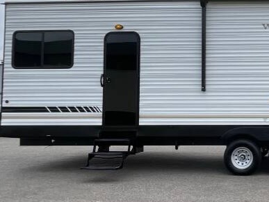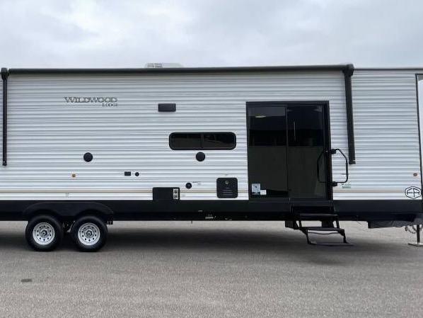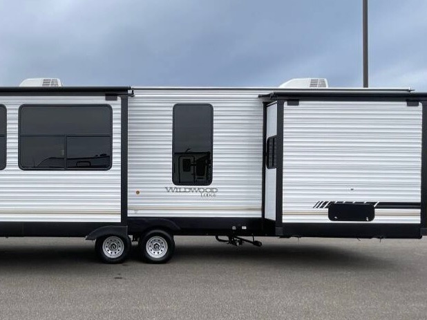 You just can't beat the Forest River Wildwood Lodge destination trailer! These trailers create the perfect camping destination in and of themselves. There is a new retro/metal redesign that is sure to turn heads at the campground, and the heated and enclosed Accessibelly provides added protection against the elements. Each model includes stainless steel kitchen appliances, a central vacuum with a sweep attachment, a Serta mattress, and kitchen backsplash to name a few comforts. Additional stand-out features include TFL cabinet doors, LED "Blade Lighting' under the awning, stylish roller shades, plus Lippert On-The-Go ladder prep for the option to add a ladder.
