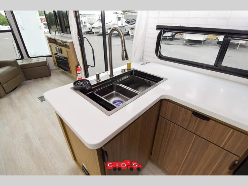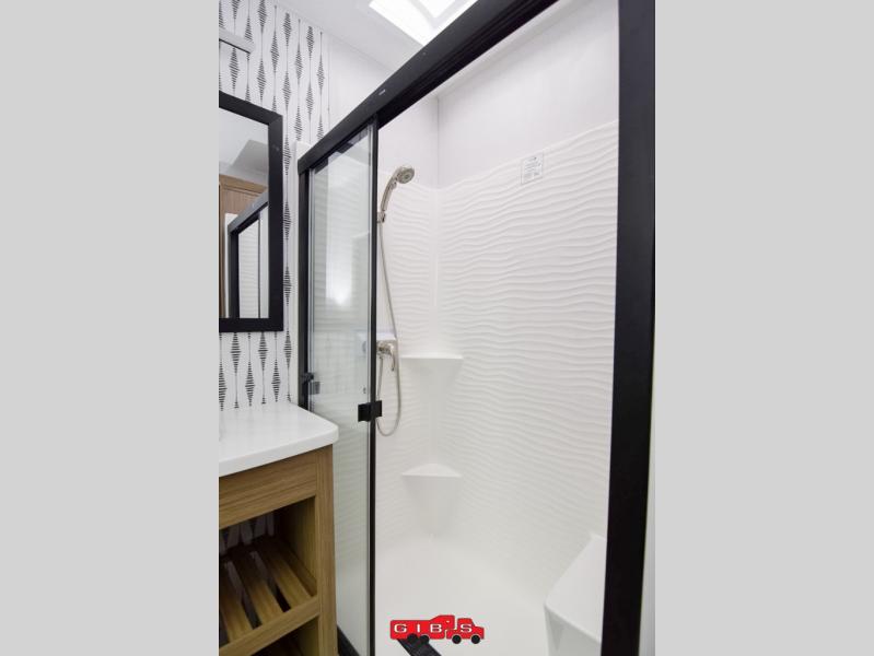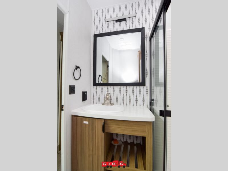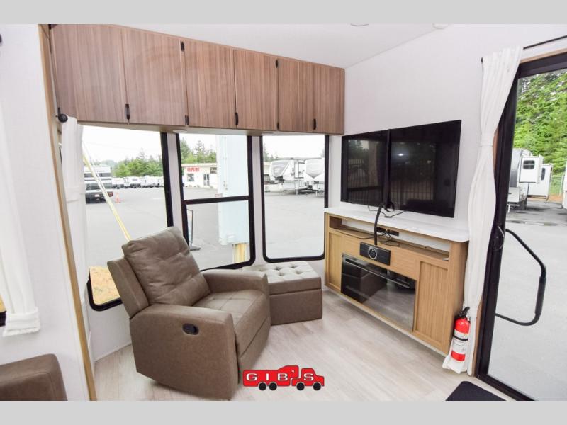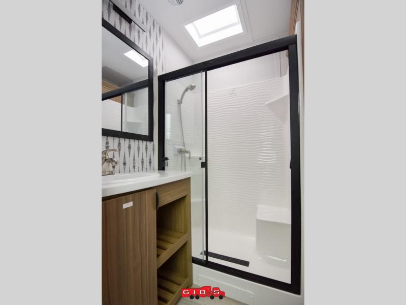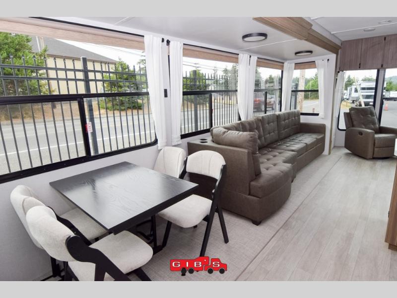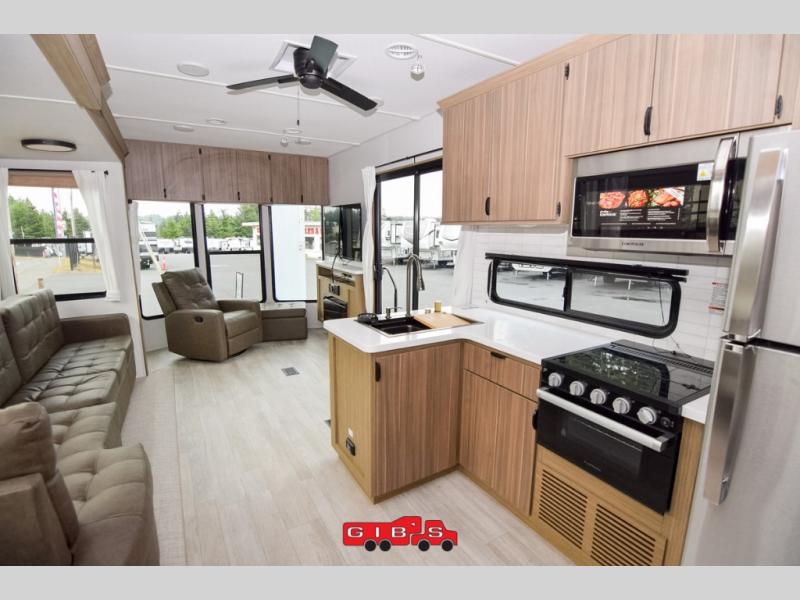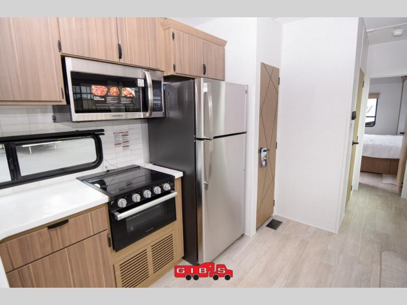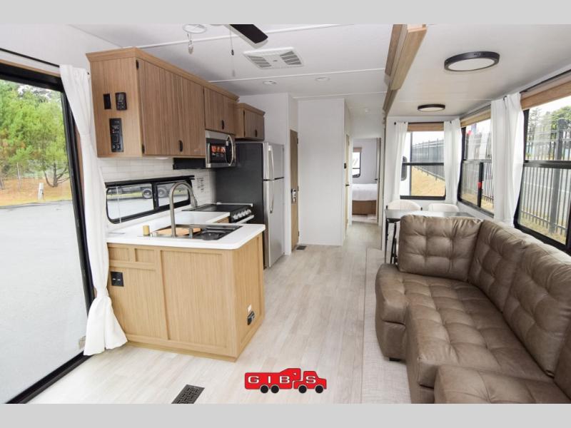 While you spend your afternoon relaxing on the L-shaped sofa or lounge chair in this Wildwood Lodge destination trailer, you can switch on the ceiling fan for an additional breeze. The free standing dinette is another great spot to sit down while you put together a puzzle or play a board game, and since the kitchen is also included in this space, you can work on dinner while still being a part of everyone else's activities. The bathroom is decked out with a walk-in shower and linen closet, and the private bedroom also has plenty of convenience with its king bed slide, closet with optional washer and dryer prep, and the second exterior entry door.