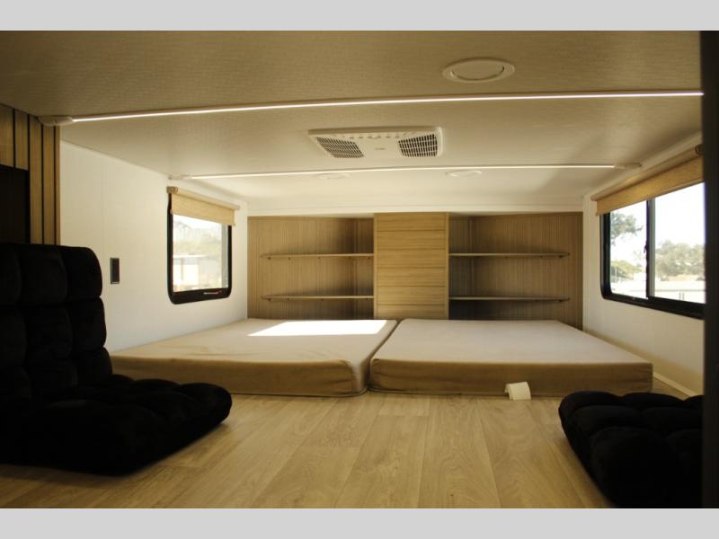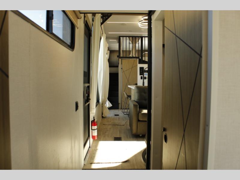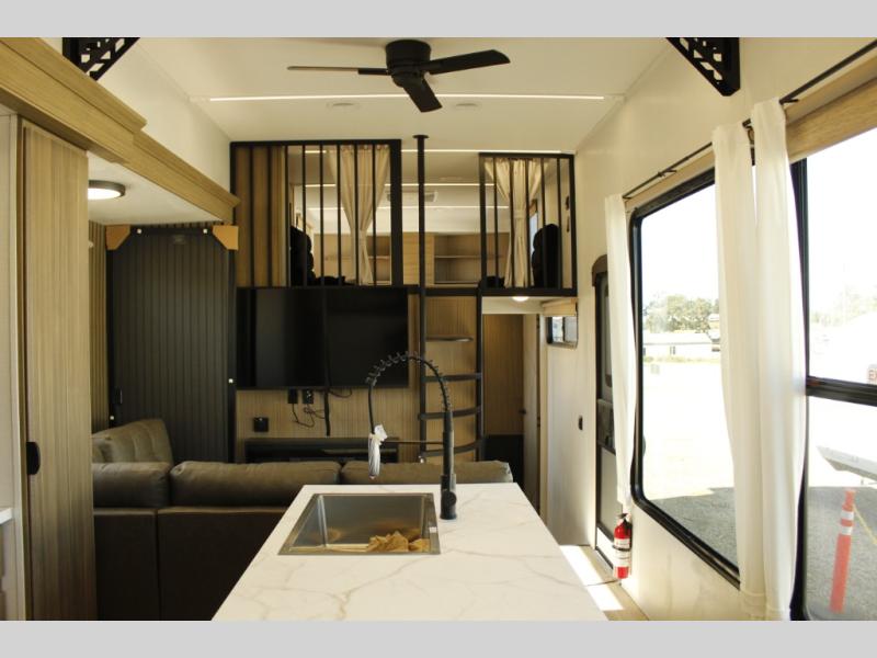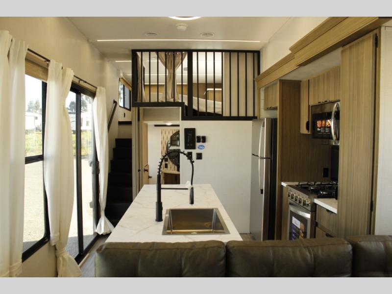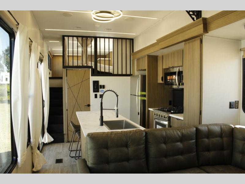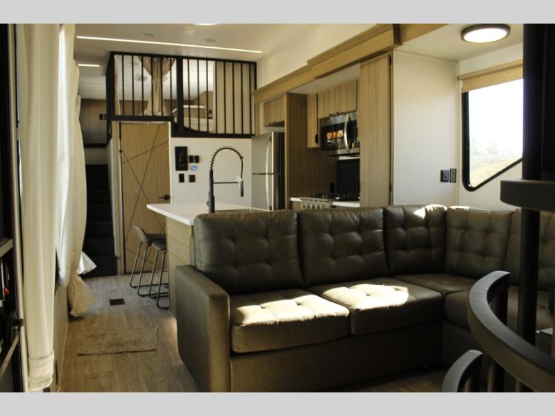 Stretch out, spread out, and basically move in. This destination trailer gives you a front and rear bedroom, each with a king-size bed so everyone gets a true residential sleep space, not just the primary occupants. Each bedroom is near its own full bathroom, making it perfect for couples traveling together, extended family, or long-term guests. In the middle, the living area centers around a spacious L-shaped sofa that’s ideal for lounging, movie nights, or extra sleeping space when needed. The kitchen feels like home too, thanks to a generous kitchen island that adds prep space and storage, plus stainless steel appliances that look sharp and make everyday cooking feel easy and residential.