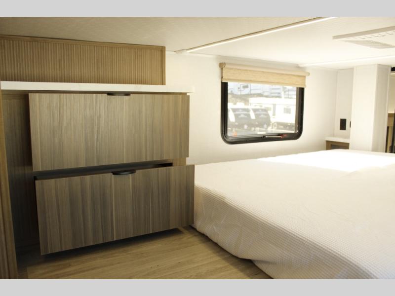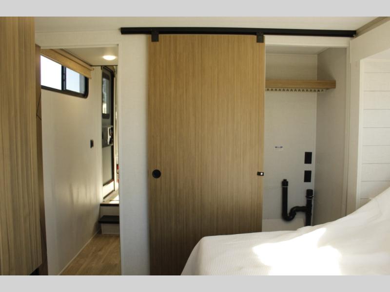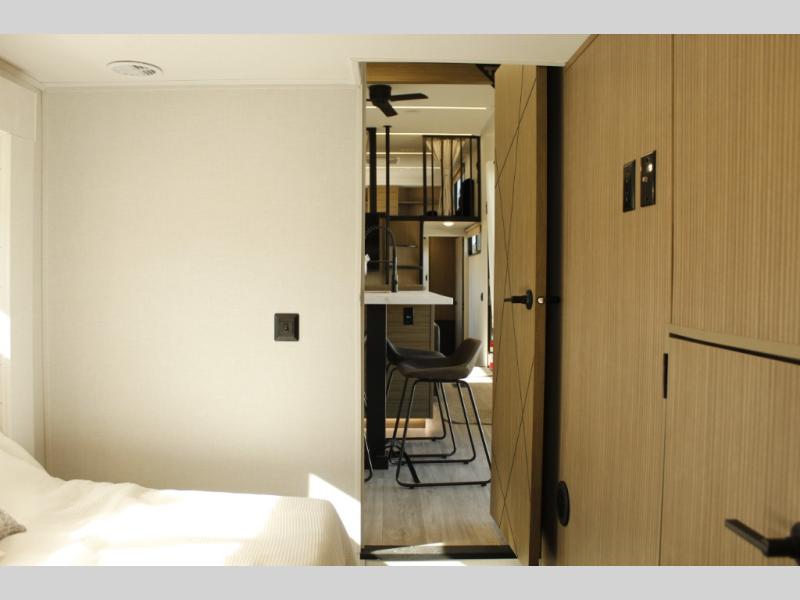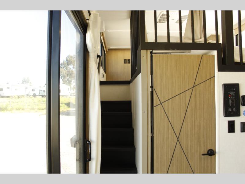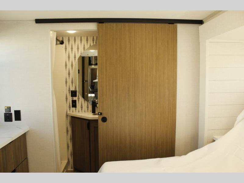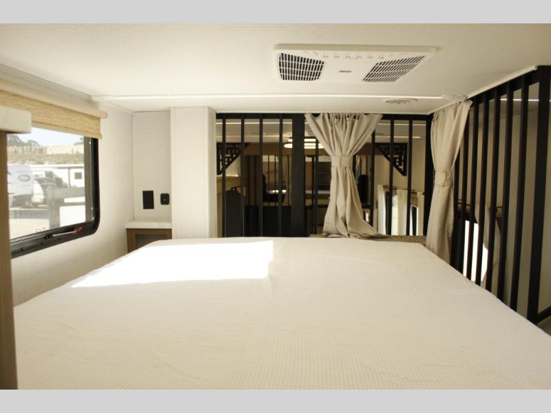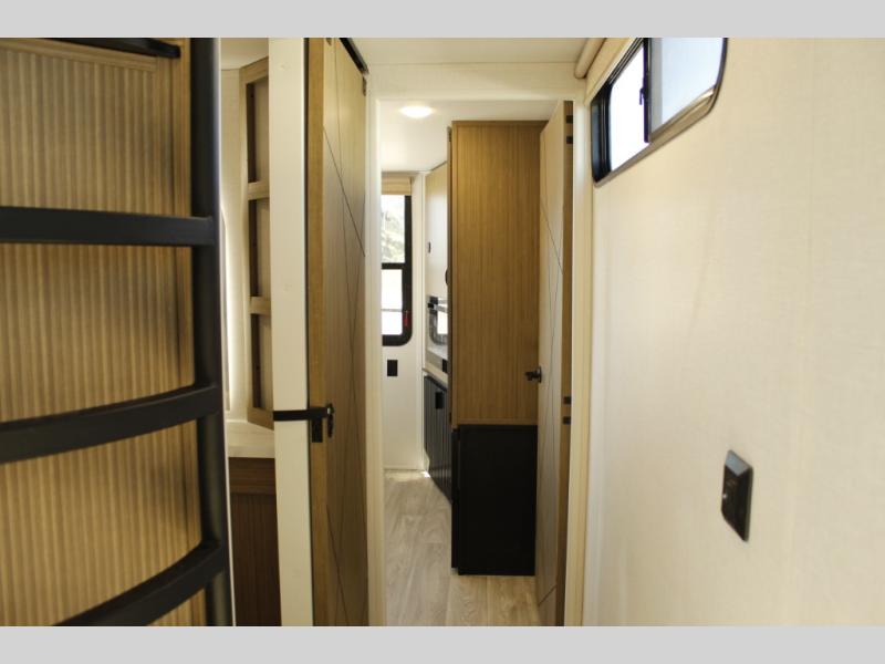 Stretch out, spread out, and basically move in. This destination trailer gives you a front and rear bedroom, each with a king-size bed so everyone gets a true residential sleep space, not just the primary occupants. Each bedroom is near its own full bathroom, making it perfect for couples traveling together, extended family, or long-term guests. In the middle, the living area centers around a spacious L-shaped sofa that’s ideal for lounging, movie nights, or extra sleeping space when needed. The kitchen feels like home too, thanks to a generous kitchen island that adds prep space and storage, plus stainless steel appliances that look sharp and make everyday cooking feel easy and residential.