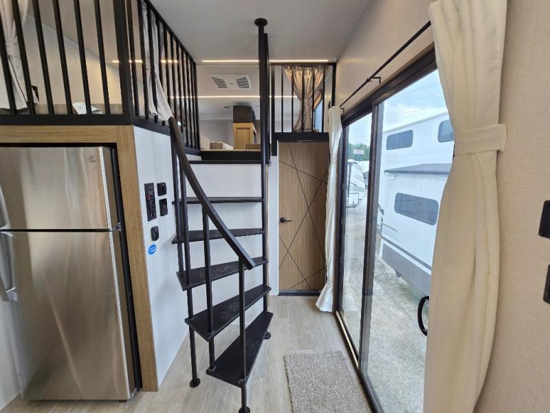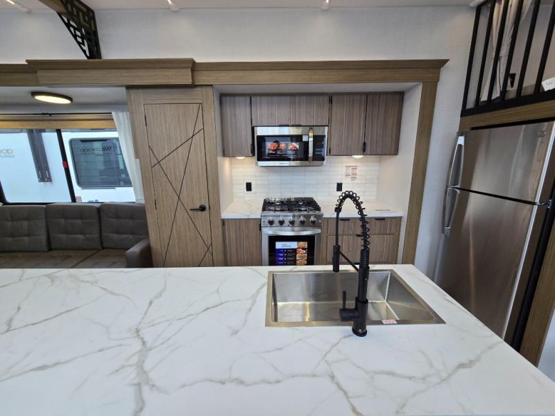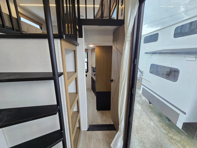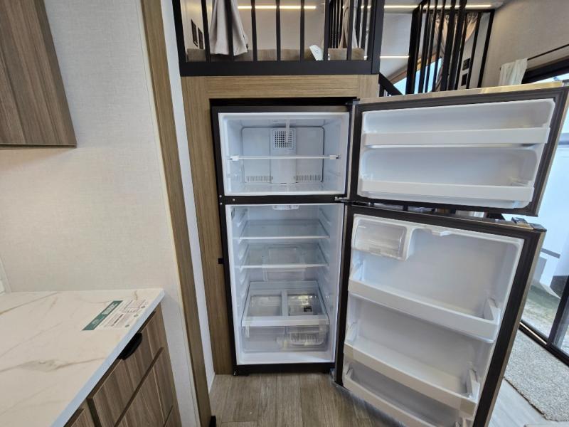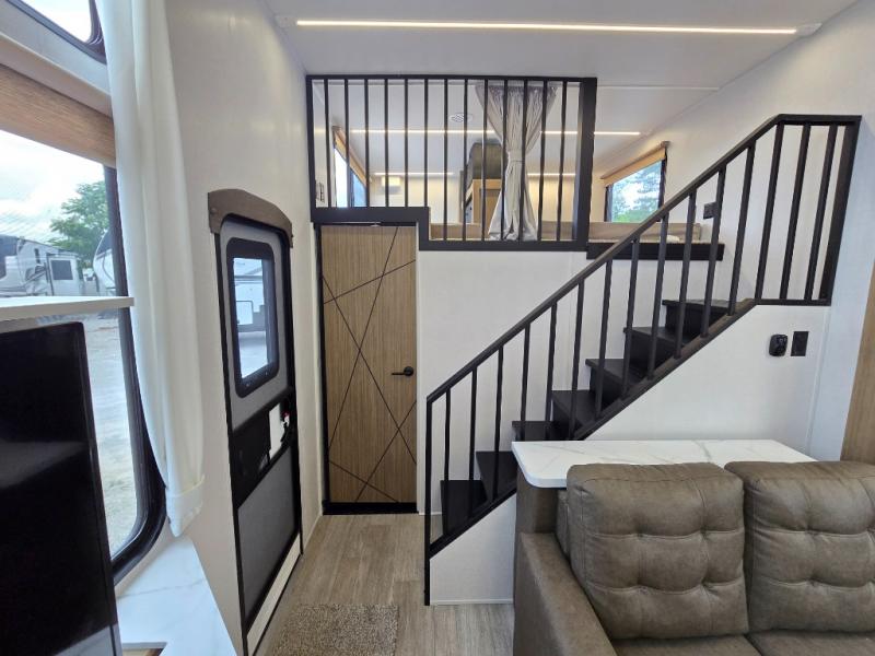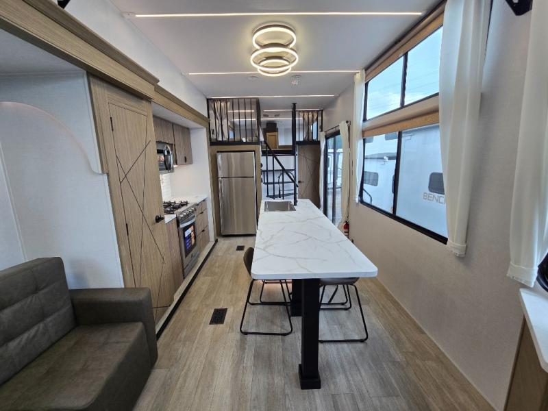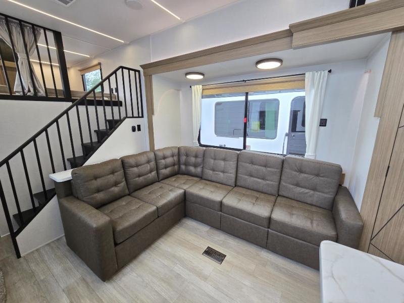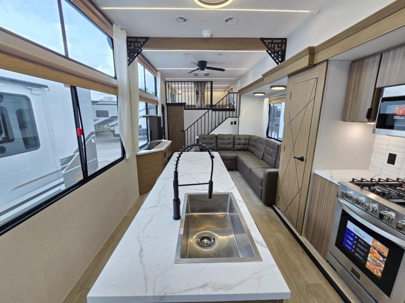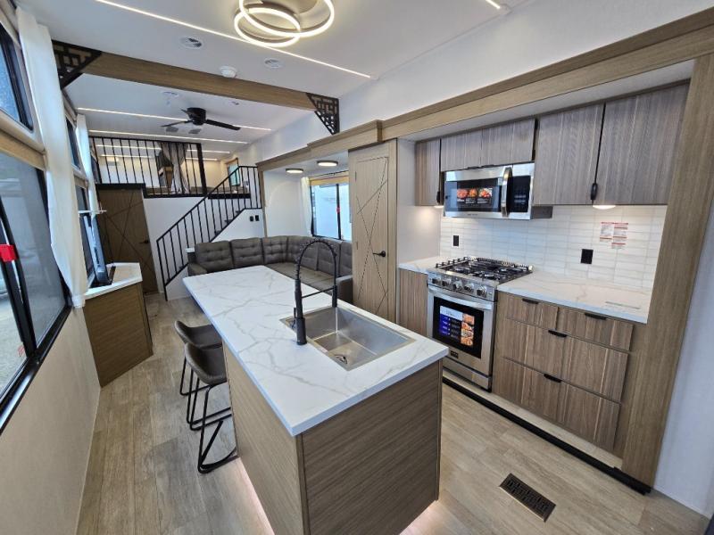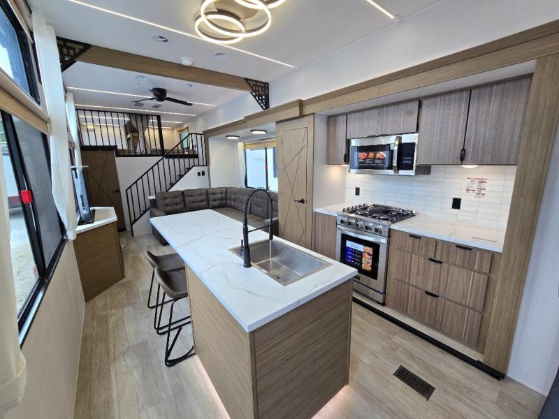 Indulge in the ultimate getaway experience with our opulent destination trailer. The lavish rear bathroom features a spacious walk-in shower, ideal for rejuvenating after a long day. In the living area, the plush sectional sofa is a hub for socializing and relaxation, while the entertainment center with a fireplace creates a warm and inviting ambiance. The kitchen is equipped with a pantry, an elegant kitchen island with stools, and ample overhead cabinets, making meal prep and dining a true delight. Additionally, the spacious side-by-side refrigerator offers ample storage for your favorite foods and beverages. The majestic front bedroom is a serene retreat, featuring a sumptuous king bed with versa VersaTilt, a stylish dresser, and generous storage space. The charming loft is the cherry on top, perfect for kids or adults alike, with four cozy bunk mats and spiral steps leading up to a peaceful sleeping nook.