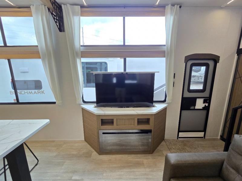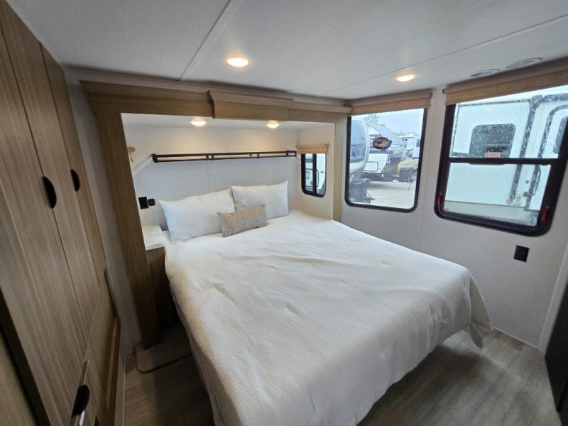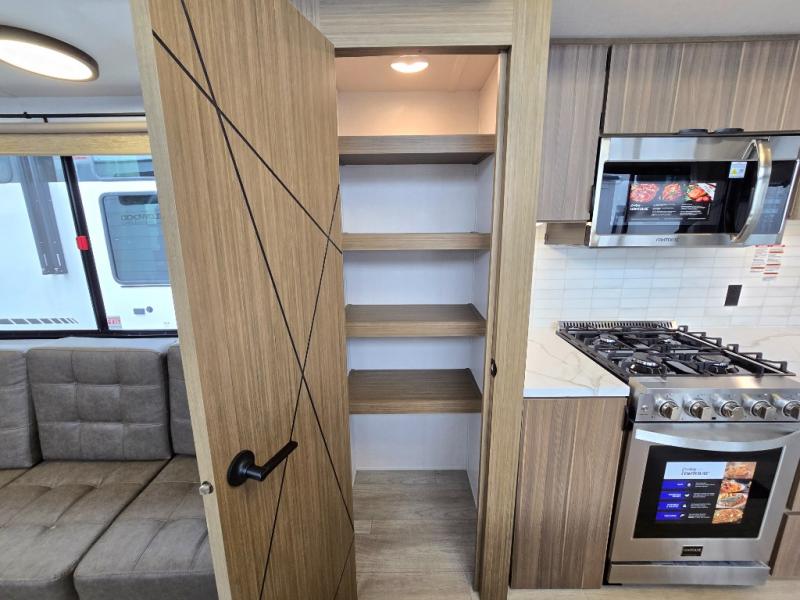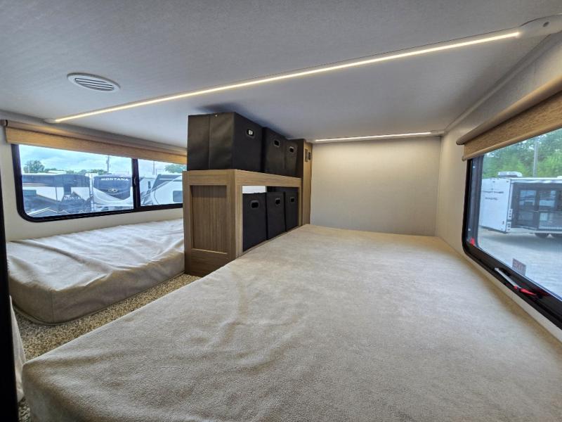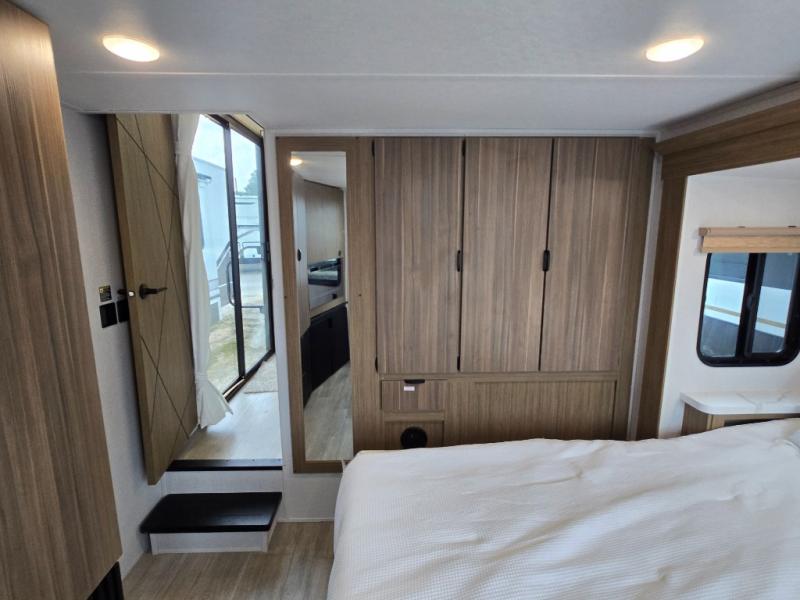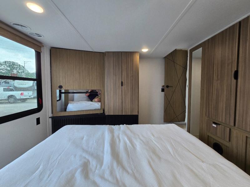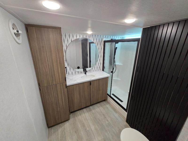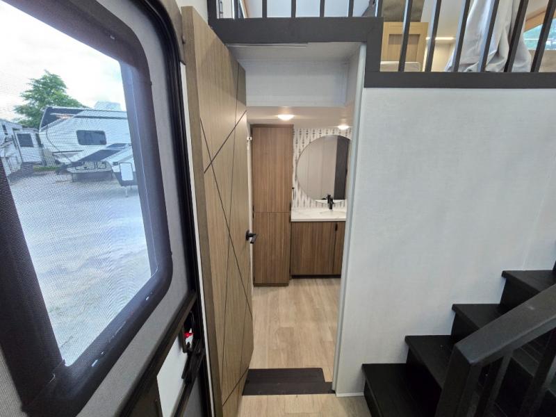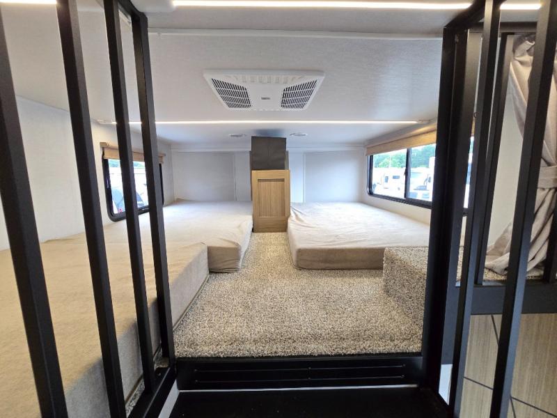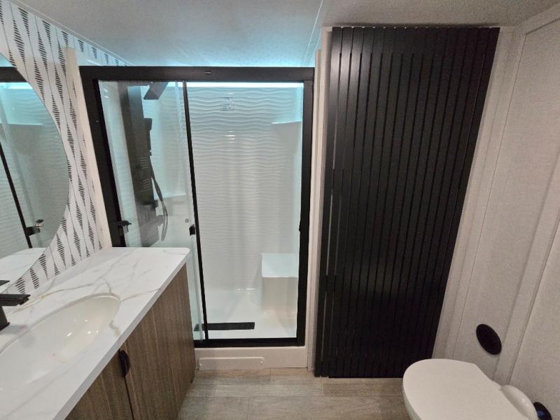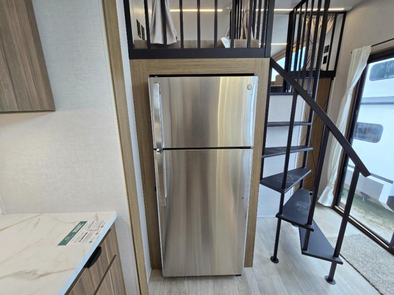 Indulge in the ultimate getaway experience with our opulent destination trailer. The lavish rear bathroom features a spacious walk-in shower, ideal for rejuvenating after a long day. In the living area, the plush sectional sofa is a hub for socializing and relaxation, while the entertainment center with a fireplace creates a warm and inviting ambiance. The kitchen is equipped with a pantry, an elegant kitchen island with stools, and ample overhead cabinets, making meal prep and dining a true delight. Additionally, the spacious side-by-side refrigerator offers ample storage for your favorite foods and beverages. The majestic front bedroom is a serene retreat, featuring a sumptuous king bed with versa VersaTilt, a stylish dresser, and generous storage space. The charming loft is the cherry on top, perfect for kids or adults alike, with four cozy bunk mats and spiral steps leading up to a peaceful sleeping nook.