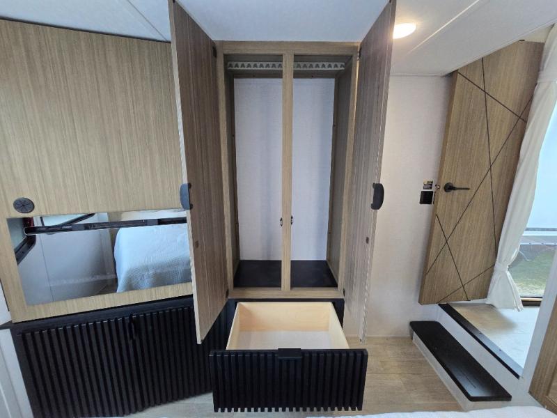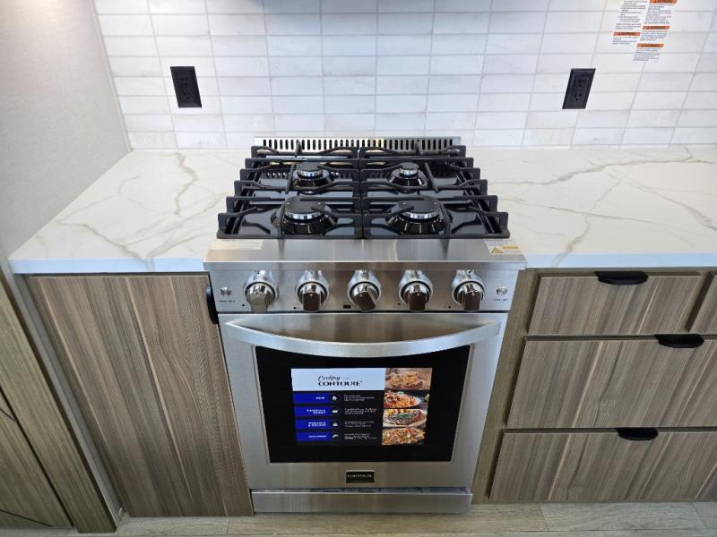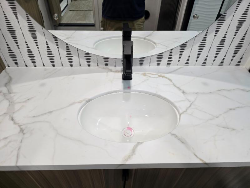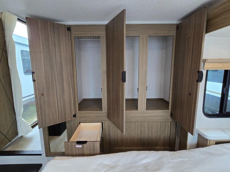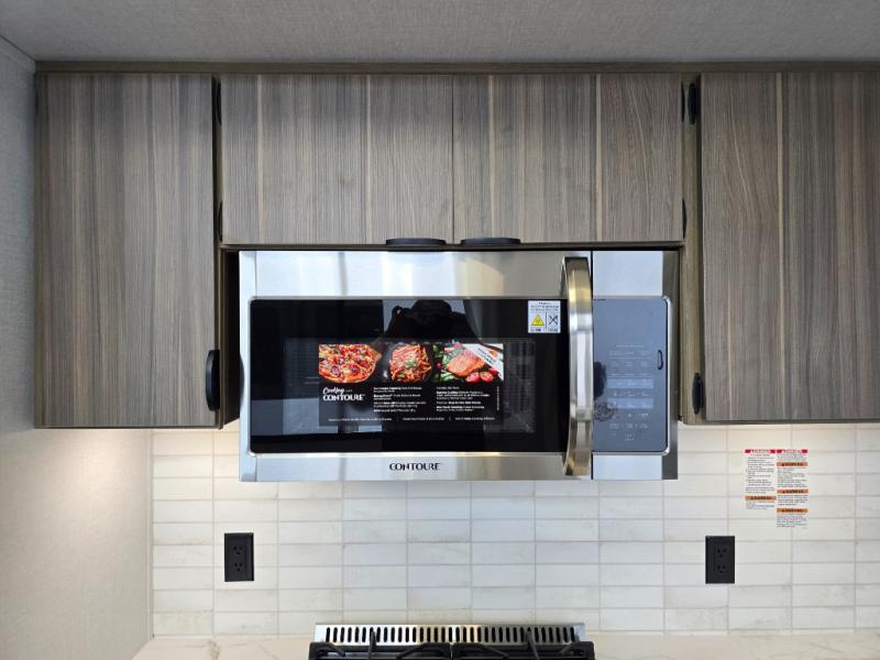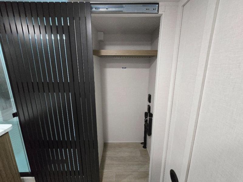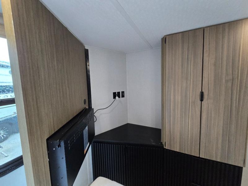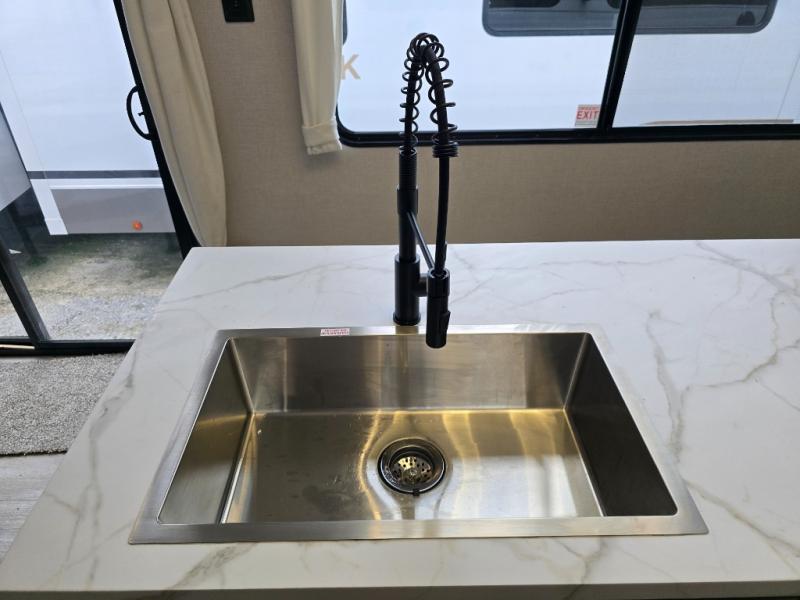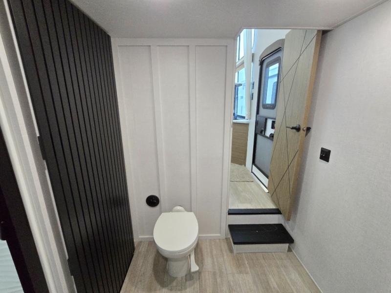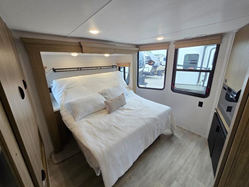 Indulge in the ultimate getaway experience with our opulent destination trailer. The lavish rear bathroom features a spacious walk-in shower, ideal for rejuvenating after a long day. In the living area, the plush sectional sofa is a hub for socializing and relaxation, while the entertainment center with a fireplace creates a warm and inviting ambiance. The kitchen is equipped with a pantry, an elegant kitchen island with stools, and ample overhead cabinets, making meal prep and dining a true delight. Additionally, the spacious side-by-side refrigerator offers ample storage for your favorite foods and beverages. The majestic front bedroom is a serene retreat, featuring a sumptuous king bed with versa VersaTilt, a stylish dresser, and generous storage space. The charming loft is the cherry on top, perfect for kids or adults alike, with four cozy bunk mats and spiral steps leading up to a peaceful sleeping nook.