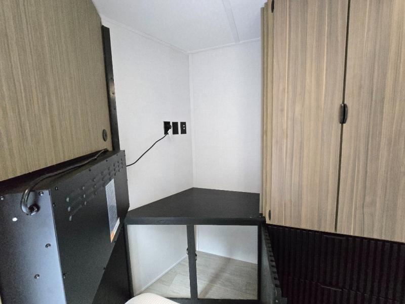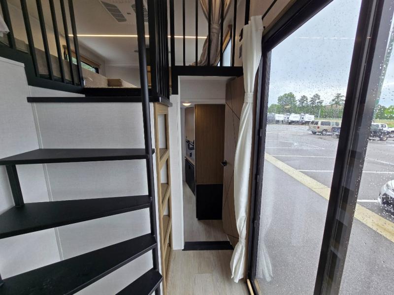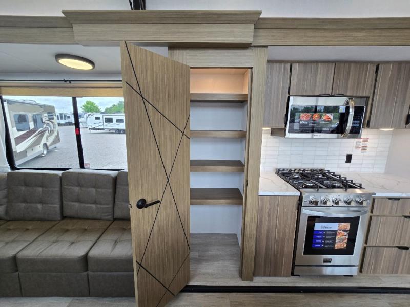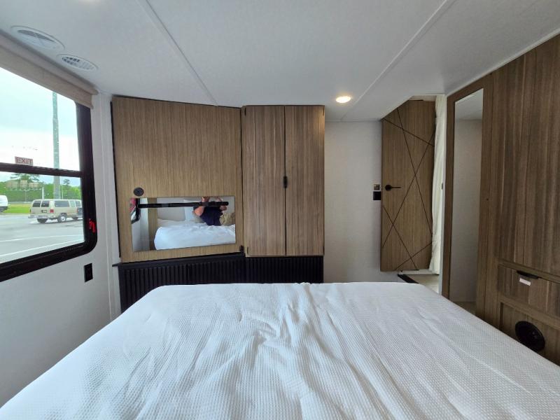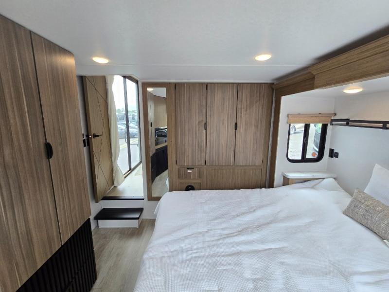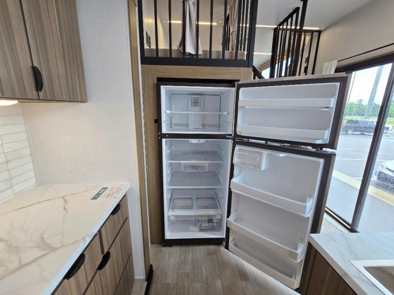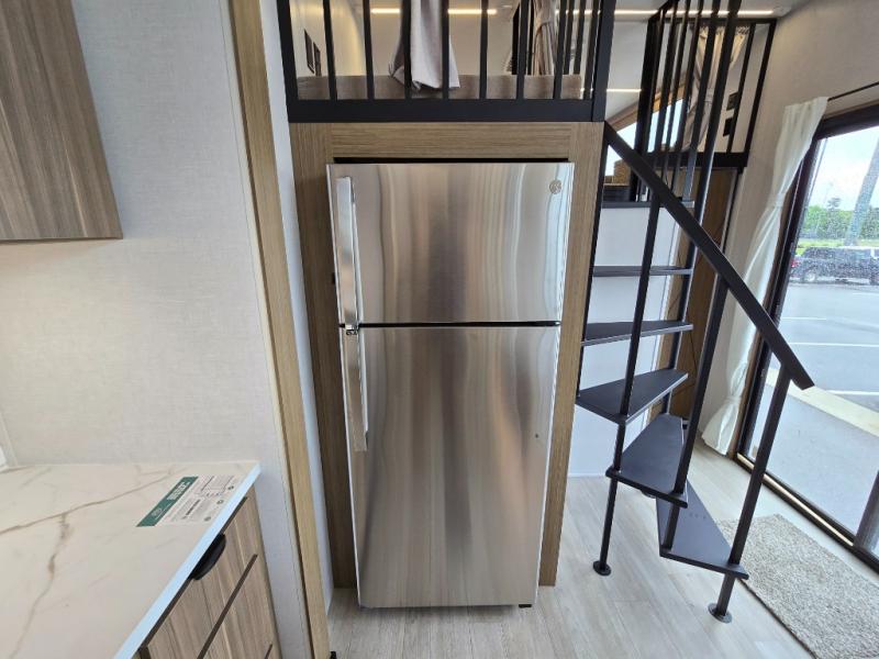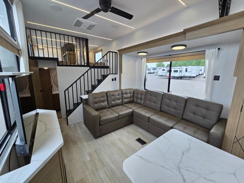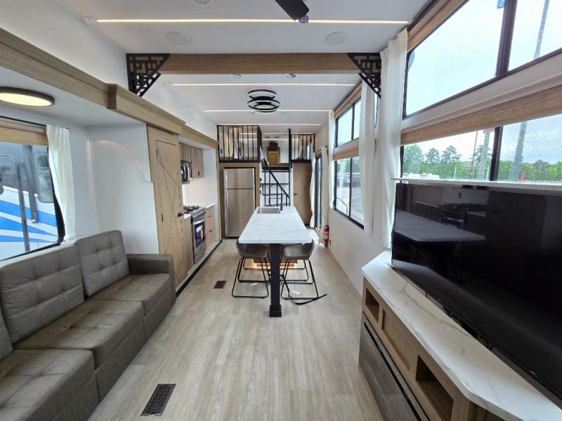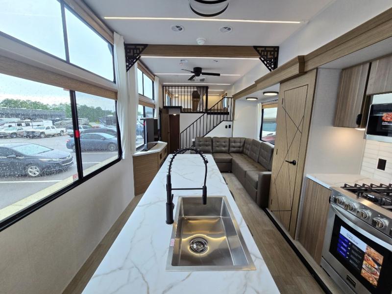 Indulge in the ultimate getaway experience with our opulent destination trailer. The lavish rear bathroom features a spacious walk-in shower, ideal for rejuvenating after a long day. In the living area, the plush sectional sofa is a hub for socializing and relaxation, while the entertainment center with a fireplace creates a warm and inviting ambiance. The kitchen is equipped with a pantry, an elegant kitchen island with stools, and ample overhead cabinets, making meal prep and dining a true delight. Additionally, the spacious side-by-side refrigerator offers ample storage for your favorite foods and beverages. The majestic front bedroom is a serene retreat, featuring a sumptuous king bed with versa VersaTilt, a stylish dresser, and generous storage space. The charming loft is the cherry on top, perfect for kids or adults alike, with four cozy bunk mats and spiral steps leading up to a peaceful sleeping nook.