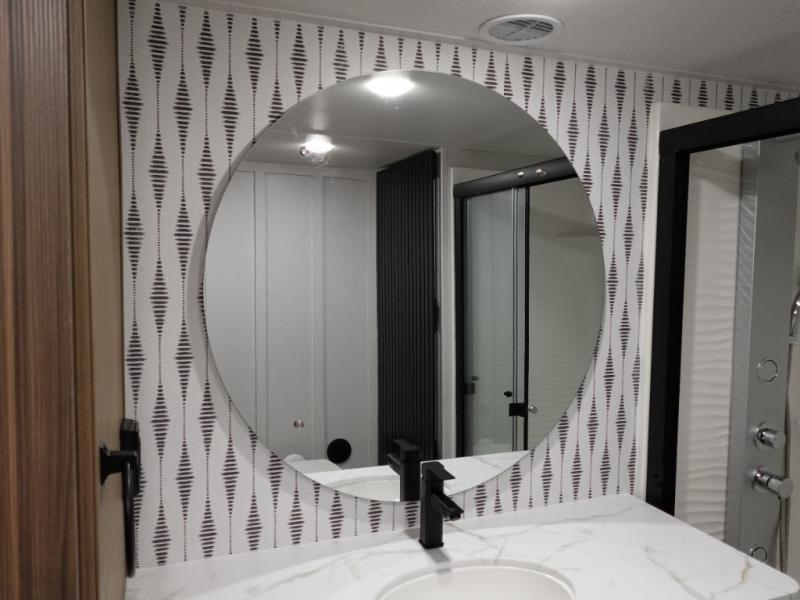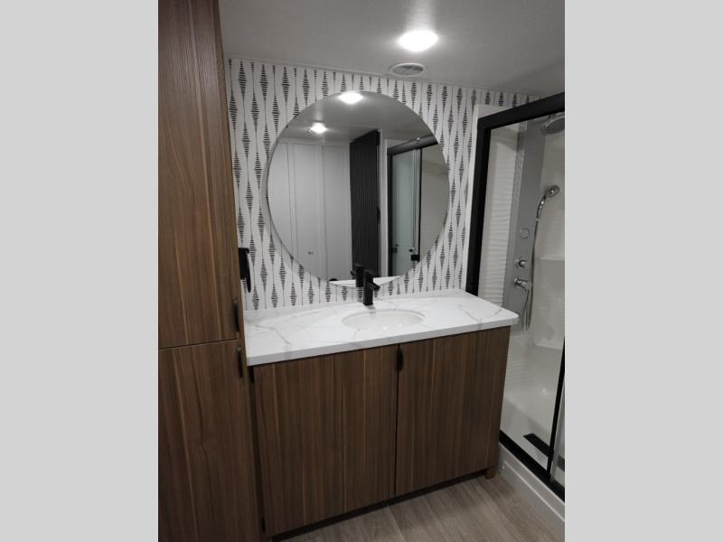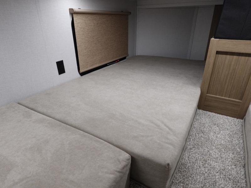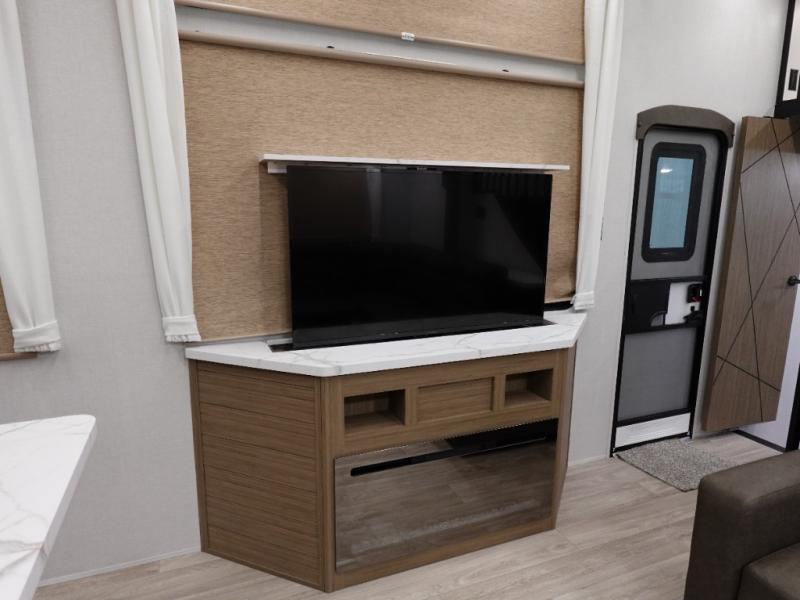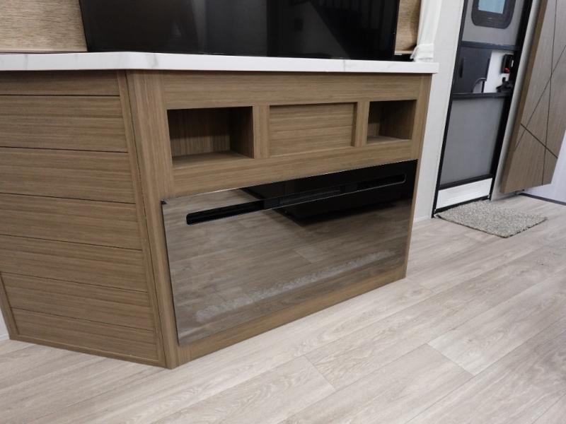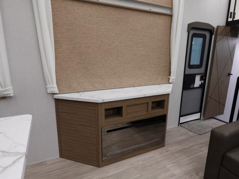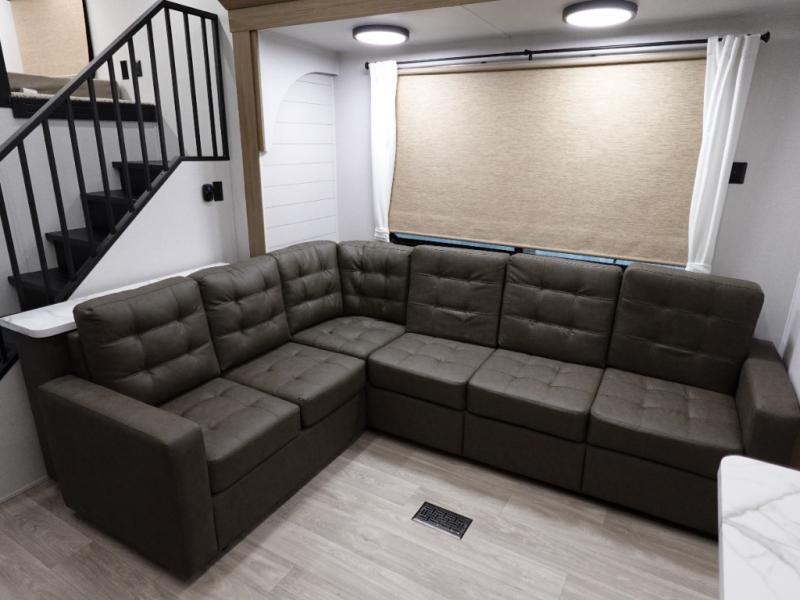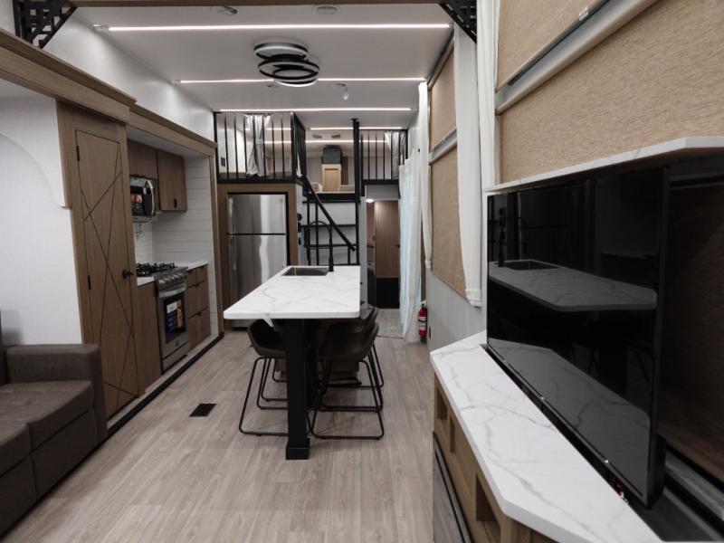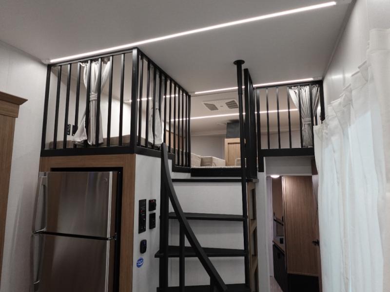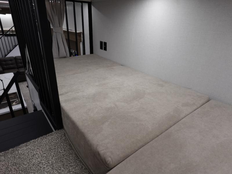 Indulge in the ultimate getaway experience with our opulent destination trailer. The lavish rear bathroom features a spacious walk-in shower, ideal for rejuvenating after a long day. In the living area, the plush sectional sofa is a hub for socializing and relaxation, while the entertainment center with a fireplace creates a warm and inviting ambiance. The kitchen is equipped with a pantry, an elegant kitchen island with stools, and ample overhead cabinets, making meal prep and dining a true delight. Additionally, the spacious side-by-side refrigerator offers ample storage for your favorite foods and beverages. The majestic front bedroom is a serene retreat, featuring a sumptuous king bed with versa VersaTilt, a stylish dresser, and generous storage space. The charming loft is the cherry on top, perfect for kids or adults alike, with four cozy bunk mats and spiral steps leading up to a peaceful sleeping nook.