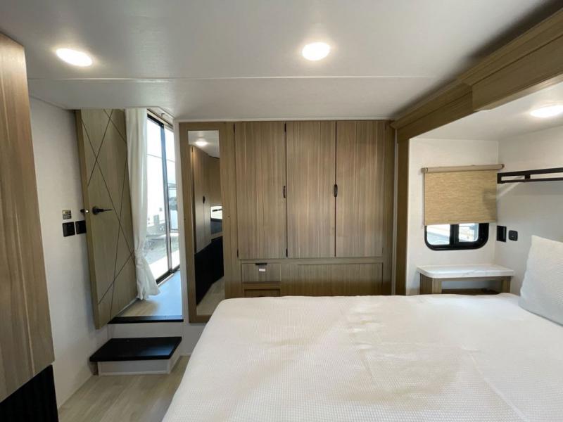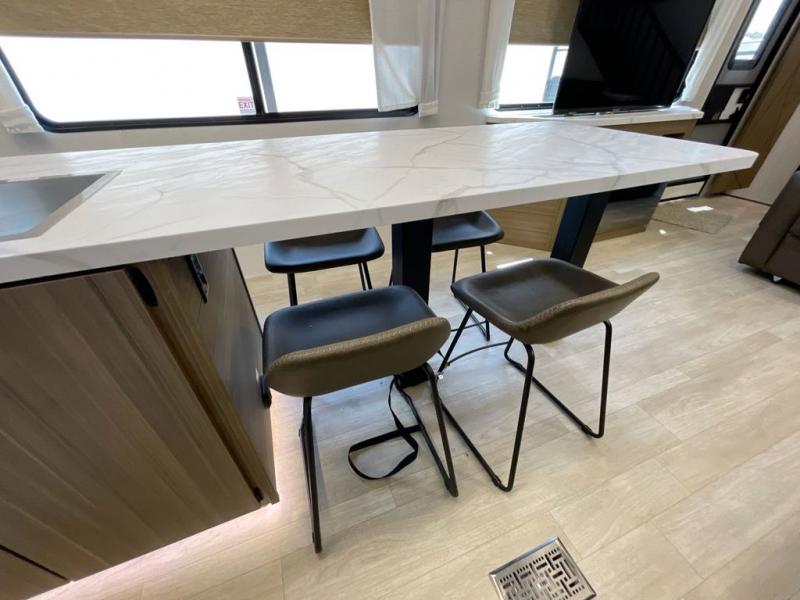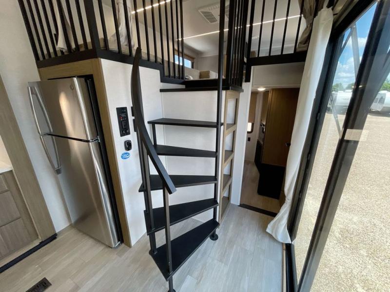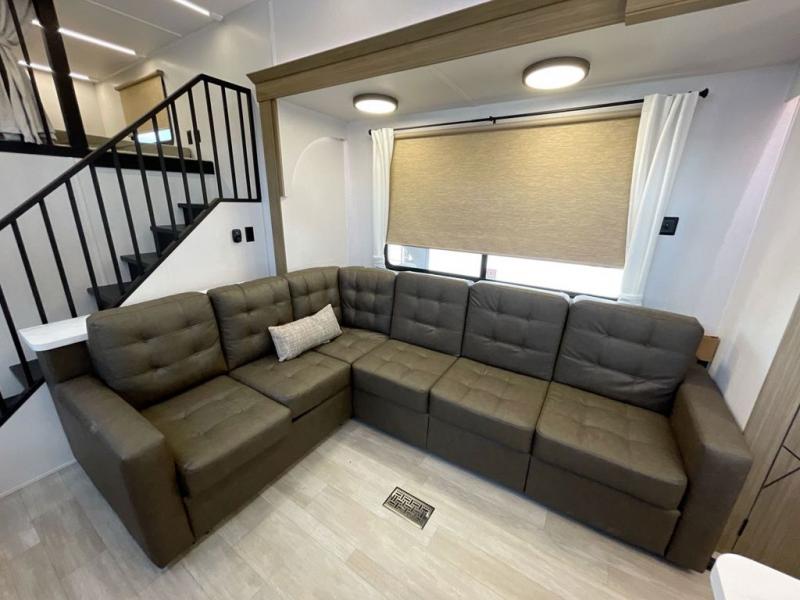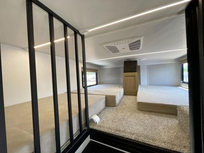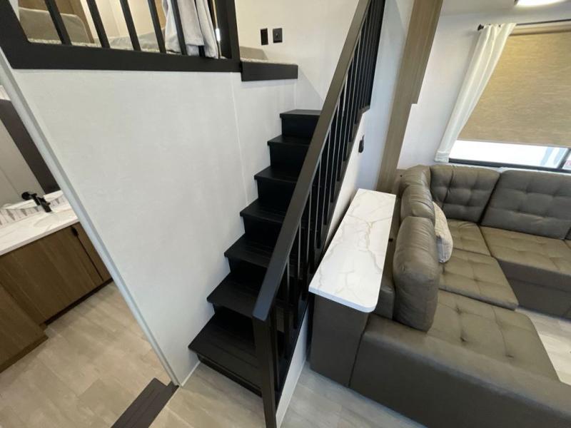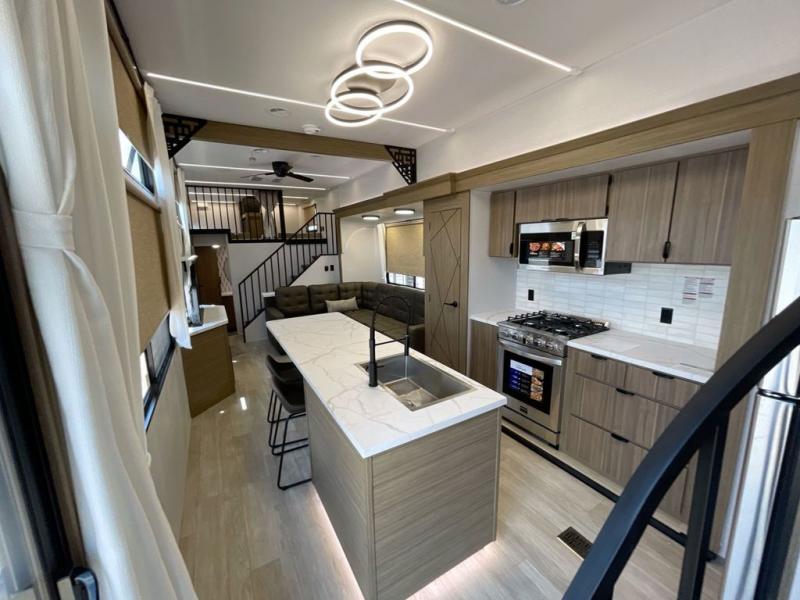 Indulge in the ultimate getaway experience with our opulent destination trailer. The lavish rear bathroom features a spacious walk-in shower, ideal for rejuvenating after a long day. In the living area, the plush sectional sofa is a hub for socializing and relaxation, while the entertainment center with a fireplace creates a warm and inviting ambiance. The kitchen is equipped with a pantry, an elegant kitchen island with stools, and ample overhead cabinets, making meal prep and dining a true delight. Additionally, the spacious side-by-side refrigerator offers ample storage for your favorite foods and beverages. The majestic front bedroom is a serene retreat, featuring a sumptuous king bed with versa VersaTilt, a stylish dresser, and generous storage space. The charming loft is the cherry on top, perfect for kids or adults alike, with four cozy bunk mats and spiral steps leading up to a peaceful sleeping nook.
