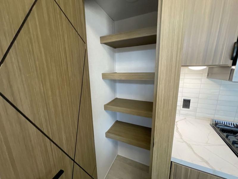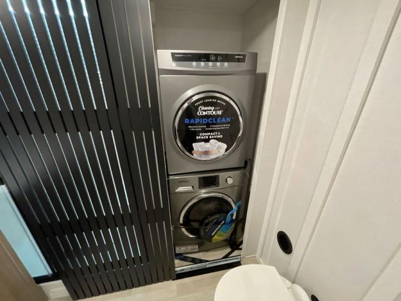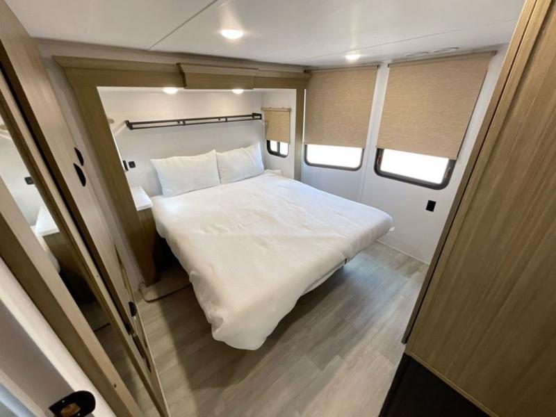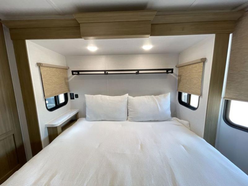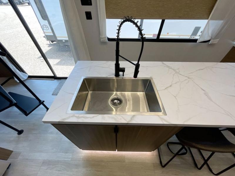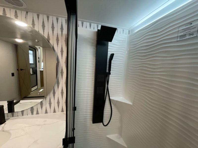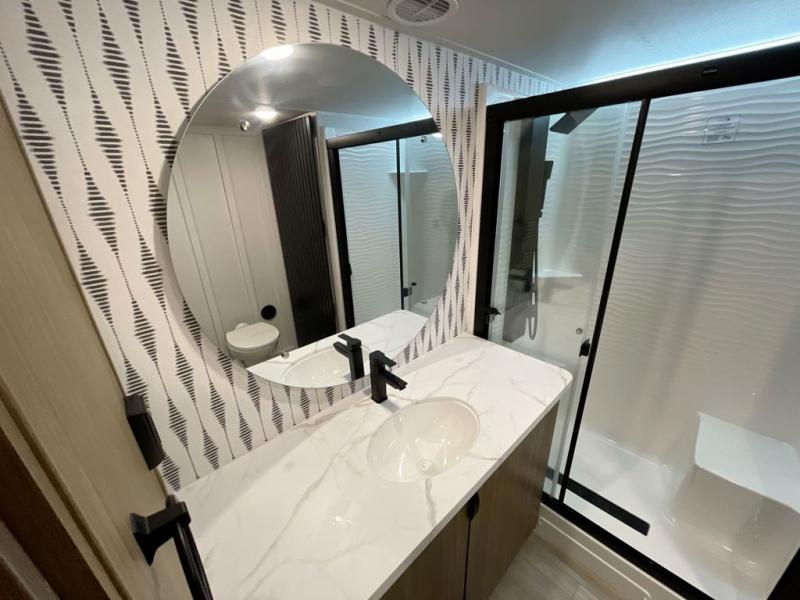 Indulge in the ultimate getaway experience with our opulent destination trailer. The lavish rear bathroom features a spacious walk-in shower, ideal for rejuvenating after a long day. In the living area, the plush sectional sofa is a hub for socializing and relaxation, while the entertainment center with a fireplace creates a warm and inviting ambiance. The kitchen is equipped with a pantry, an elegant kitchen island with stools, and ample overhead cabinets, making meal prep and dining a true delight. Additionally, the spacious side-by-side refrigerator offers ample storage for your favorite foods and beverages. The majestic front bedroom is a serene retreat, featuring a sumptuous king bed with versa VersaTilt, a stylish dresser, and generous storage space. The charming loft is the cherry on top, perfect for kids or adults alike, with four cozy bunk mats and spiral steps leading up to a peaceful sleeping nook.