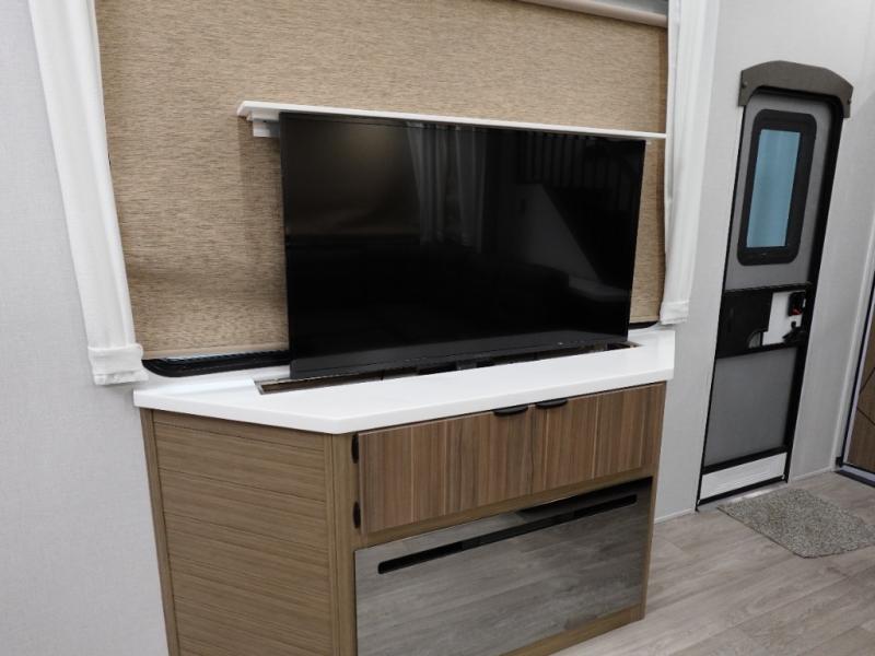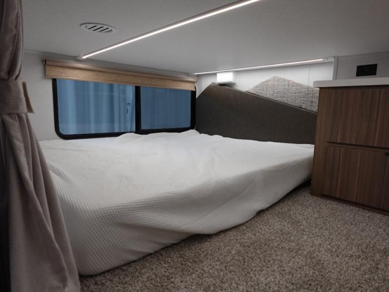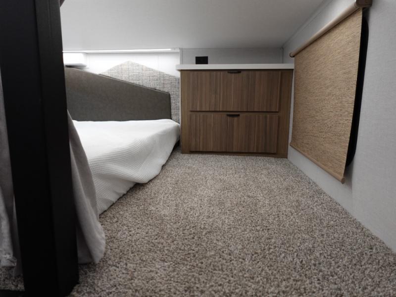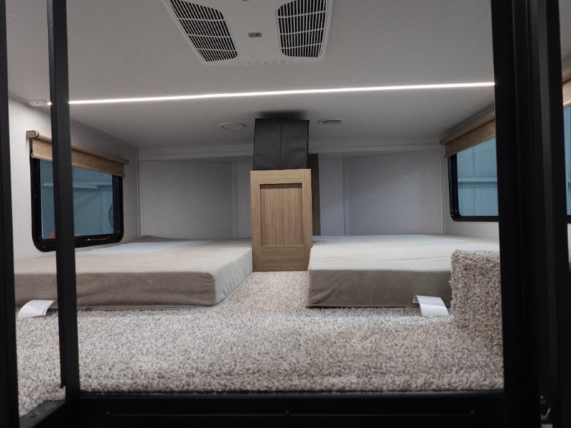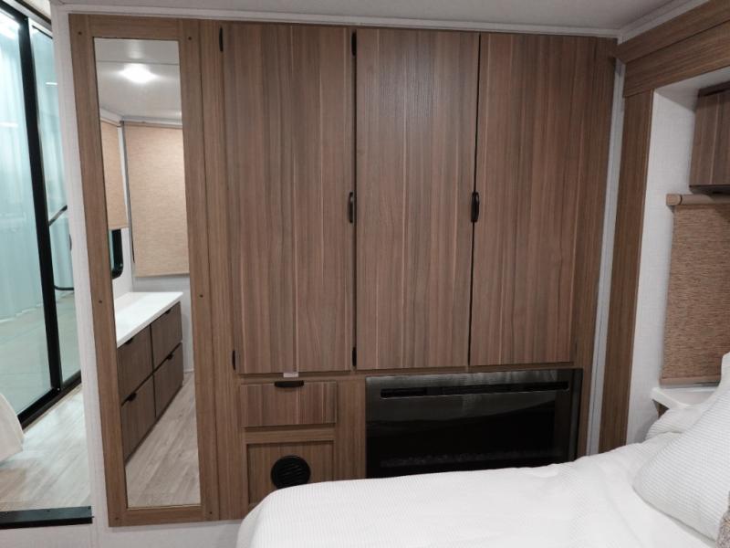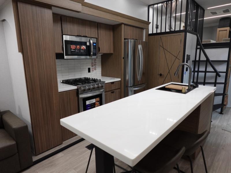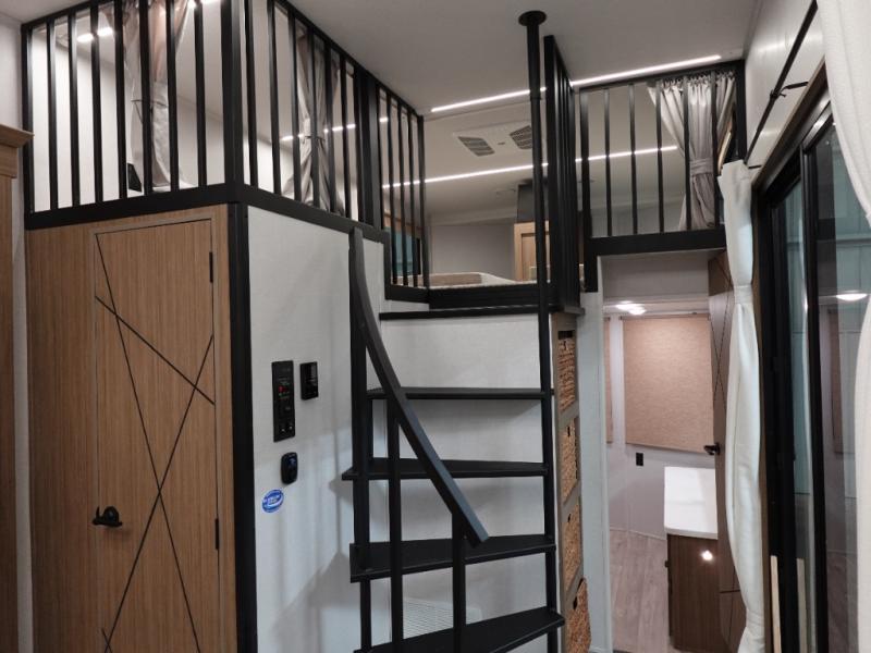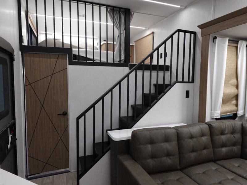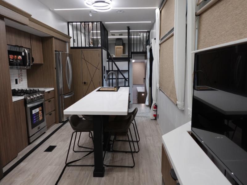 Your dream destination trailer awaits! The rear bathroom is a haven for convenience and comfort, featuring a spacious walk-in shower, a linen closet, and washer and dryer prep. The sectional sofa is a hub for socializing and relaxation, and the entertainment center with fireplace creates a warm and inviting ambiance. The ceiling fan adds a touch of elegance to the living area. The kitchen is well-equipped with a roll-out pantry, microwave, and side-by-side refrigerator, making meal prep and dining a breeze. Plus, the kitchen island with stools is perfect for casual meals or socializing. The half bath provides additional convenience for guests. The front bedroom is a serene retreat, featuring a custom king bed with VersaTilt, a stylish dresser, and plenty of storage space. Finishing with the loft area, which is perfect for kids or adults alike, with a versatile queen bunk mattress and two 42” x 74” bunk mats, providing ample sleeping space for family and friends