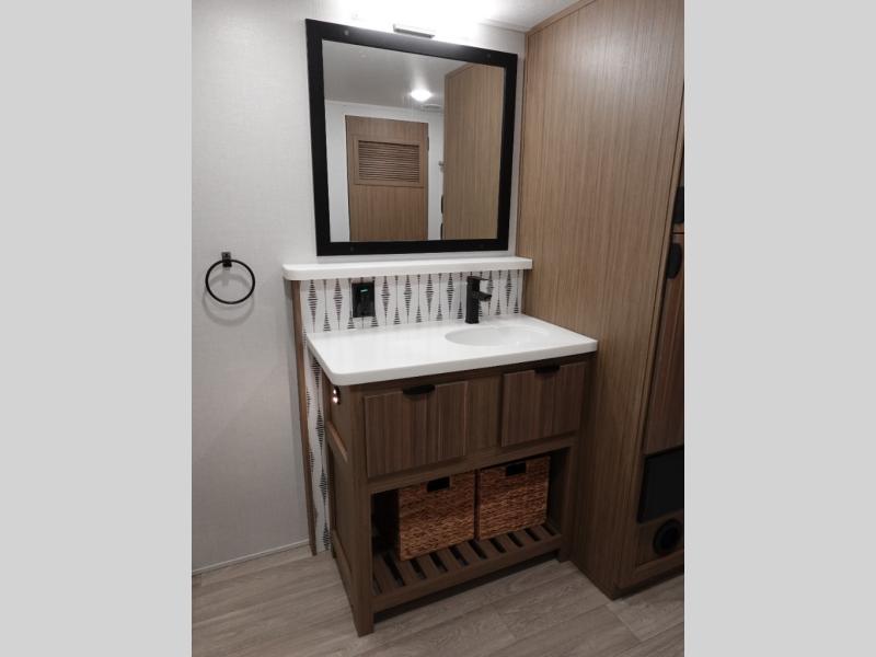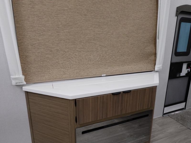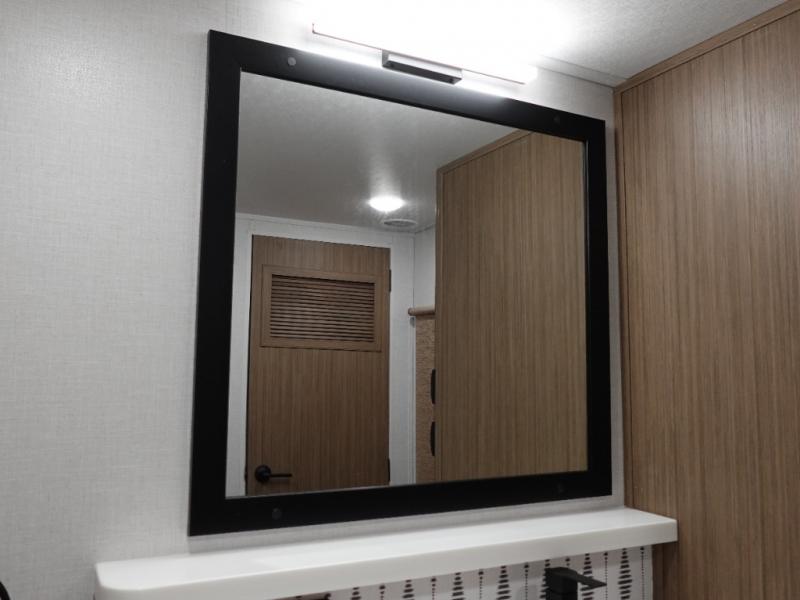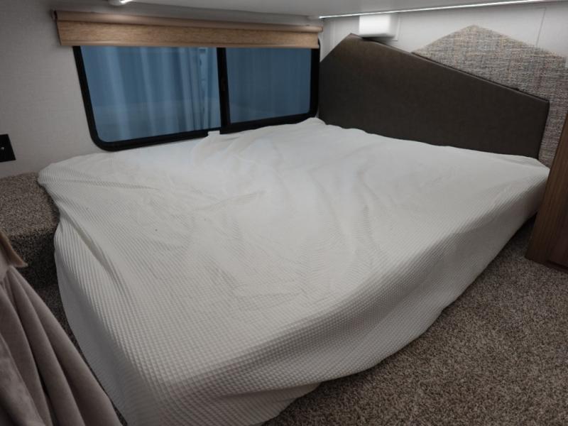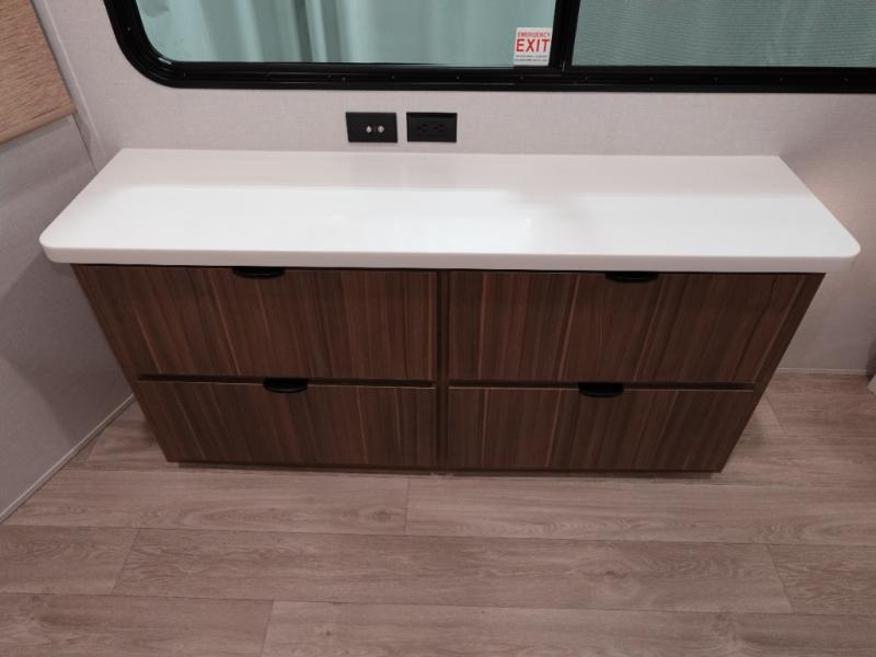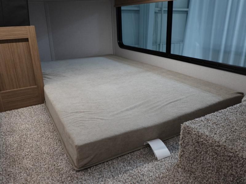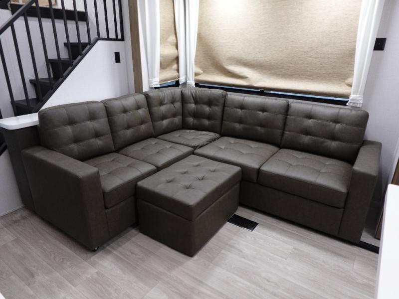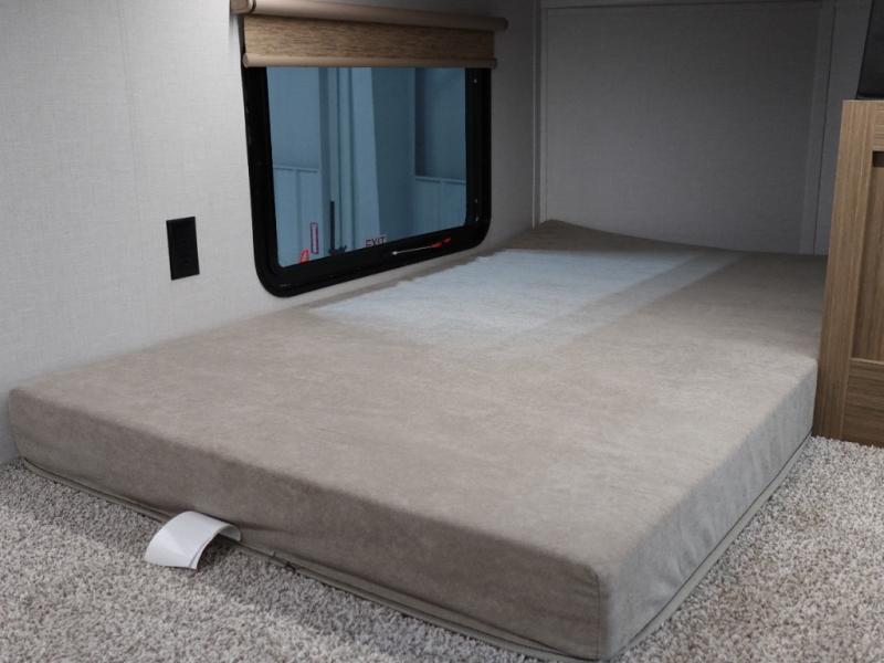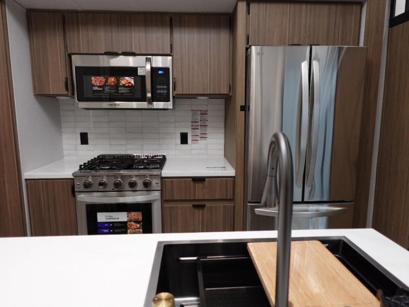 Your dream destination trailer awaits! The rear bathroom is a haven for convenience and comfort, featuring a spacious walk-in shower, a linen closet, and washer and dryer prep. The sectional sofa is a hub for socializing and relaxation, and the entertainment center with fireplace creates a warm and inviting ambiance. The ceiling fan adds a touch of elegance to the living area. The kitchen is well-equipped with a roll-out pantry, microwave, and side-by-side refrigerator, making meal prep and dining a breeze. Plus, the kitchen island with stools is perfect for casual meals or socializing. The half bath provides additional convenience for guests. The front bedroom is a serene retreat, featuring a custom king bed with VersaTilt, a stylish dresser, and plenty of storage space. Finishing with the loft area, which is perfect for kids or adults alike, with a versatile queen bunk mattress and two 42” x 74” bunk mats, providing ample sleeping space for family and friends
