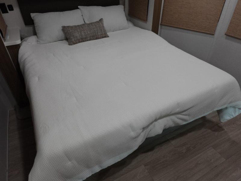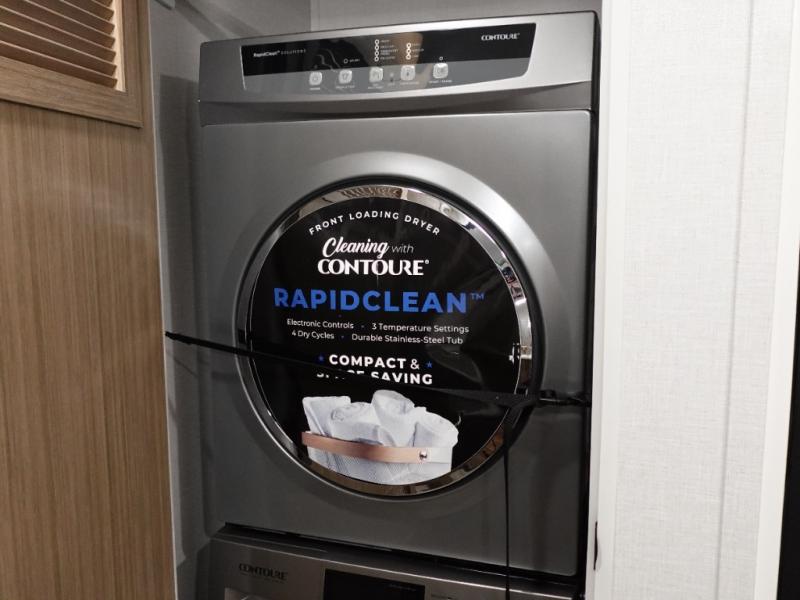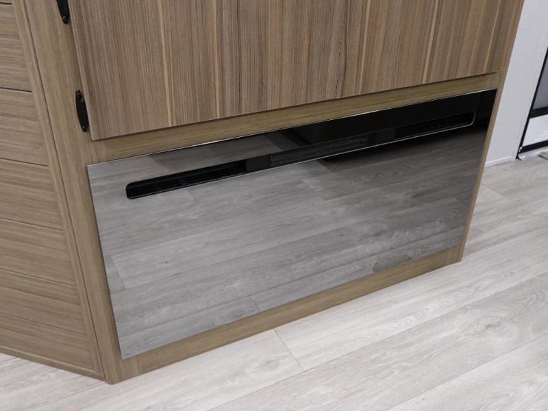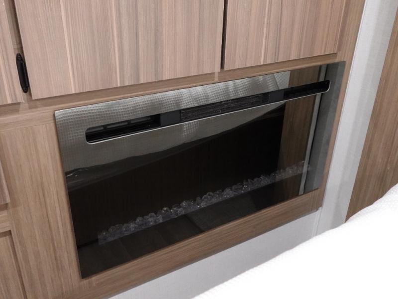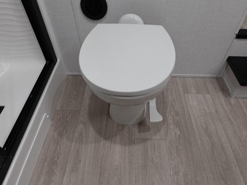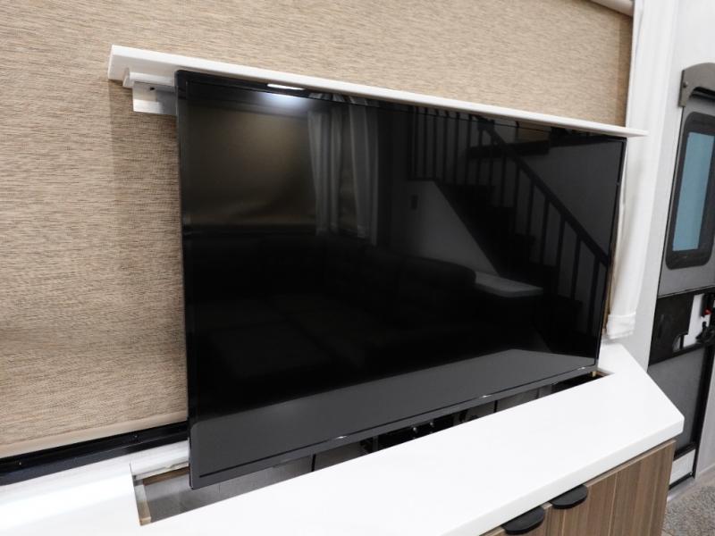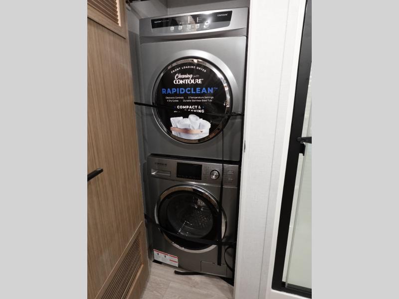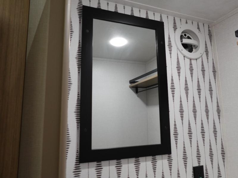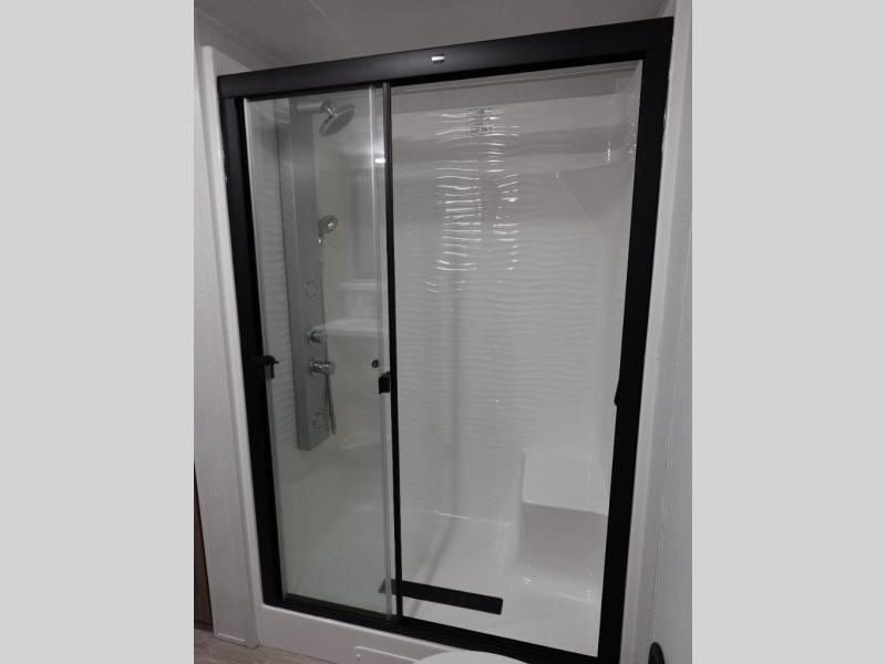 Your dream destination trailer awaits! The rear bathroom is a haven for convenience and comfort, featuring a spacious walk-in shower, a linen closet, and washer and dryer prep. The sectional sofa is a hub for socializing and relaxation, and the entertainment center with fireplace creates a warm and inviting ambiance. The ceiling fan adds a touch of elegance to the living area. The kitchen is well-equipped with a roll-out pantry, microwave, and side-by-side refrigerator, making meal prep and dining a breeze. Plus, the kitchen island with stools is perfect for casual meals or socializing. The half bath provides additional convenience for guests. The front bedroom is a serene retreat, featuring a custom king bed with VersaTilt, a stylish dresser, and plenty of storage space. Finishing with the loft area, which is perfect for kids or adults alike, with a versatile queen bunk mattress and two 42” x 74” bunk mats, providing ample sleeping space for family and friends