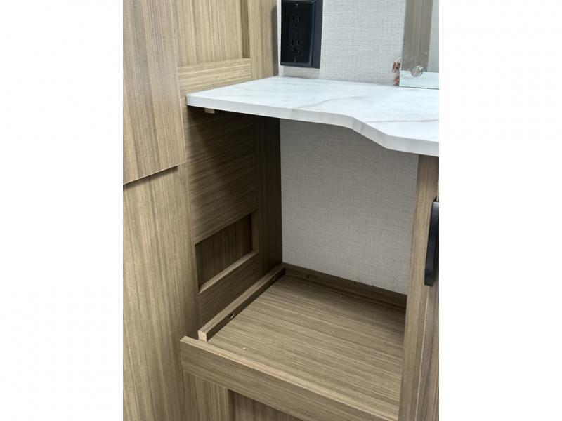 This Wildwood X-Lite travel trailer is a lightweight unit that offers you a spacious rear bathroom including a vanity with a medicine cabinet above, a walk-in radius shower, and additional mirrored linen storage for your towels and things. You will enjoy sleeping on a king-size bed each night, and the booth dinette is another place to relax and enjoy a meal, a card game, or a good book with a hot cup of coffee. The fully-equipped kitchen lets you create meals each day, and the oversized refrigerator will keep all your perishables fresh!