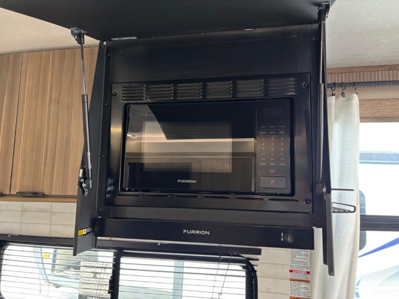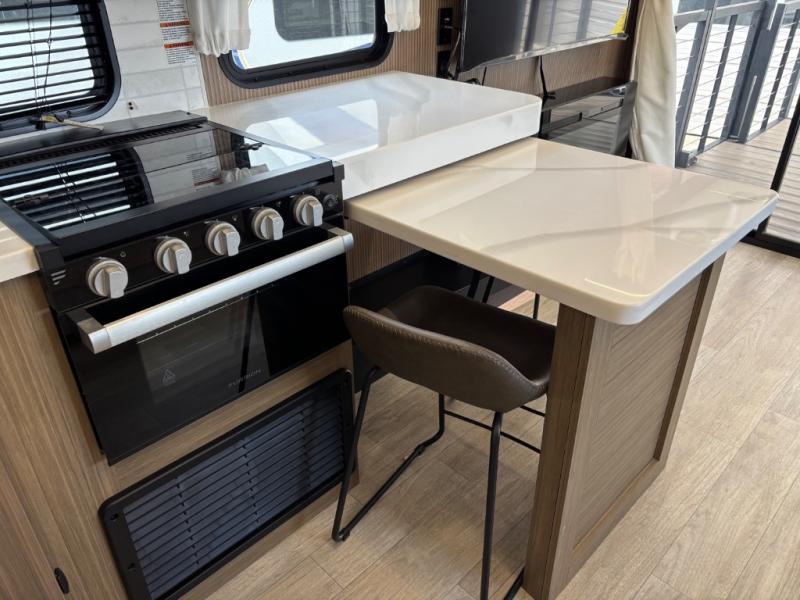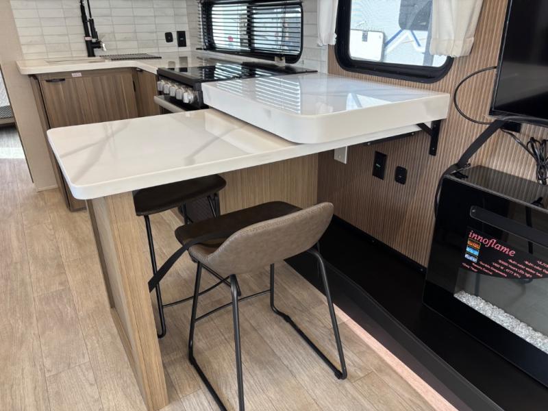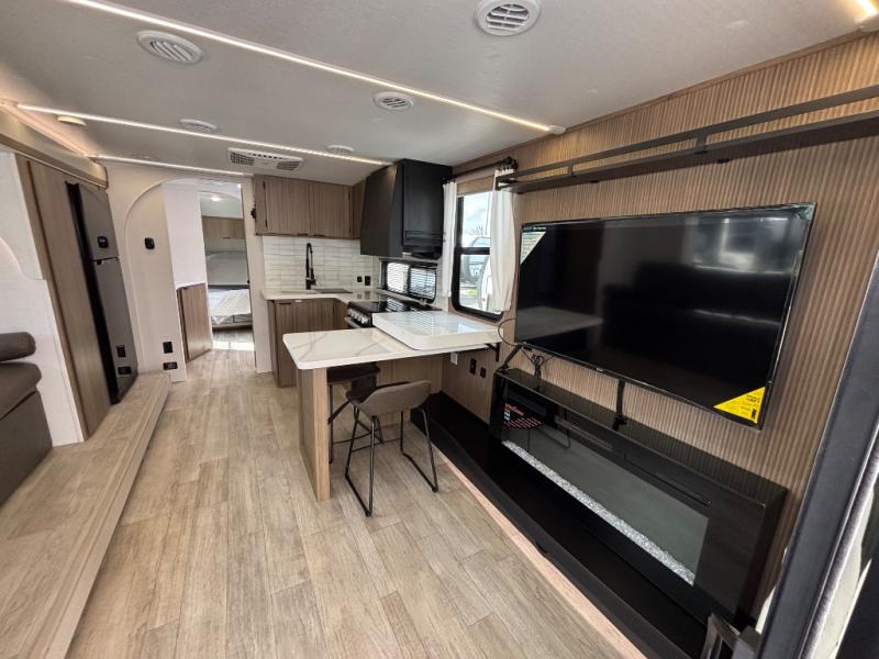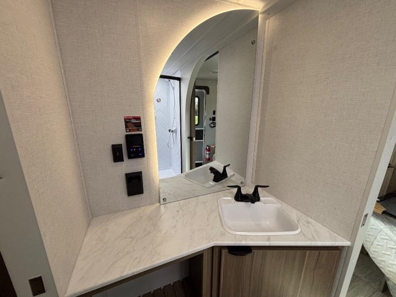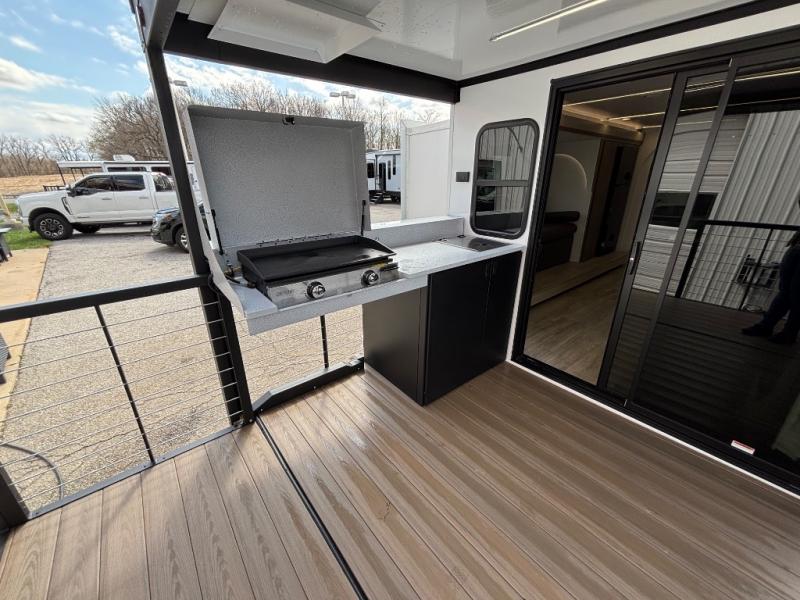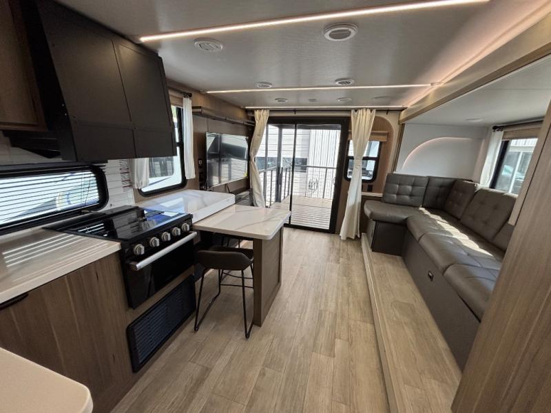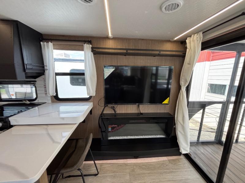 This travel trailer will feel more like home with its rear veranda/porch, dual entry doors, and front master bedroom! There is an outdoor kitchen on the back porch so you can make lunch in the fresh air, and the patio doors lead right into the main living area. Your crew can relax on the L-shaped sofa across from the fireplace, which will make your space more cozy. The U-shaped kitchen counter includes a pull-out table for even more counter space, and the walk-thru bath is easily accessible for everyone to use. You will love having your own space in the master bedroom, and the Versa-Tilt custom king bed will let you sit up in bed to read your book at night. One of the dual entry doors is also found here for added convenience!