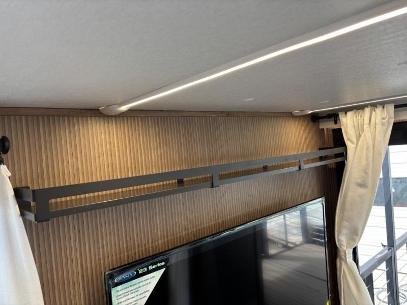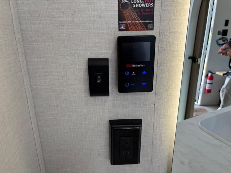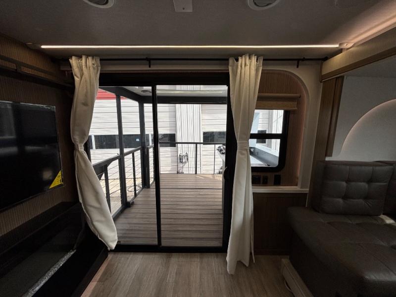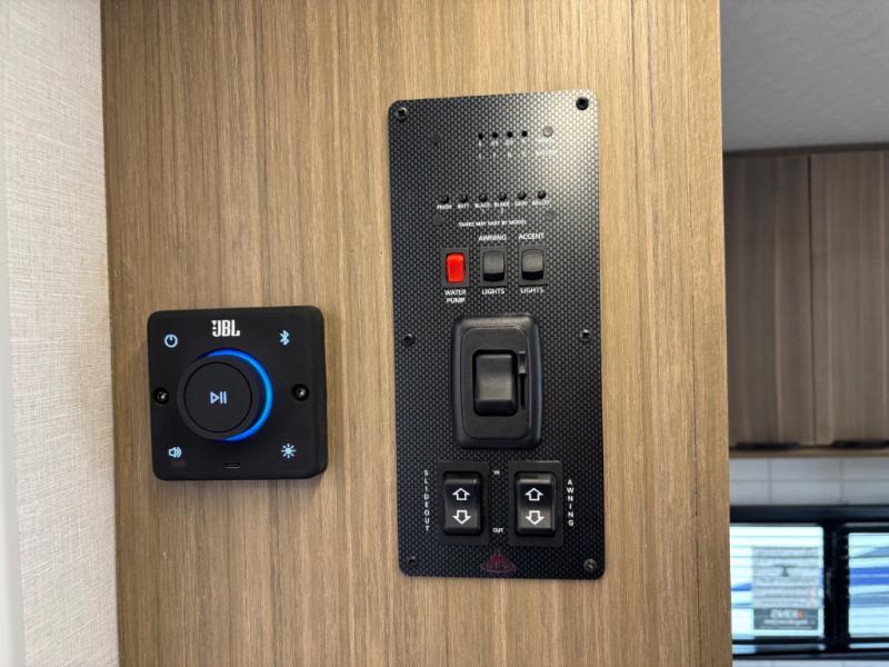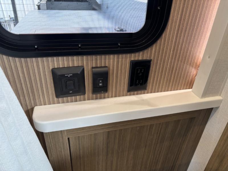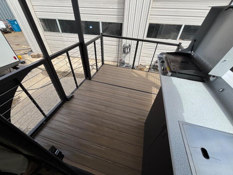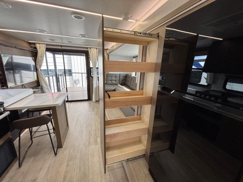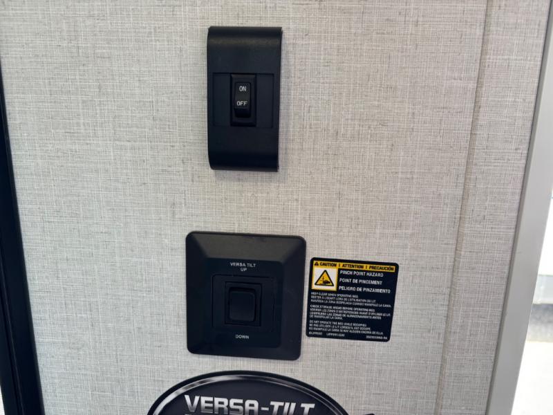 This travel trailer will feel more like home with its rear veranda/porch, dual entry doors, and front master bedroom! There is an outdoor kitchen on the back porch so you can make lunch in the fresh air, and the patio doors lead right into the main living area. Your crew can relax on the L-shaped sofa across from the fireplace, which will make your space more cozy. The U-shaped kitchen counter includes a pull-out table for even more counter space, and the walk-thru bath is easily accessible for everyone to use. You will love having your own space in the master bedroom, and the Versa-Tilt custom king bed will let you sit up in bed to read your book at night. One of the dual entry doors is also found here for added convenience!