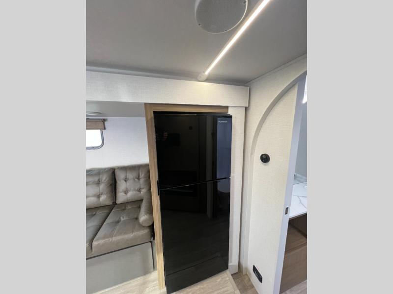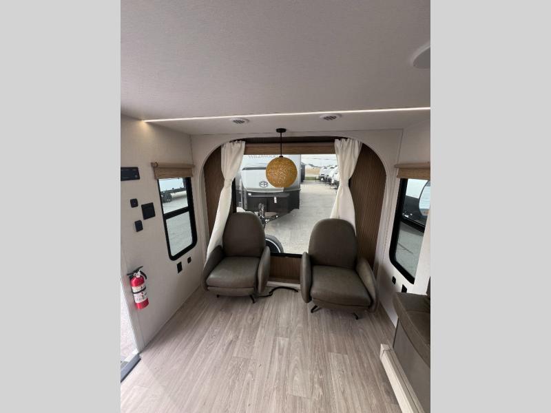 Comfort comes easy in this spacious travel trailer for three to four! The rear living area includes dual lounge chairs and a picture window so you can sit with your coffee and book in the morning. Once the chef of your crew has made breakfast in the fully equipped kitchen, you can dine at the booth dinette or take your plate outdoors under the awning. There is also a Versa-Lounge beside the dinette for more seating spaces. An entertainment center with a fireplace will make your space cozier, and you'll appreciate the hidden pantry behind for dry goods, movies, games and more! The walk-thru bath leads to the master bedroom where you'll find a walk-around Versa-Tilt custom king bed, a bedroom closet, and overhead storage so everything has a place!