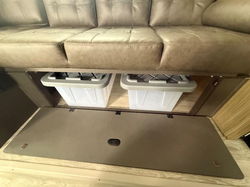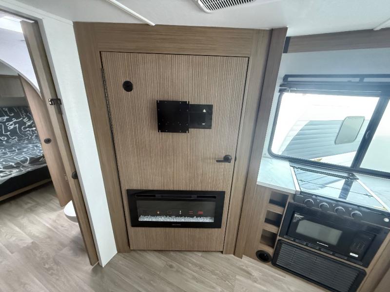 Comfort comes easy in this spacious travel trailer for three to four! The rear living area includes dual lounge chairs and a picture window so you can sit with your coffee and book in the morning. Once the chef of your crew has made breakfast in the fully equipped kitchen, you can dine at the booth dinette or take your plate outdoors under the awning. There is also a Versa-Lounge beside the dinette for more seating spaces. An entertainment center with a fireplace will make your space cozier, and you'll appreciate the hidden pantry behind for dry goods, movies, games and more! The walk-thru bath leads to the master bedroom where you'll find a walk-around Versa-Tilt custom king bed, a bedroom closet, and overhead storage so everything has a place!