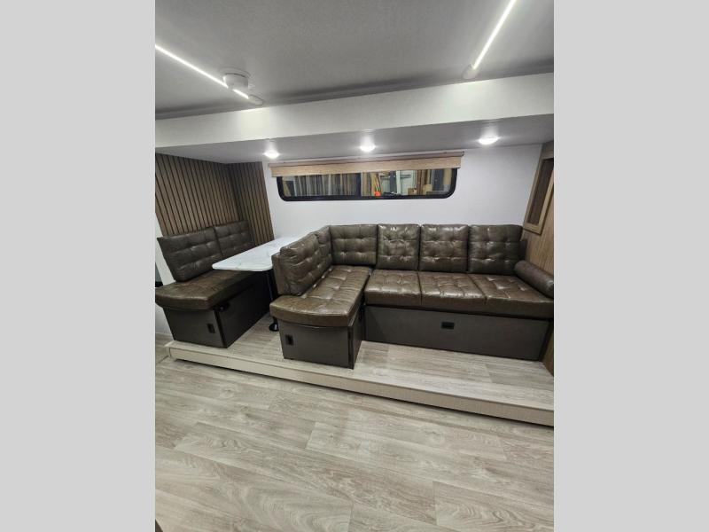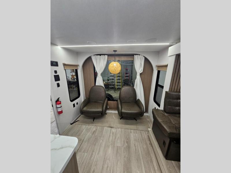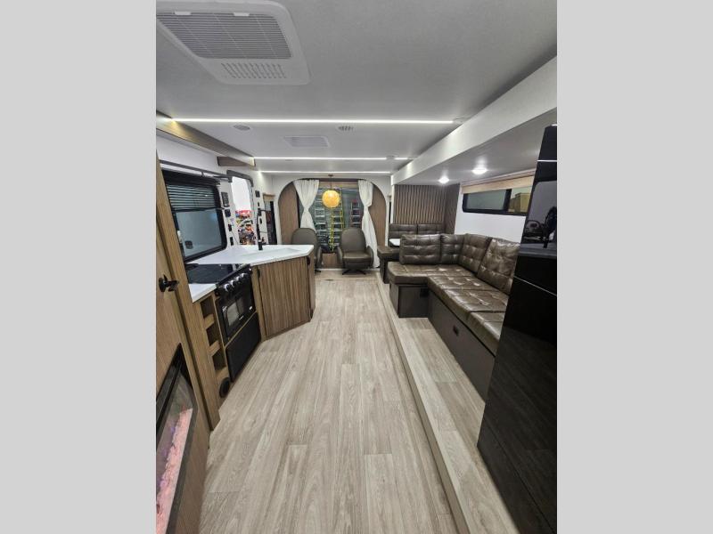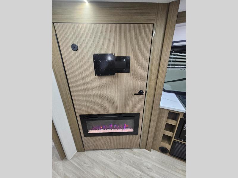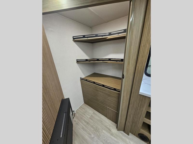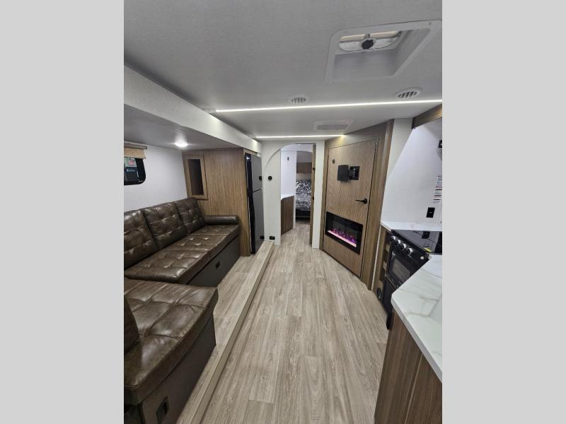 Comfort comes easy in this spacious travel trailer for three to four! The rear living area includes dual lounge chairs and a picture window so you can sit with your coffee and book in the morning. Once the chef of your crew has made breakfast in the fully equipped kitchen, you can dine at the booth dinette or take your plate outdoors under the awning. There is also a Versa-Lounge beside the dinette for more seating spaces. An entertainment center with a fireplace will make your space cozier, and you'll appreciate the hidden pantry behind for dry goods, movies, games and more! The walk-thru bath leads to the master bedroom where you'll find a walk-around Versa-Tilt custom king bed, a bedroom closet, and overhead storage so everything has a place!