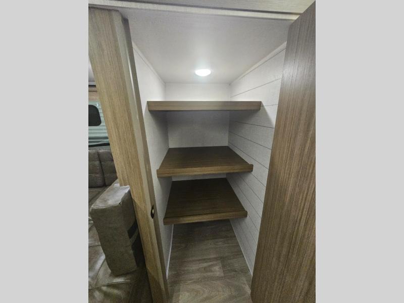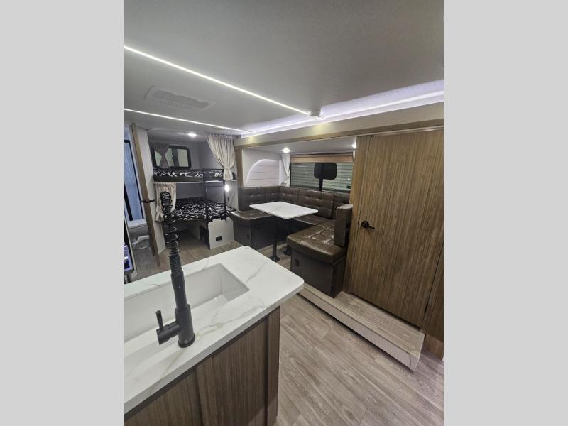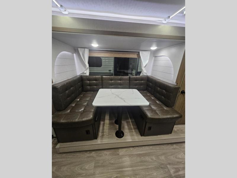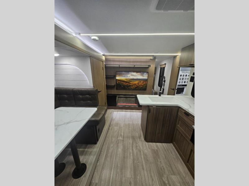 The double-size bunks pack a lot of extra sleeping space into this Wildwood X-Lite travel trailer! Some of the other comfortable features that you will find are the U-shaped dinette that has panoramic windows surrounding it, the entertainment center with an electric fireplace below, the private bedroom with a custom king bed with Versa Tilt, and the walk-in pantry that will make it easy to grab your spices and snacks. There is also a full bath with a walk-in shower plus a fully equipped kitchen, allowing you to make your best meals. Outside, you'll have an 18' awning that provides a protected area to relax and enjoy nature and a full pass-thru storage for all your camp gear!