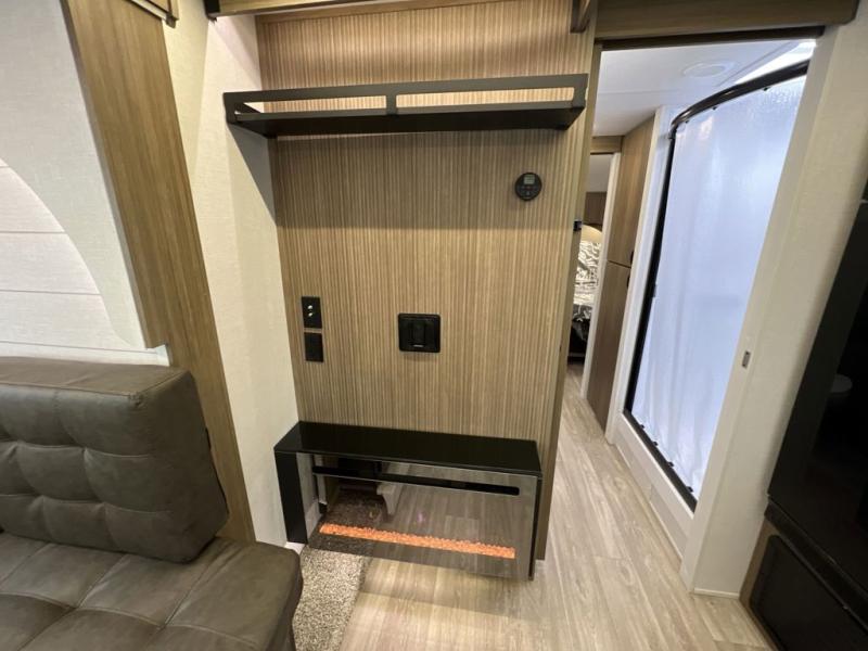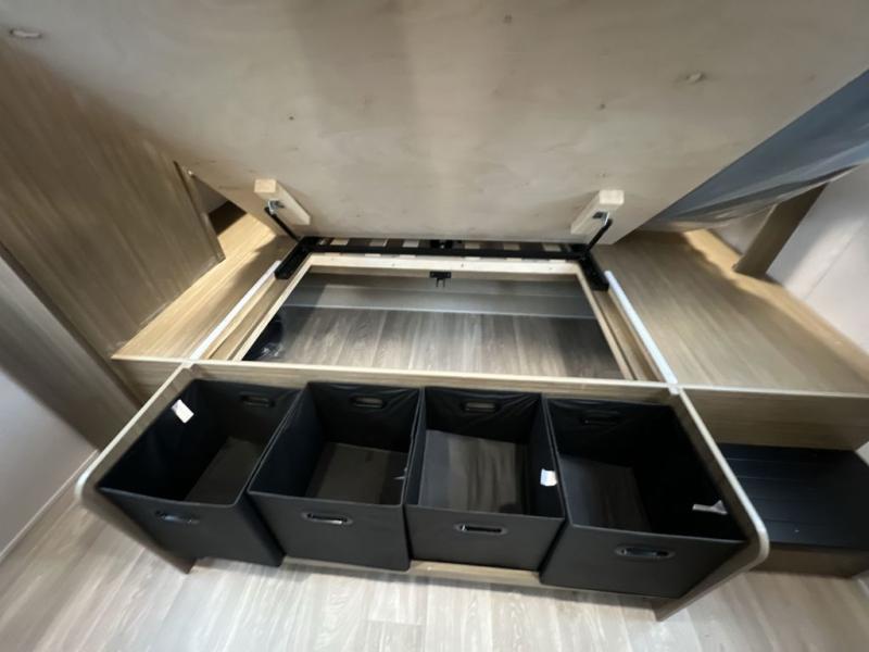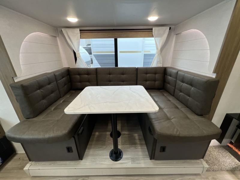 Whether it's a family vacation or a romantic getaway with your significant other, this Wildwood X-Lite travel trailer will make it the very best! The master bedroom has many places to store items with the walk-in closet and bedside closet plus the overhead cabinet, and the walk-through bath also provides additional storage with a linen closet and vanity. There is also a custom king bed with Versa-Tilt you are sure to enjoy. The kitchen has modern amenities, like the spacious refrigerator and double sink, plus the U-shaped dinette has panoramic windows that surround it to create an inviting space to spend your time. And you will enjoy the protection from the 16' patio awning!