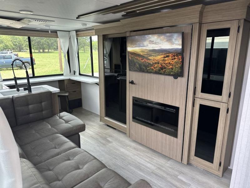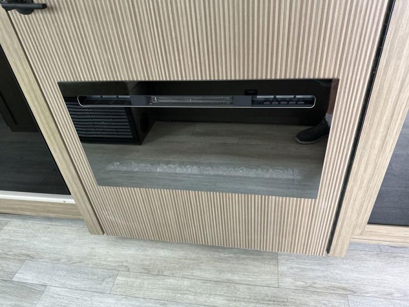 Enjoy your surroundings with plenty of windows in this spacious travel trailer. The rear kitchen features a wrap-around counter space including a double sink and cook-top with an overhead microwave oven. There are bar stools for dining inside along the rear counter, and an L-shaped chaise lounge for additional seating in the open living area. Here, behind the entertainment center, is a multi-purpose space hidden behind the wall insert with a fireplace including a hinged top mattress above a lower bunk, a desk beneath the mattress if you need office space during the day, along with storage cubbies for your things. All of this is within the Versa-Slide that also houses an oversized refrigerator for all of your perishables. The front private bedroom features a custom king bed with Versa-Tilt with a closet for clothes, plus overhead storage for books. This unit also includes an exterior camp kitchen for a sunrise breakfast!