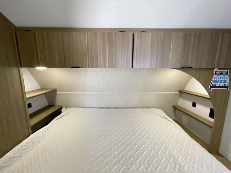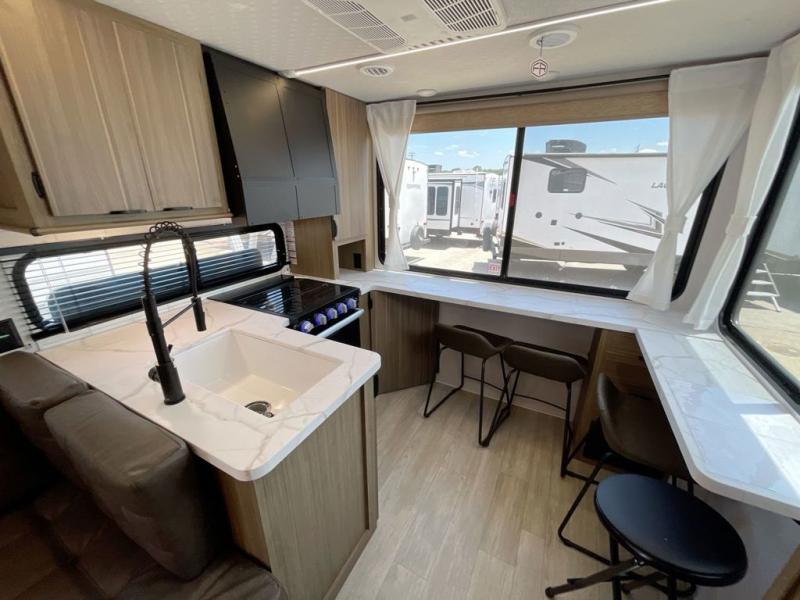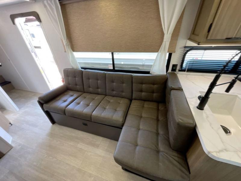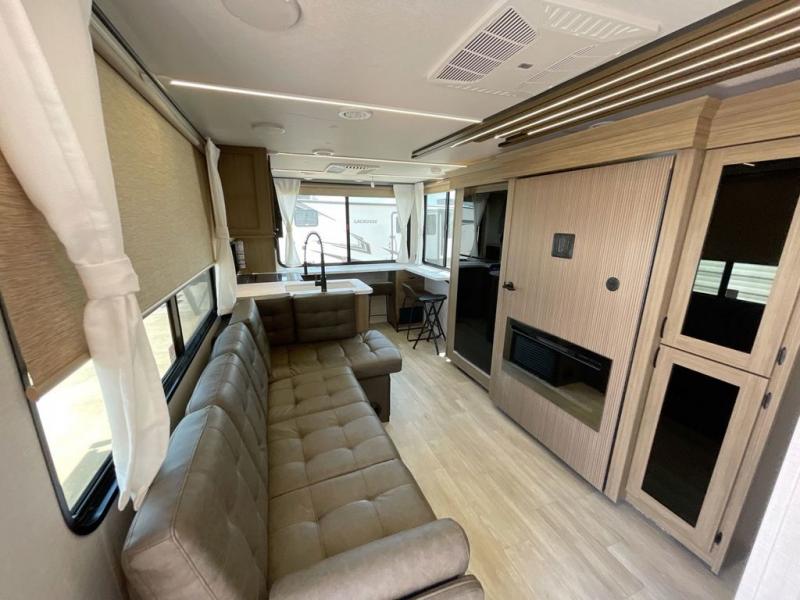 Enjoy your surroundings with plenty of windows in this spacious travel trailer. The rear kitchen features a wrap-around counter space including a double sink and cook-top with an overhead microwave oven. There are bar stools for dining inside along the rear counter, and an L-shaped chaise lounge for additional seating in the open living area. Here, behind the entertainment center, is a multi-purpose space hidden behind the wall insert with a fireplace including a hinged top mattress above a lower bunk, a desk beneath the mattress if you need office space during the day, along with storage cubbies for your things. All of this is within the Versa-Slide that also houses an oversized refrigerator for all of your perishables. The front private bedroom features a custom king bed with Versa-Tilt with a closet for clothes, plus overhead storage for books. This unit also includes an exterior camp kitchen for a sunrise breakfast!