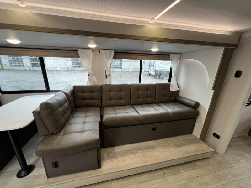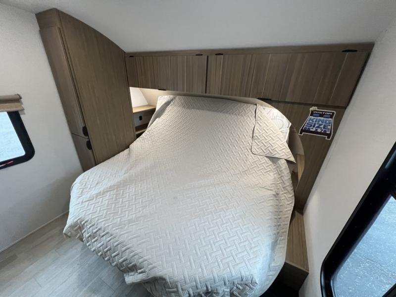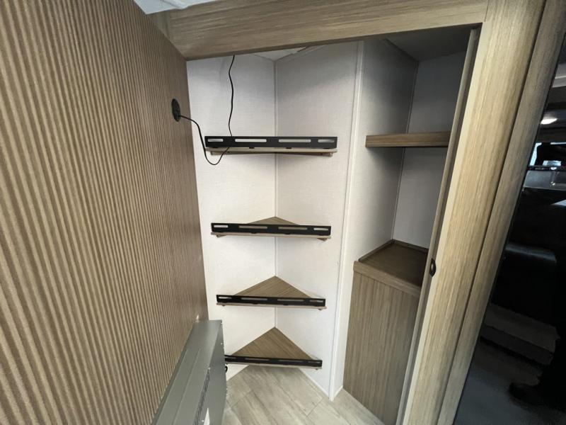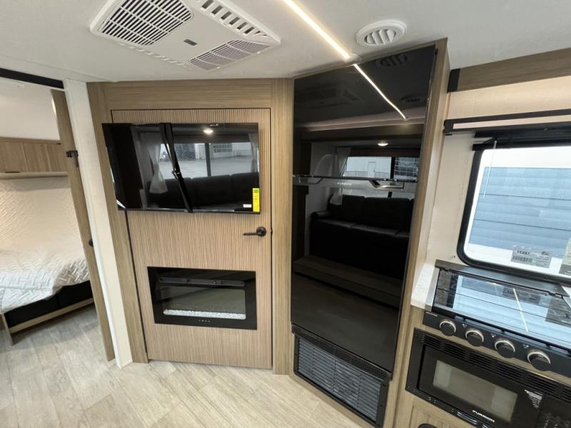 You're sure to make camping memories in this spacious travel trailer! You can sleep four to five people each night thanks to the the custom king bed with Versa Tilt in the front bedroom plus the Versa-Lounge and booth dinette within the large slide out! The full kitchen will let you make meals each day, and you'll appreciate the hidden pantry with shelves behind the fireplace. And don't overlook the full rear bath, complete with a tub/shower and ample counter space for your things.